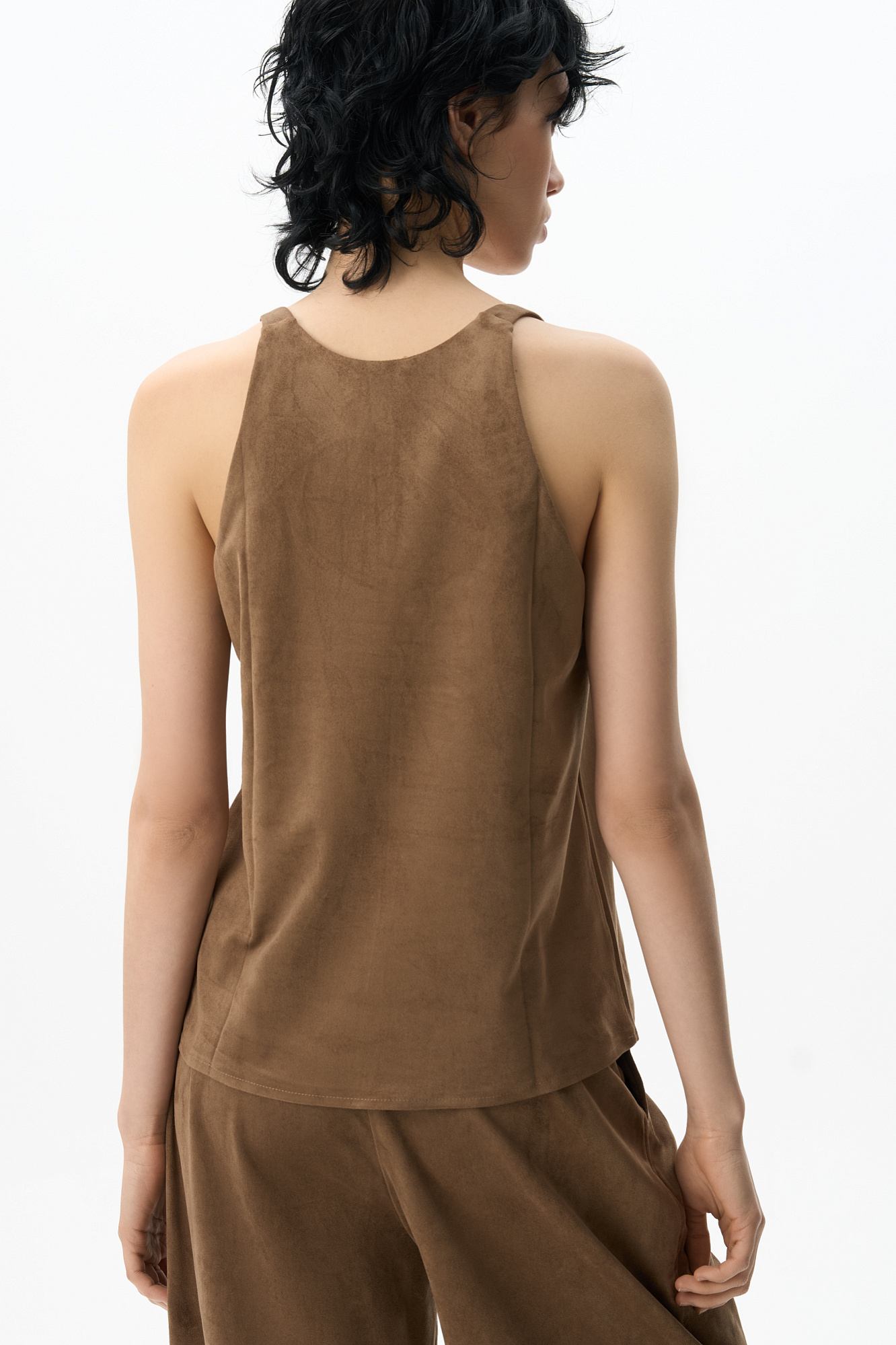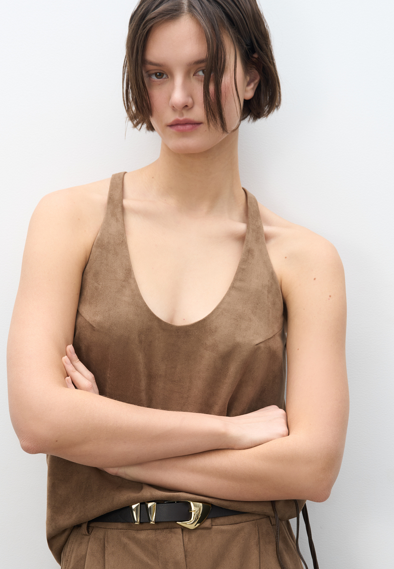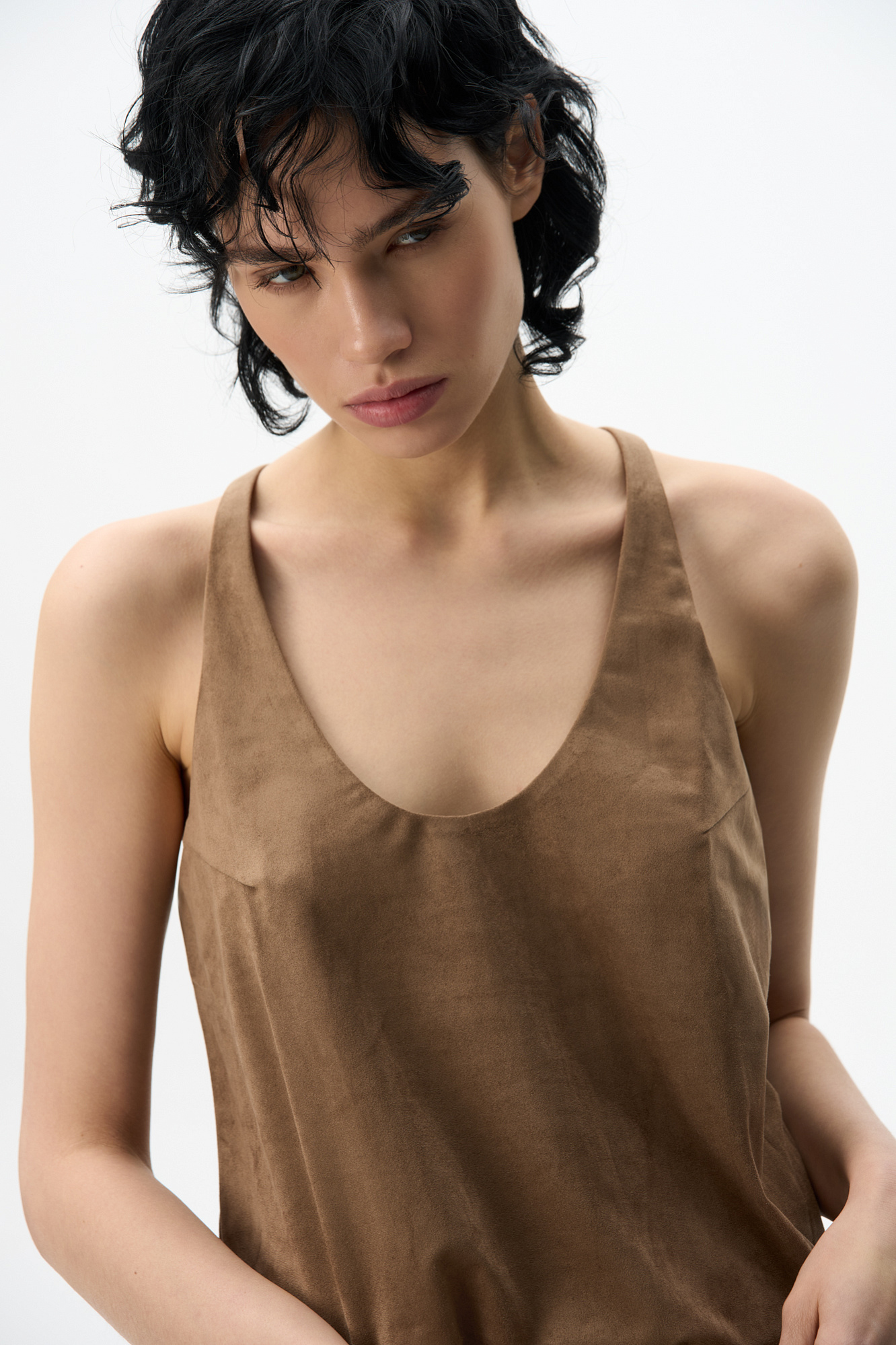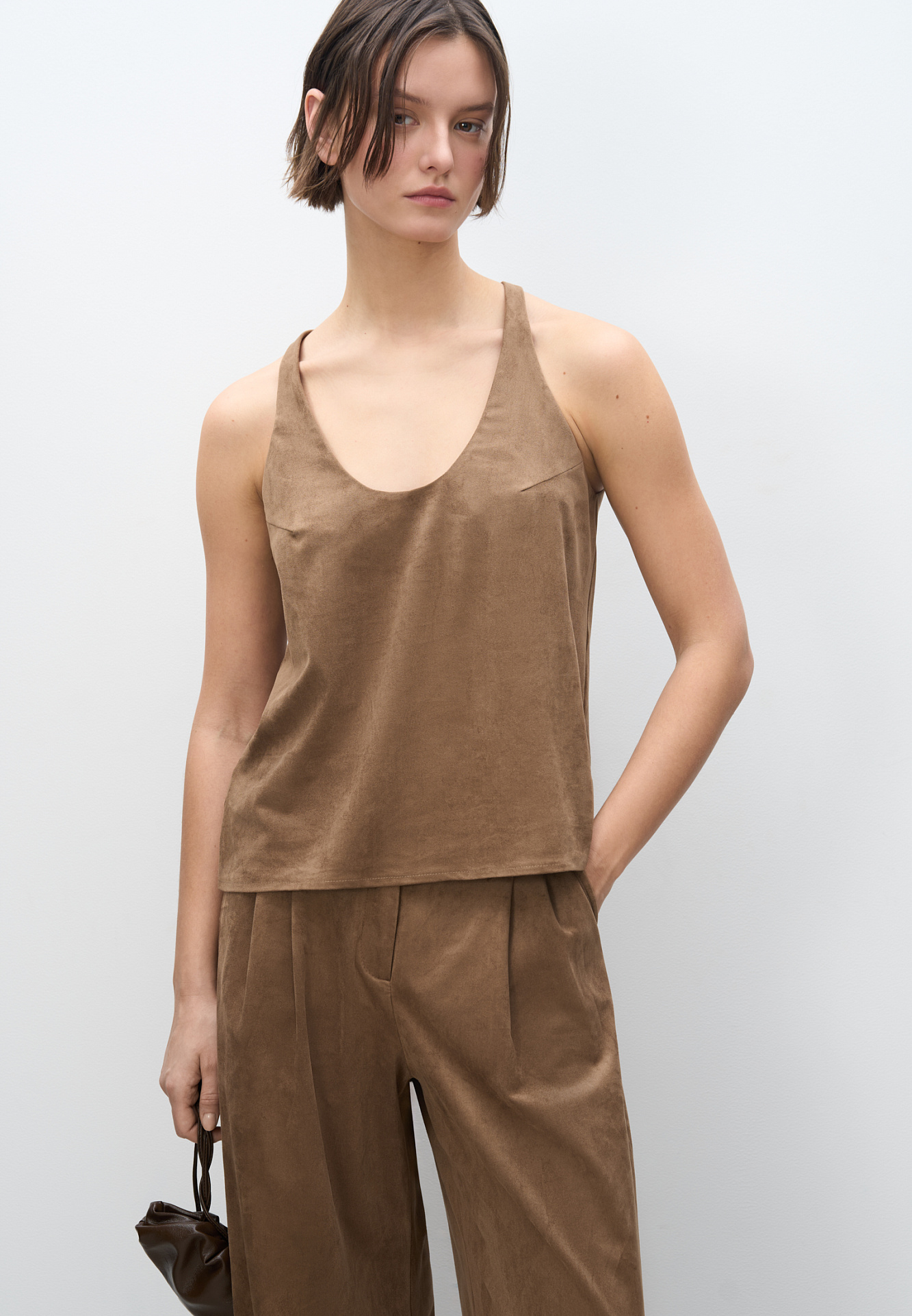 Топ из ткани с имитацией внешнего вида и свойств натуральной замши. Модель свободного силуэта на тонких бретельках и глубоким вырезом декольте.