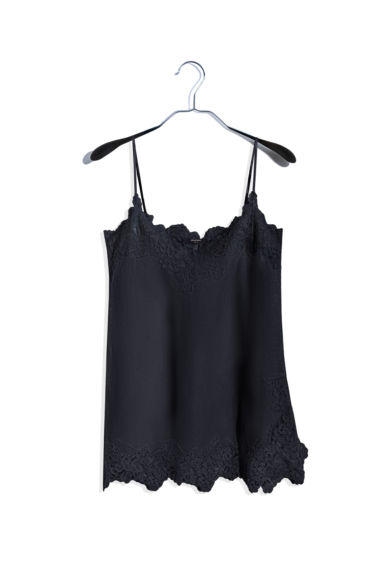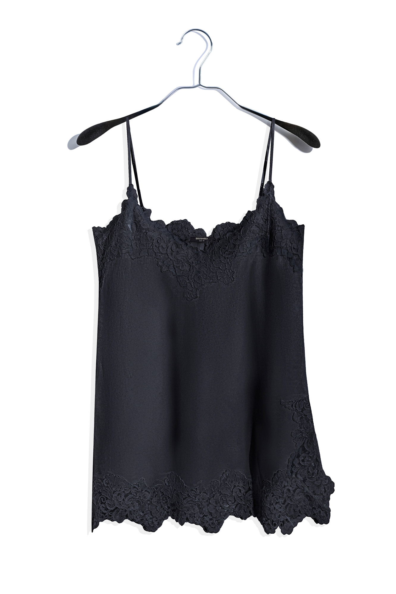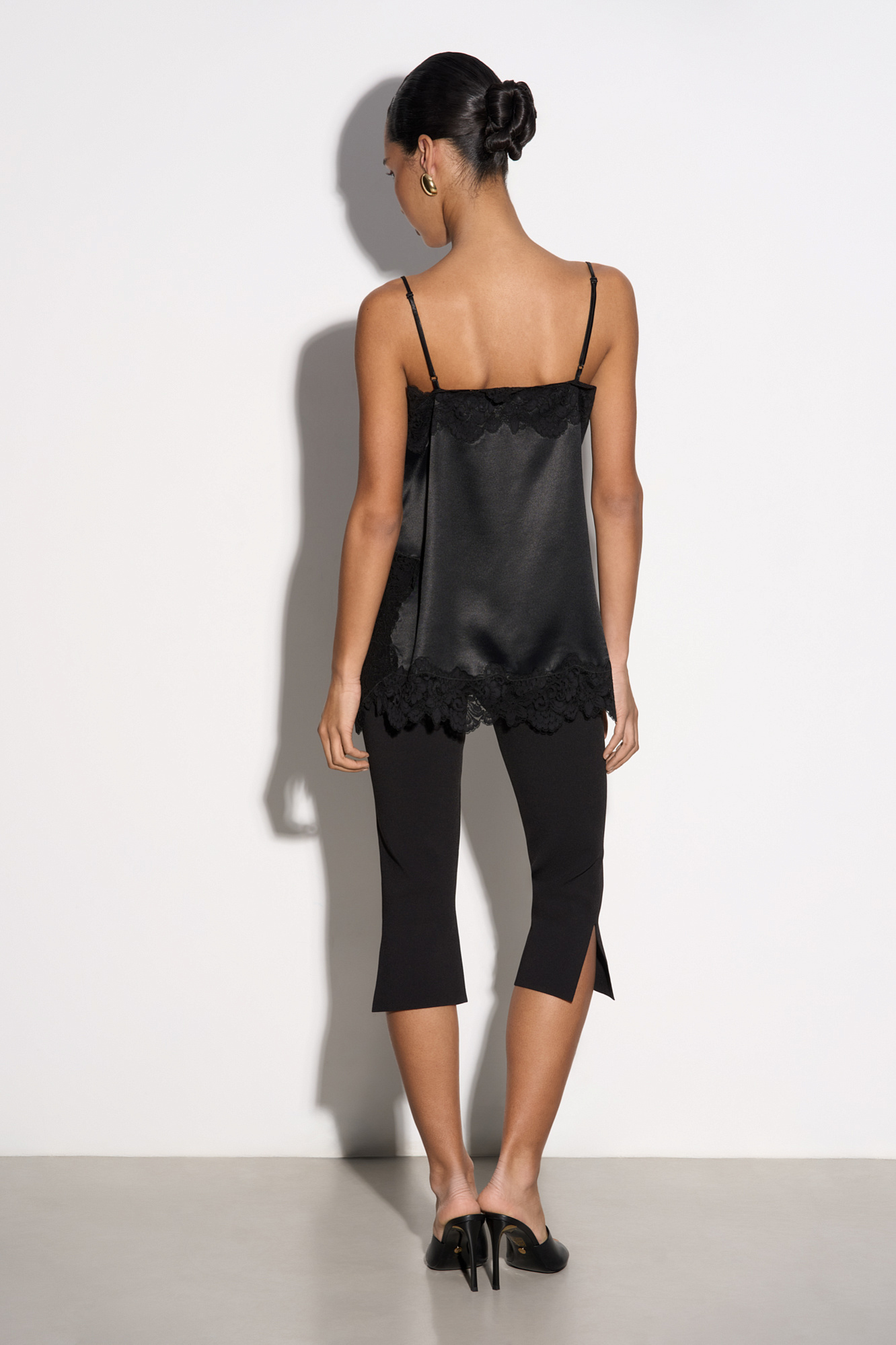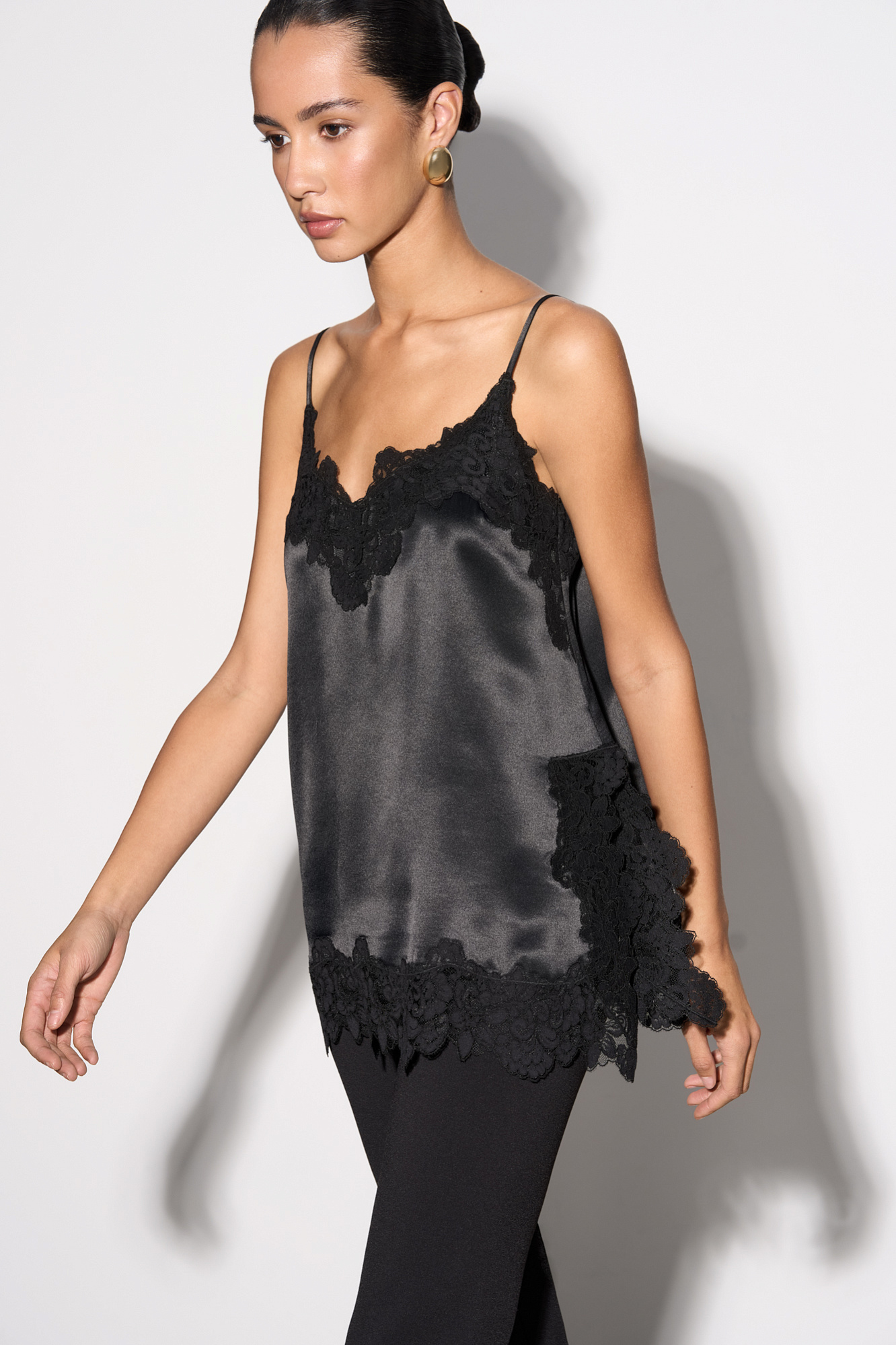 Топ из атласной вискозы, декорированный кружевом. Модель свободного силуэта на тонких бретельках.