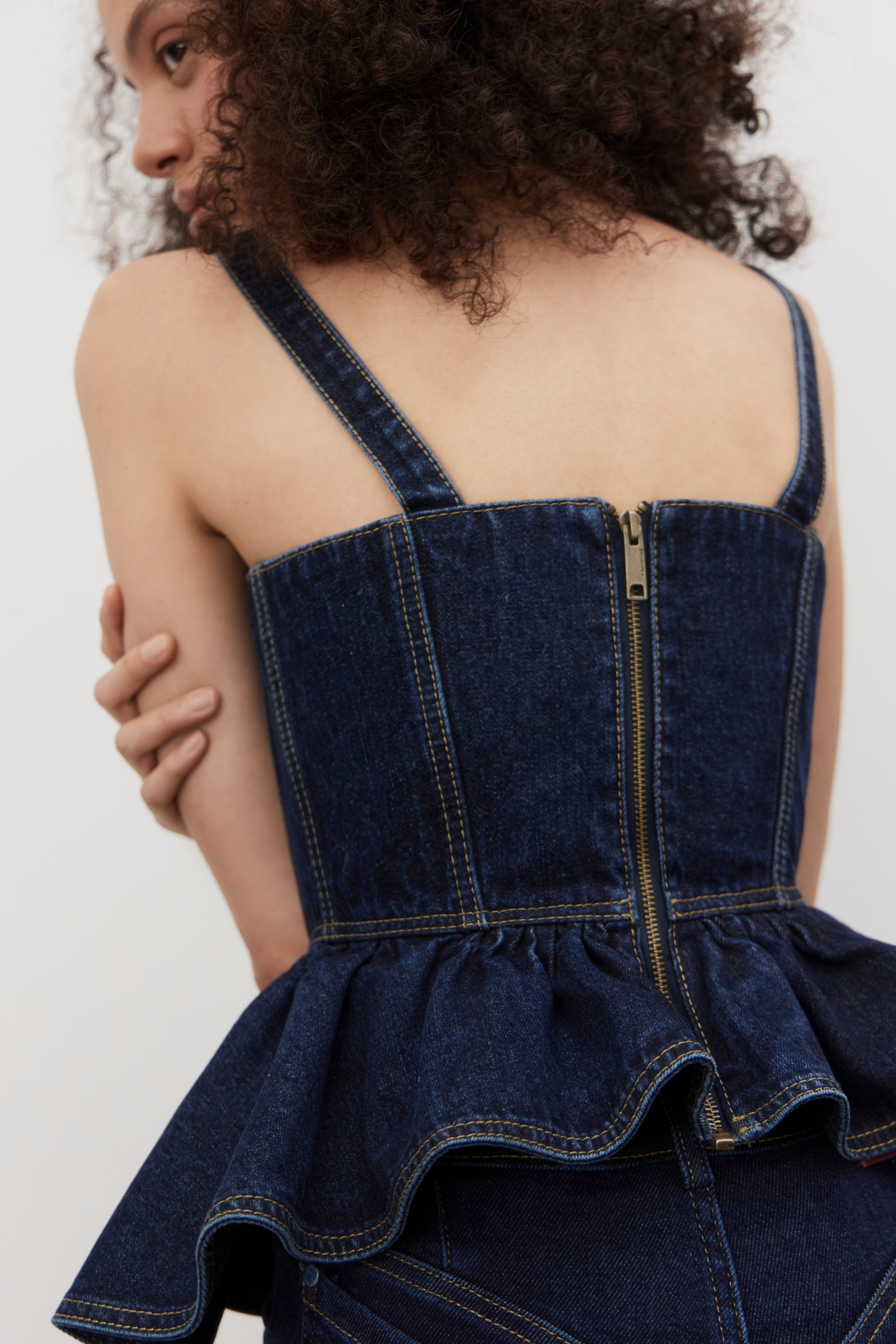 Джинсовый топ из 100% хлопка. Модель приталенного силуэта на широких бретельках, с фигурным лифом, акцентными строчками и баской. Застежка на молнию сзади.