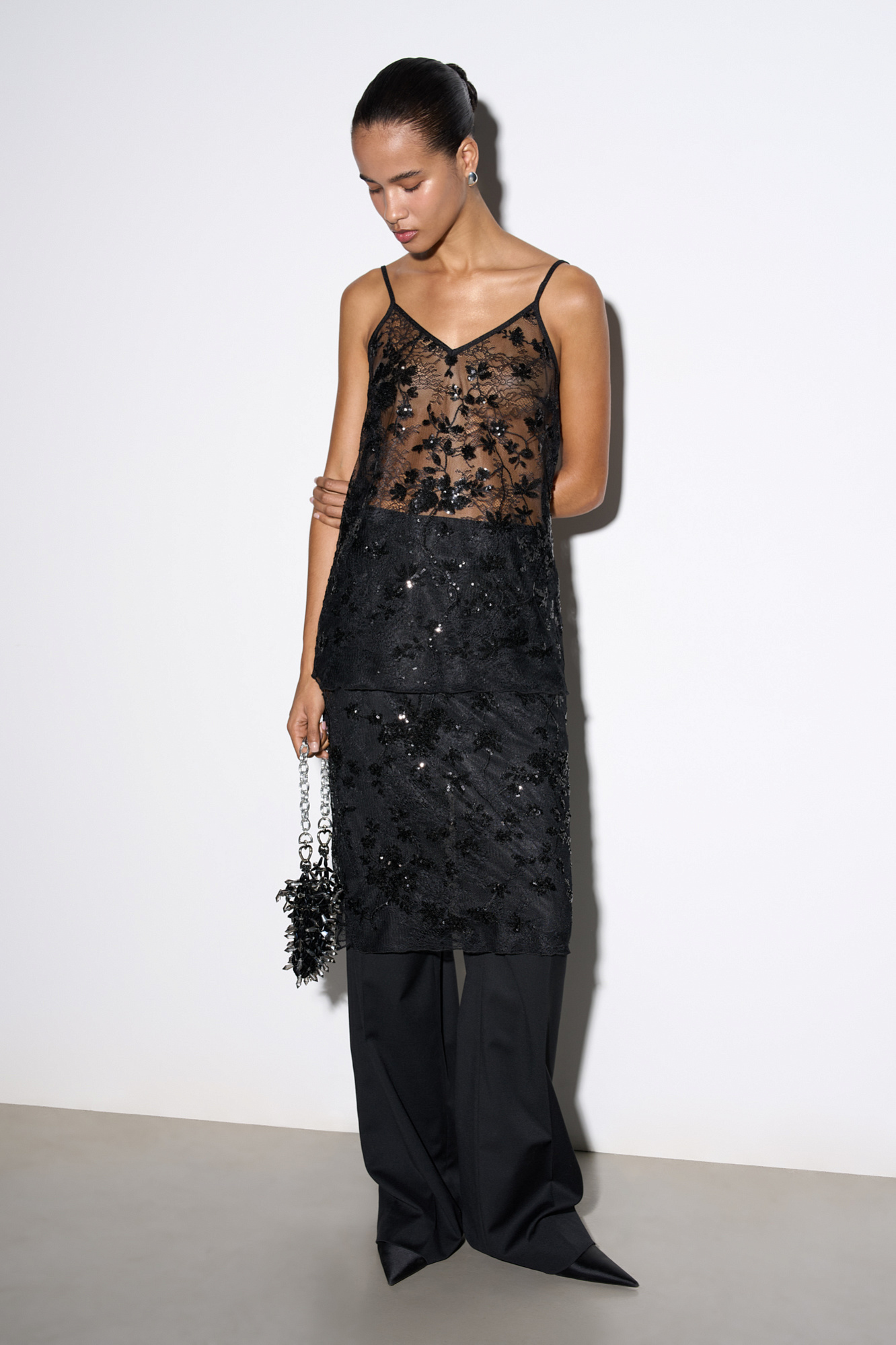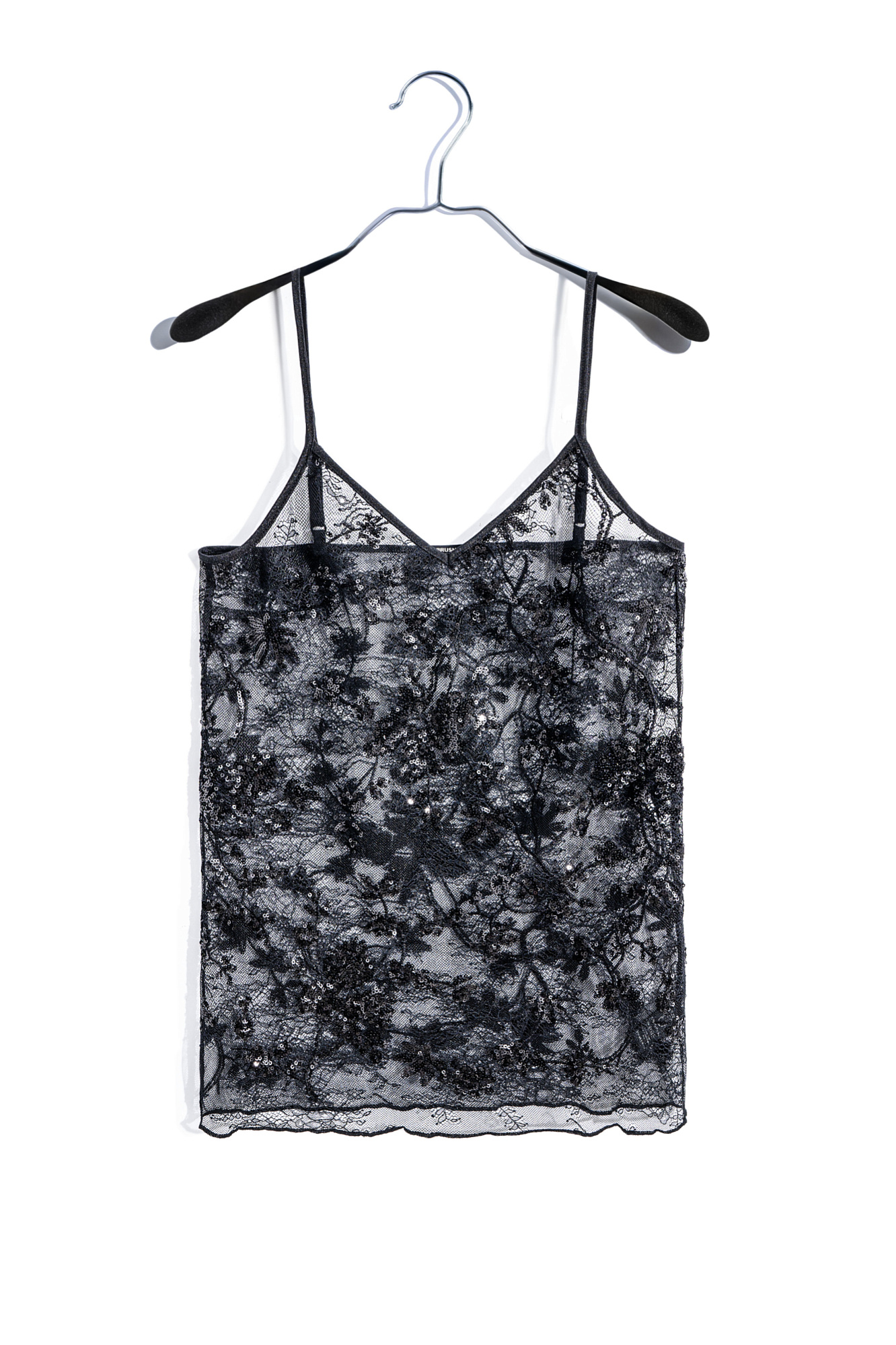 Кружевной топ с цветочным орнаментом, расшитый пайетками. Модель свободного силуэта на тонких регулируемых бретельках.