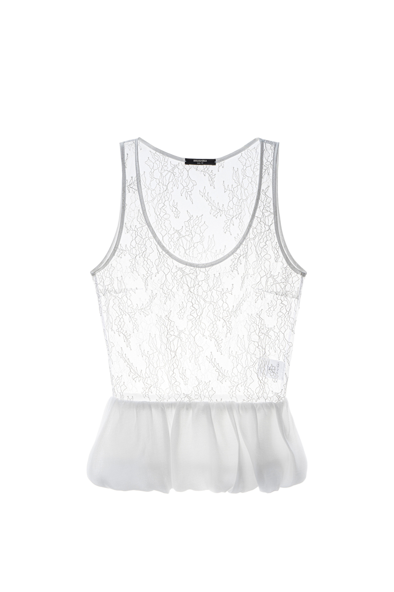 Кружевной топ с баской. Модель с глубоким U-вырезом на широких бретельках. Изделие без подкладки.