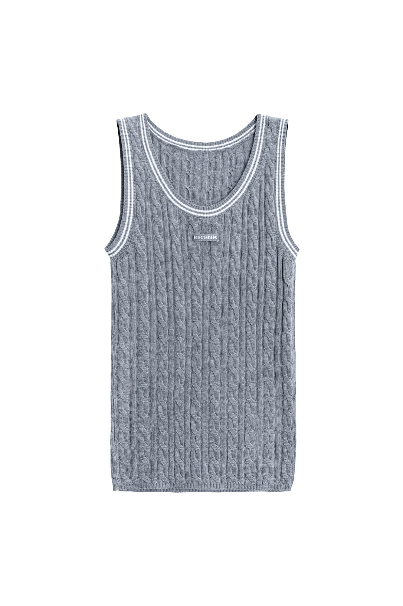 Трикотажная майка из шерсти. Модель свободного силуэта, без рукавов, на широких лямках, с круглым вырезом горловины и глубокой проймой. Изделие выполнено объемной вязкой косами и декорировано контрастным лампасом и логотипом бренда на груди.