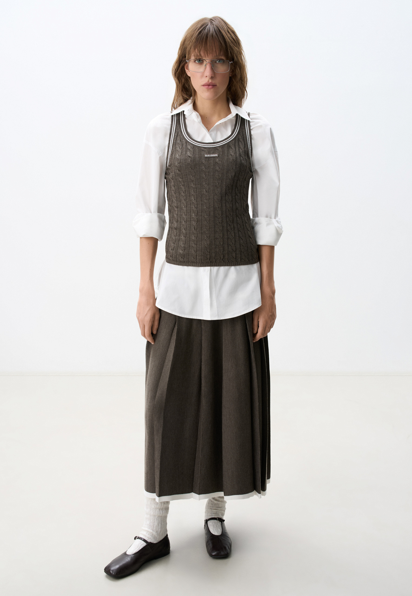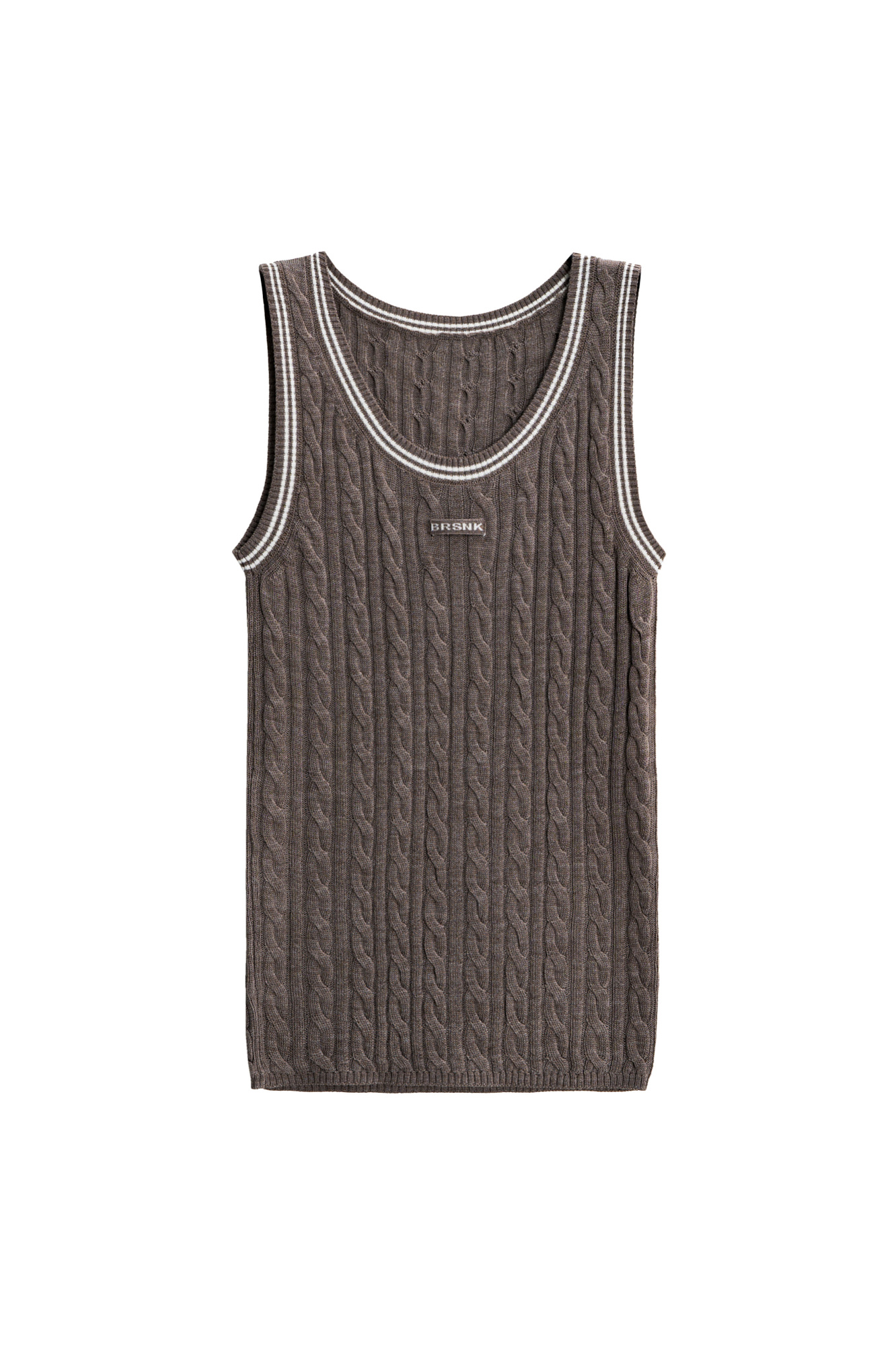 Трикотажная майка из шерсти. Модель свободного силуэта, без рукавов, на широких лямках, с круглым вырезом горловины и глубокой проймой. Изделие выполнено объемной вязкой косами и декорировано контрастным лампасом и логотипом бренда на груди.