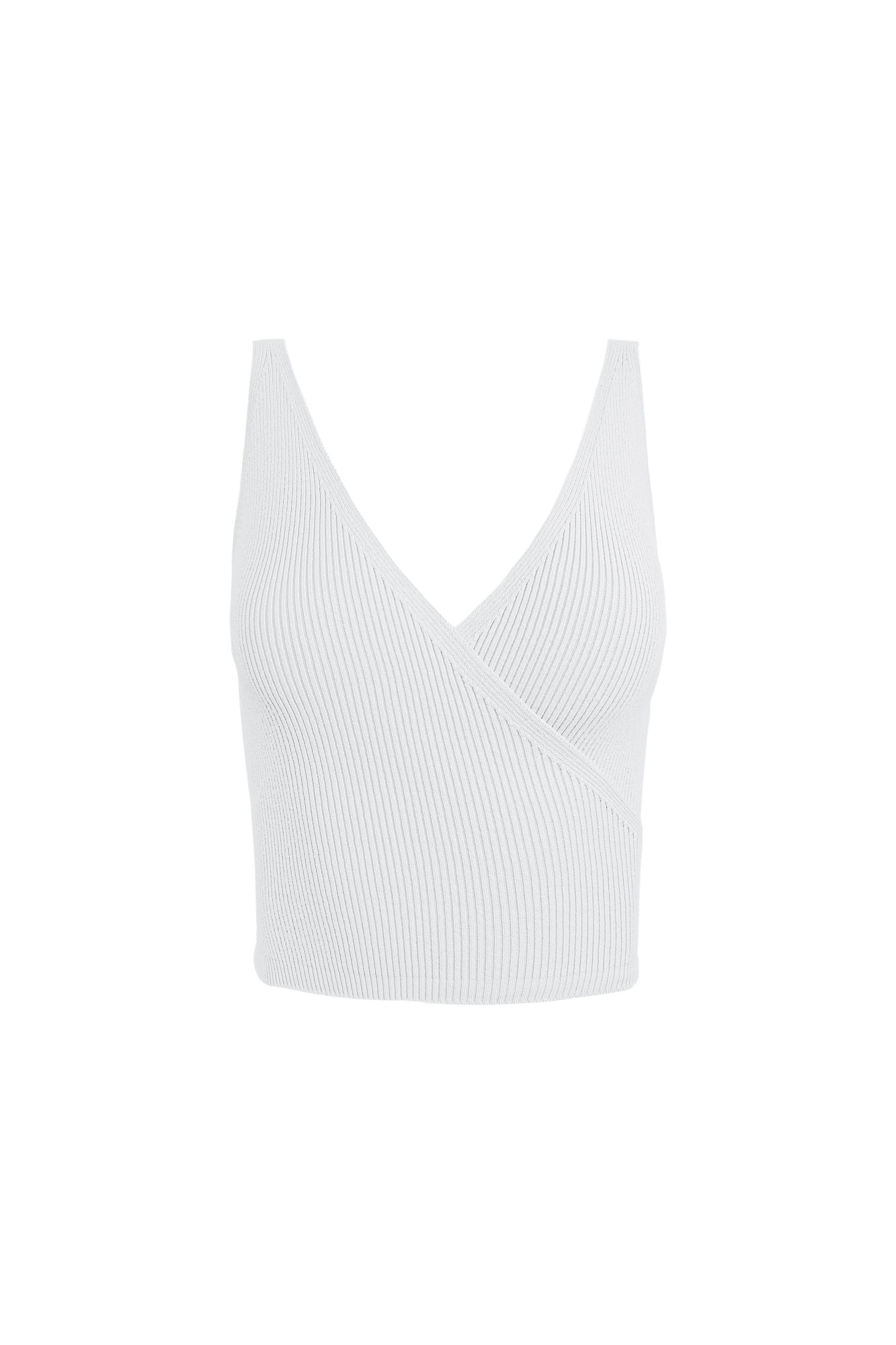 Трикотажный топ из вискозы. Модель приталенного силуэта с имитацией запаха. Изделие выполнено в рубчик.