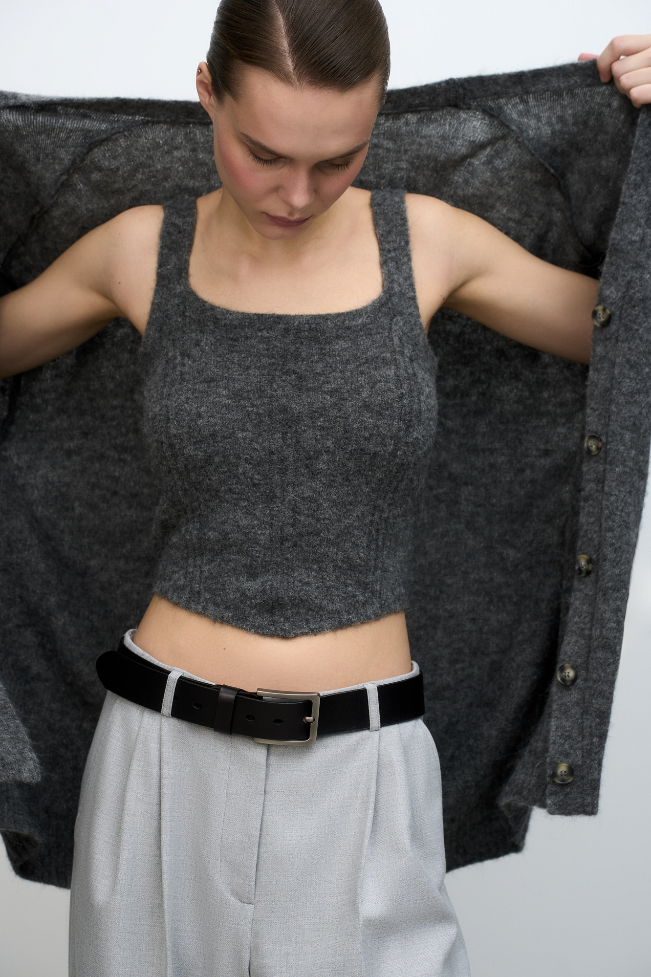 Трикотажный укороченный топ из шерсти альпака. Модель на бретелях. Дополнить образ можно кардиганом из того же материала.