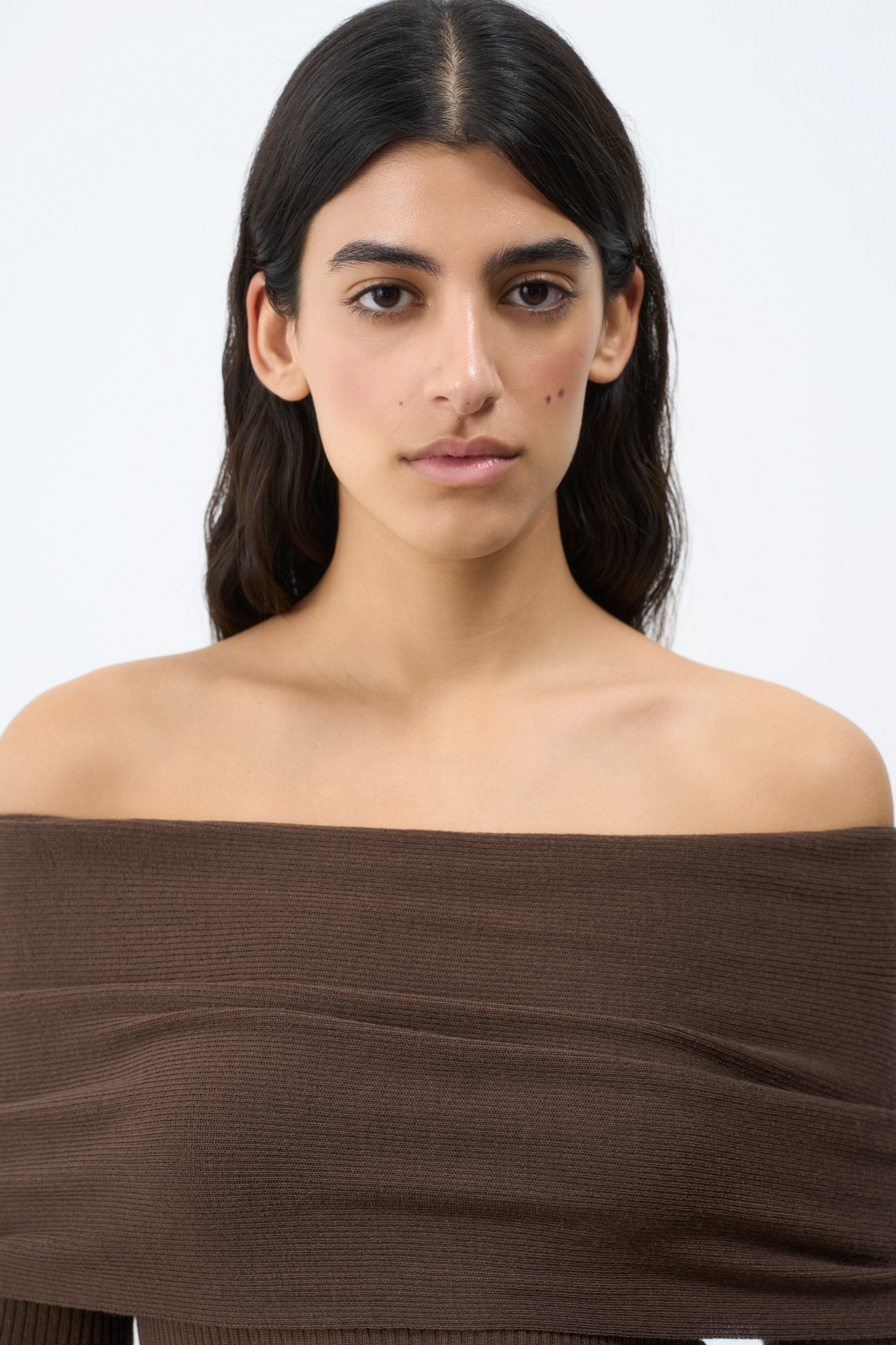 Трикотажный шерстяной топ с длинным рукавом и открытой линией плеч.