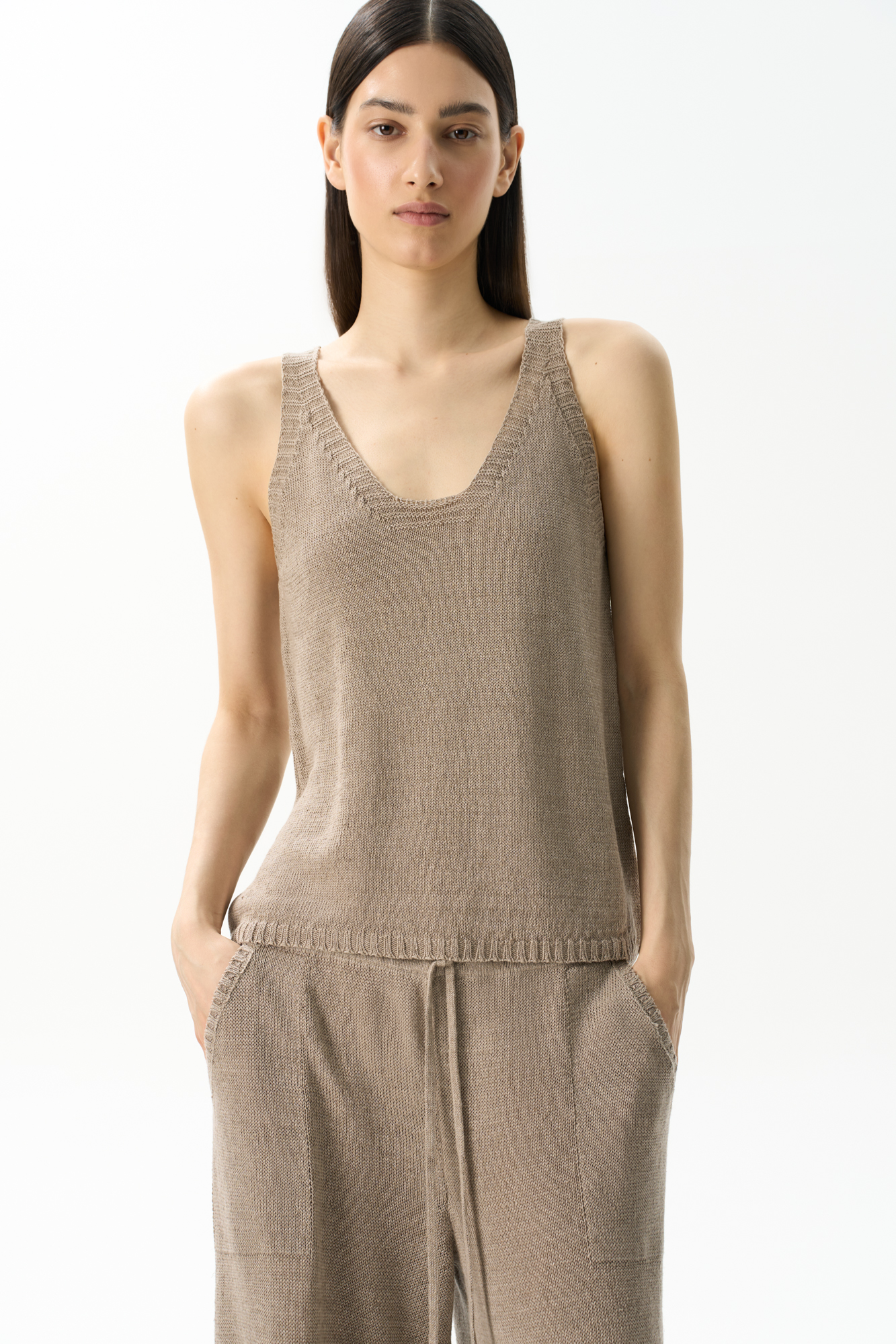 Трикотажный топ из 100% льна. Модель прямого кроя, на широких бретелях, с глубокой проймой и U-образным вырезом горловины. Края изделия выполнены в рубчик.