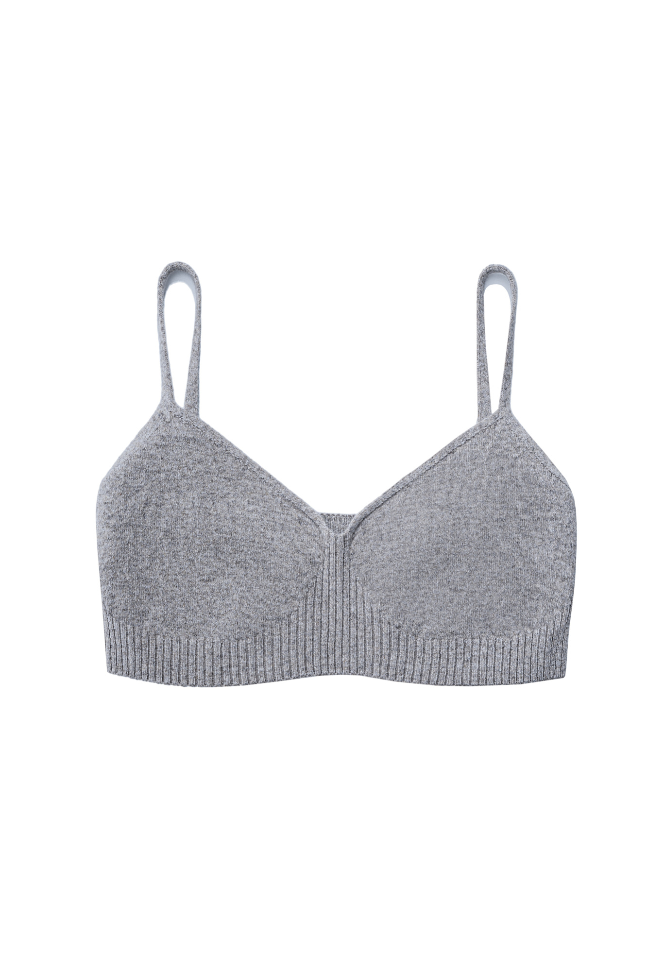 Базовый трикотажный топ, выполненный из кашемира и шерсти. Модель на тонких бретельках. вывязанными чашечками и эластичной резинкой в рубчик.