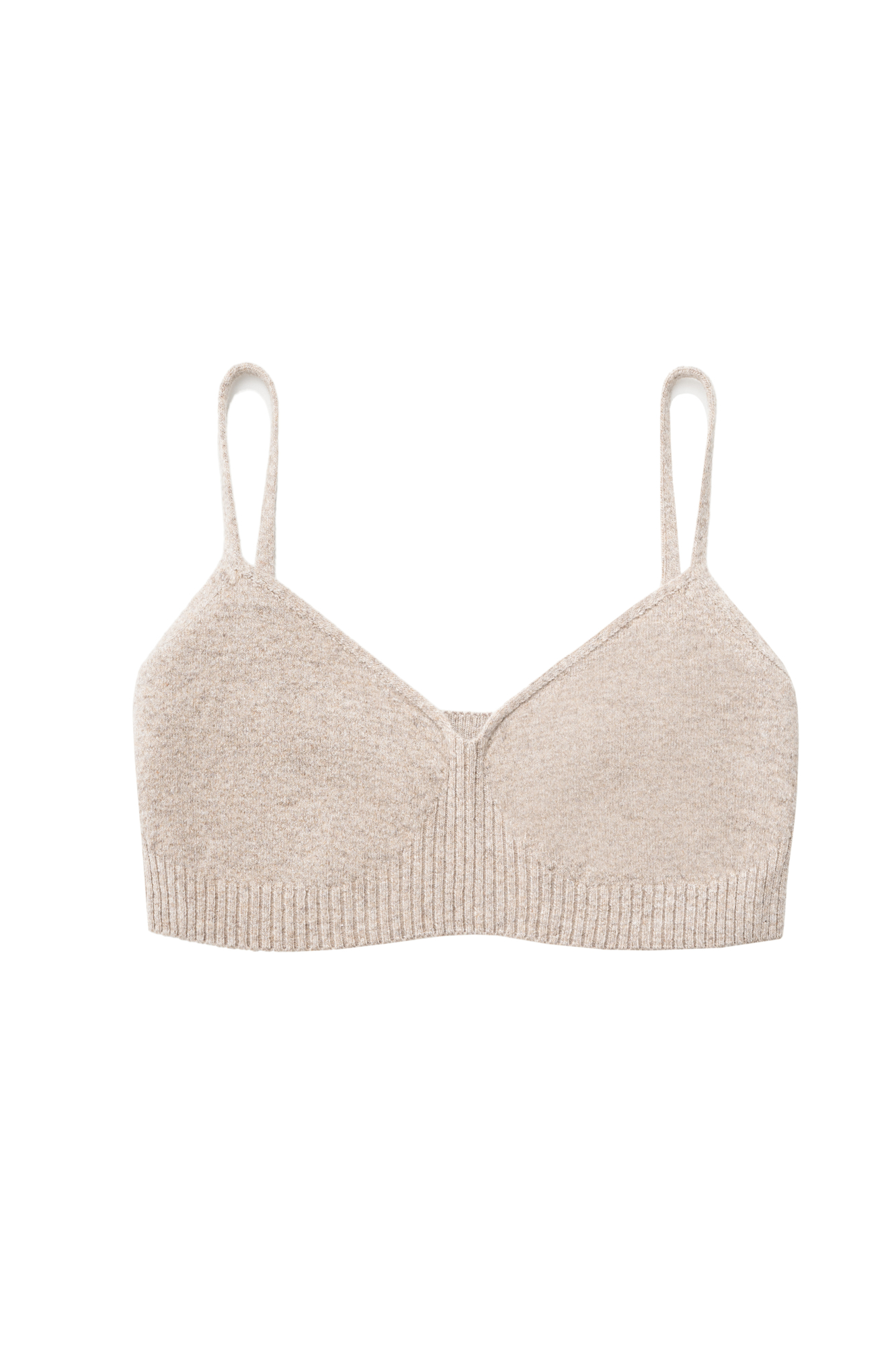 Базовый трикотажный топ, выполненный из кашемира и шерсти. Модель на тонких бретельках. вывязанными чашечками и эластичной резинкой в рубчик.