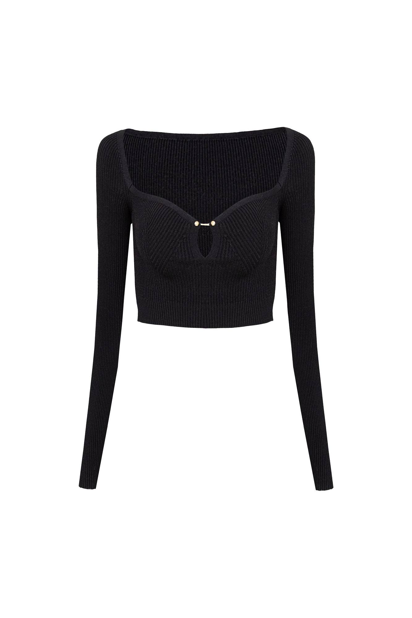 Трикотажный укороченный топ из вискозы в рубчик. Модель по фигуре с глубоким декольте и с декоративным элементом на лифе. Отлично сочетается с трикотажной юбкой из этой же коллекции.