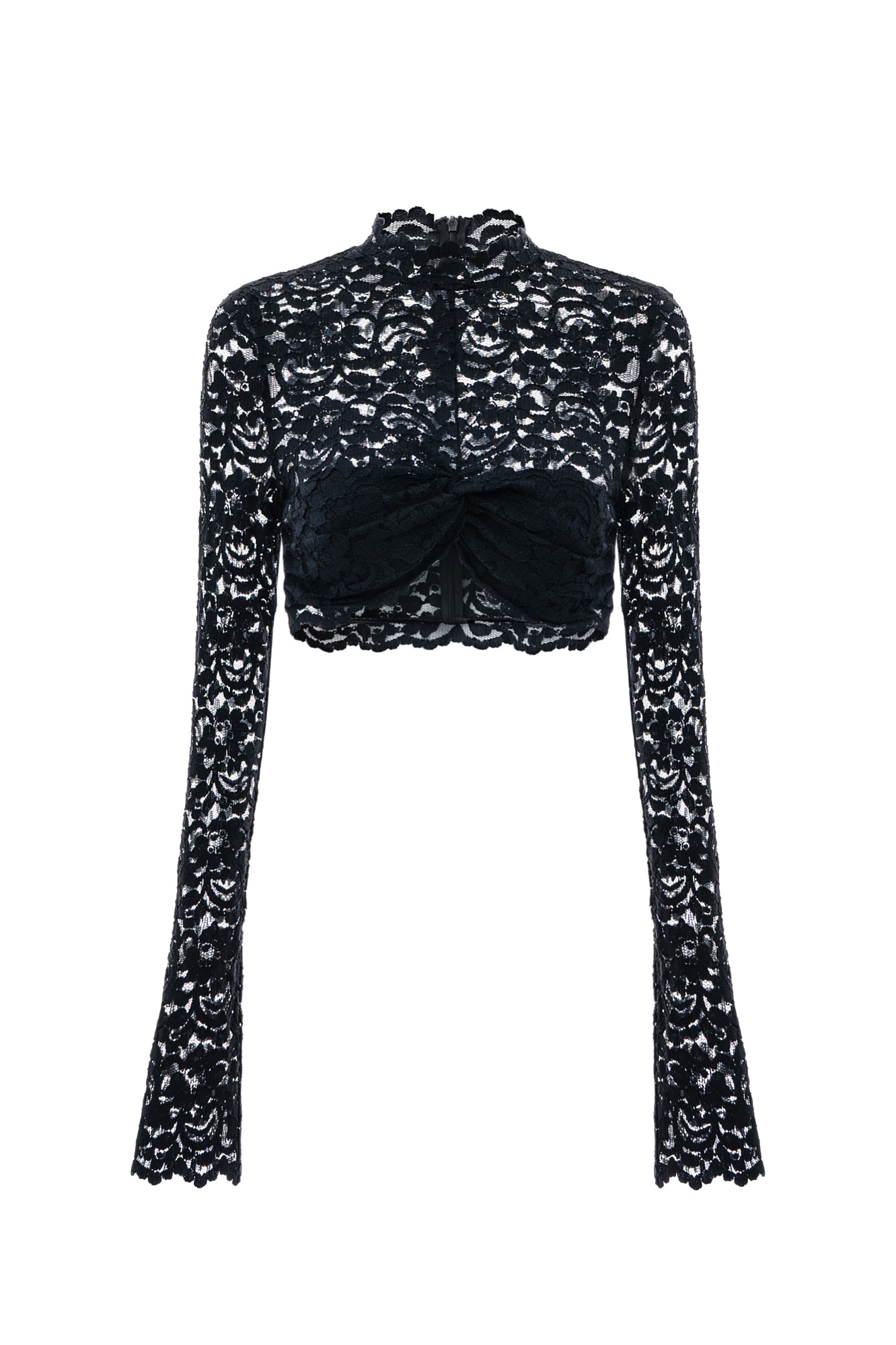 Полупрозрачный укороченный топ из итальянского кружева с несъемными чашечками. Модель с высокой горловиной и длинными рукавами. Застегивается на молнию по спинке изделия. Образ можно дополнить брюками в таком же стиле.