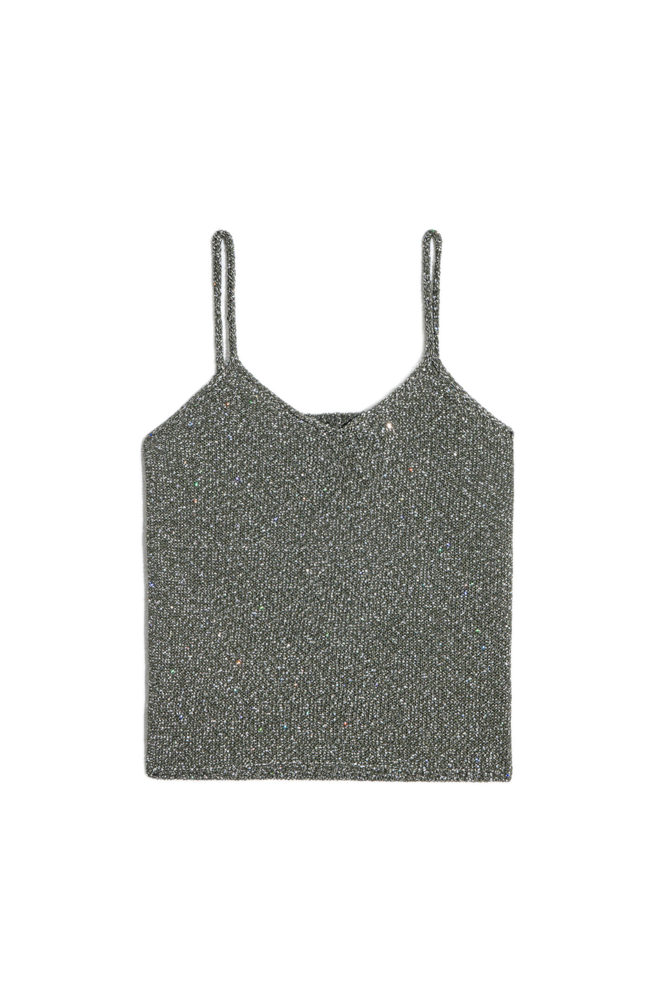 Трикотажный топ из поливискозы на тонких лямках с голографическими пайетками.