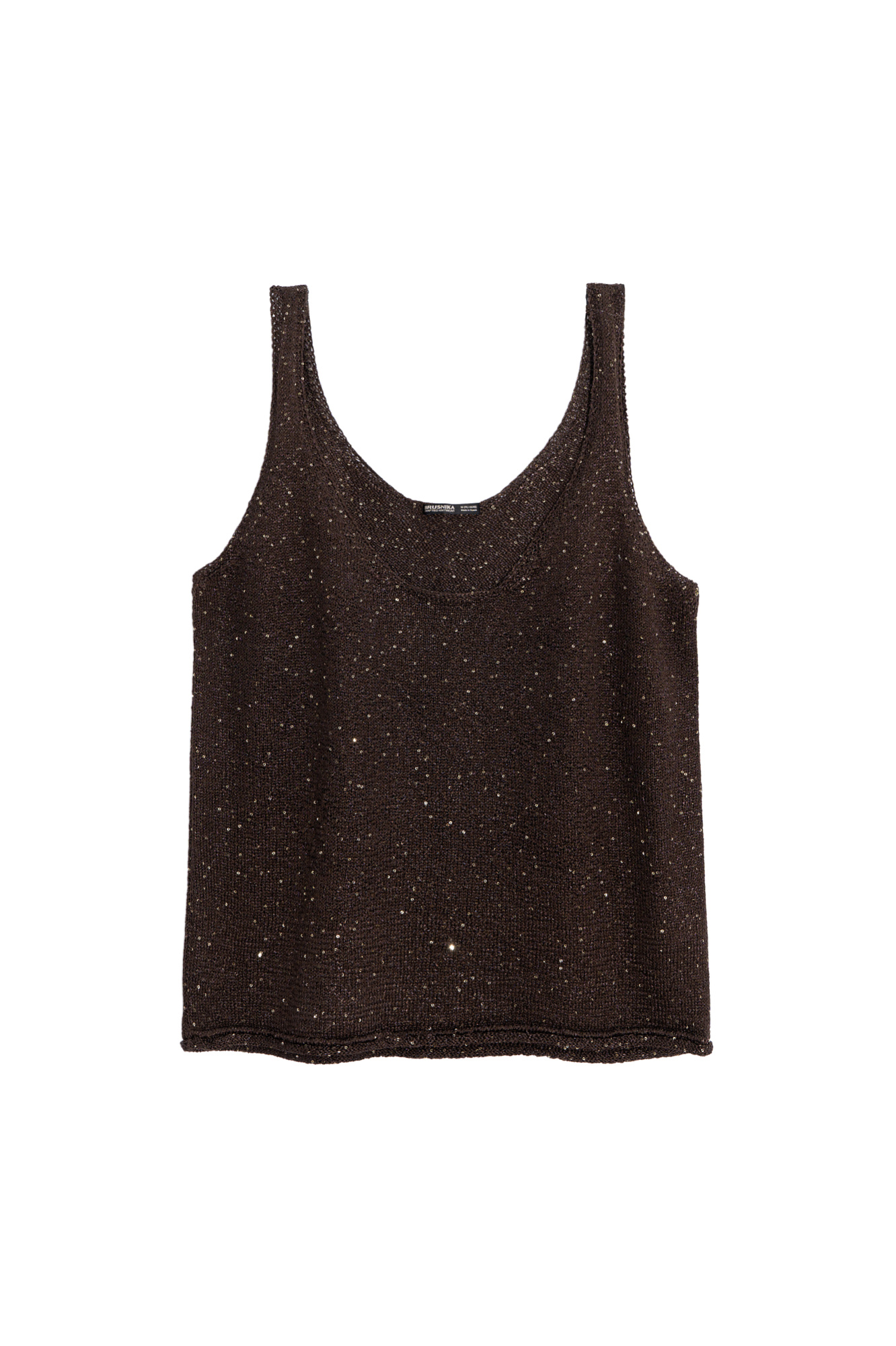 Трикотажный топ из хлопка с пайетками. Модель прямого кроя, на бретельках, с глубоким вырезом горловины.