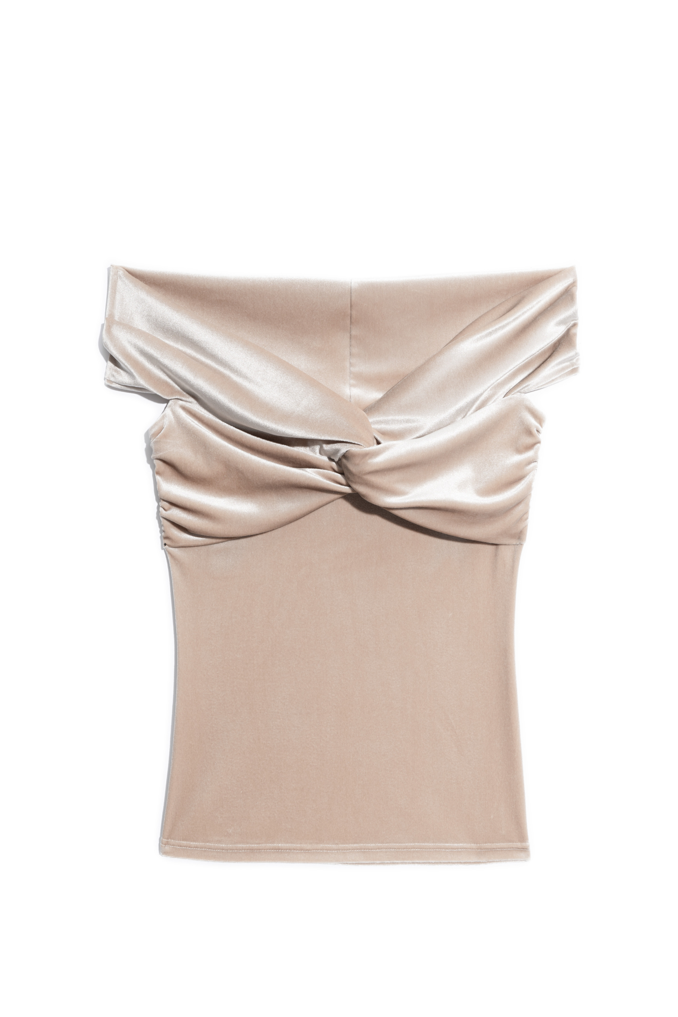 Бархатный топ из полиамида с добавлением вискозы. Модель приталенного силуэта, без рукавов, с открытой линией плеч. Изделие декорировано перекрутом на груди и драпировкой на лифе.