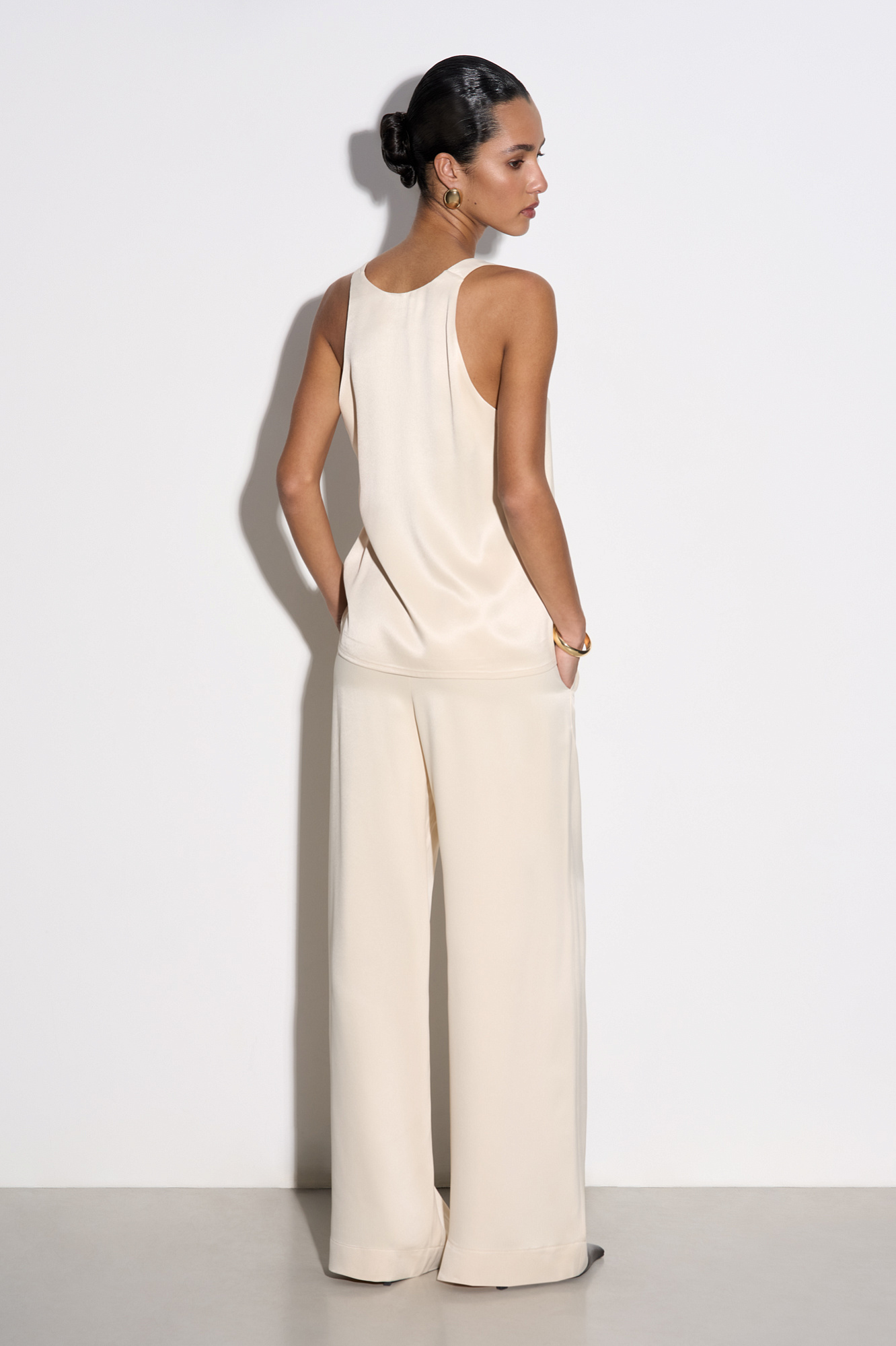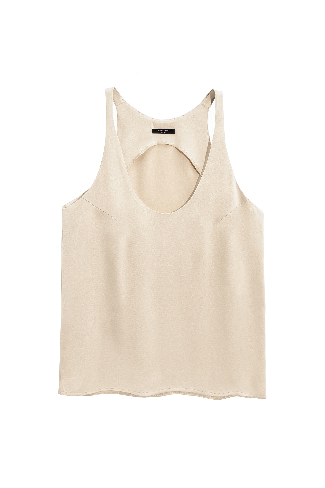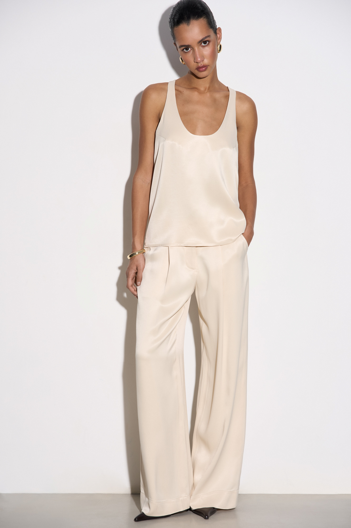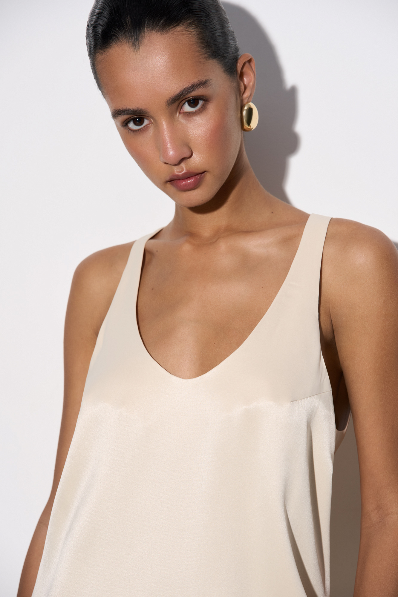 Майка из атласной вискозы. Модель свободного силуэта на тонких бретельках и глубоким вырезом декольте.