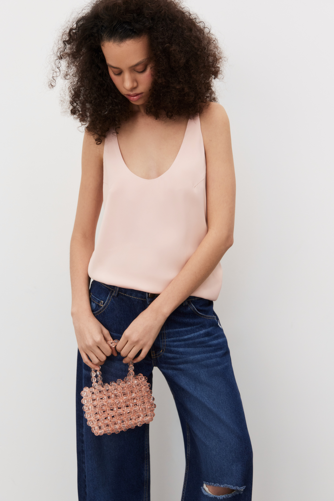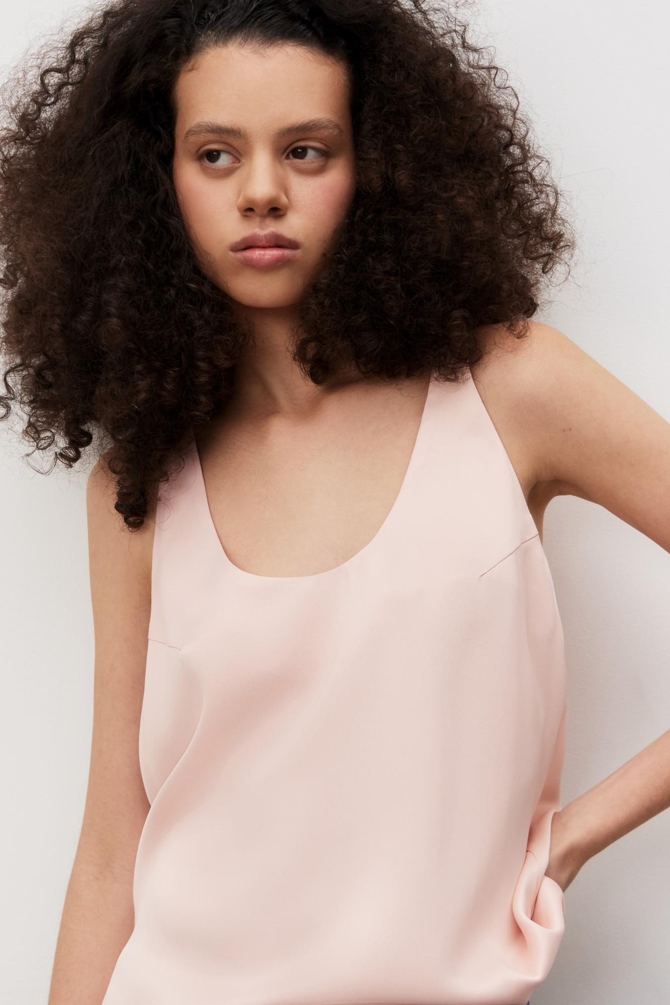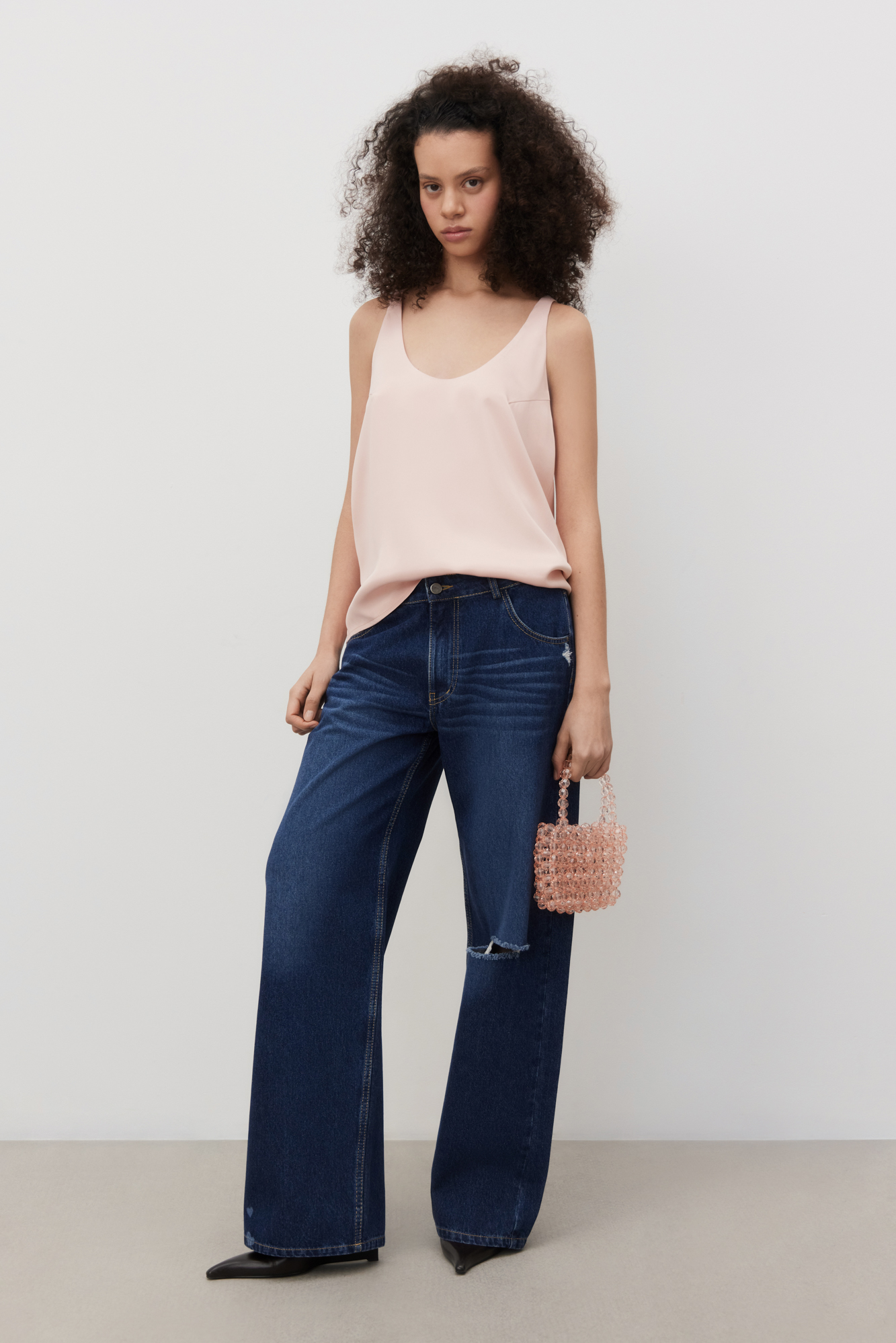 Майка из атласной вискозы. Модель свободного силуэта на тонких бретельках и глубоким вырезом декольте.