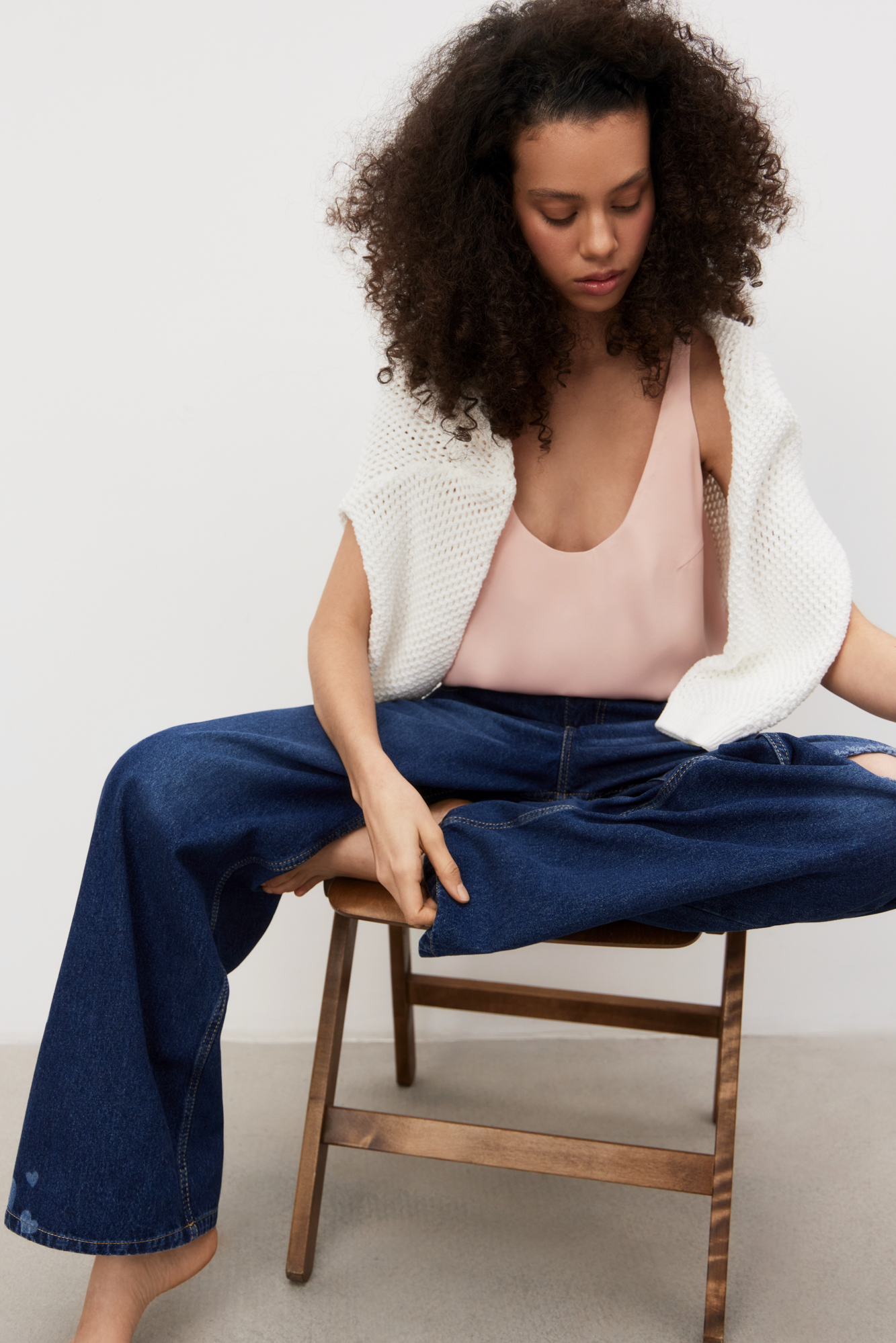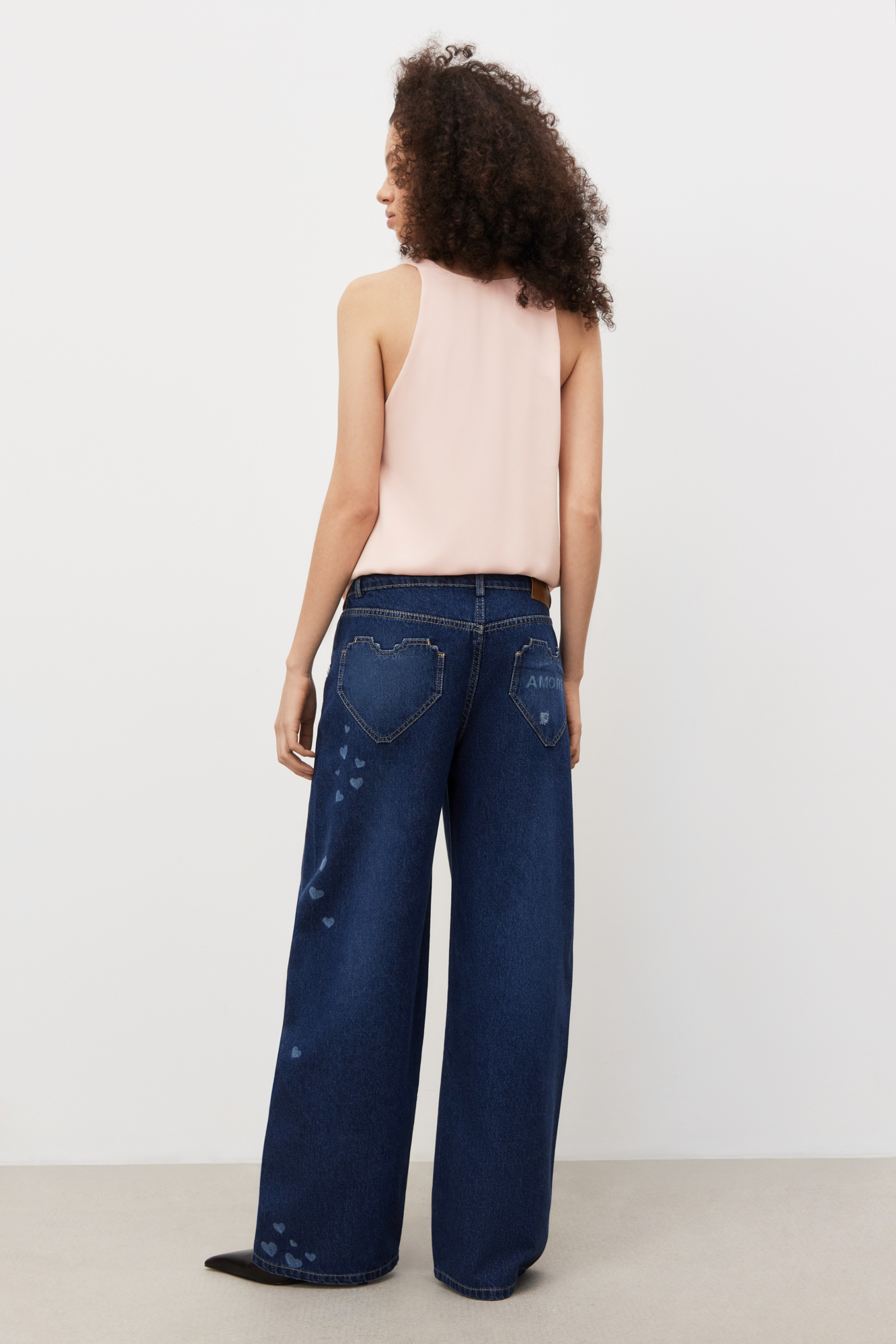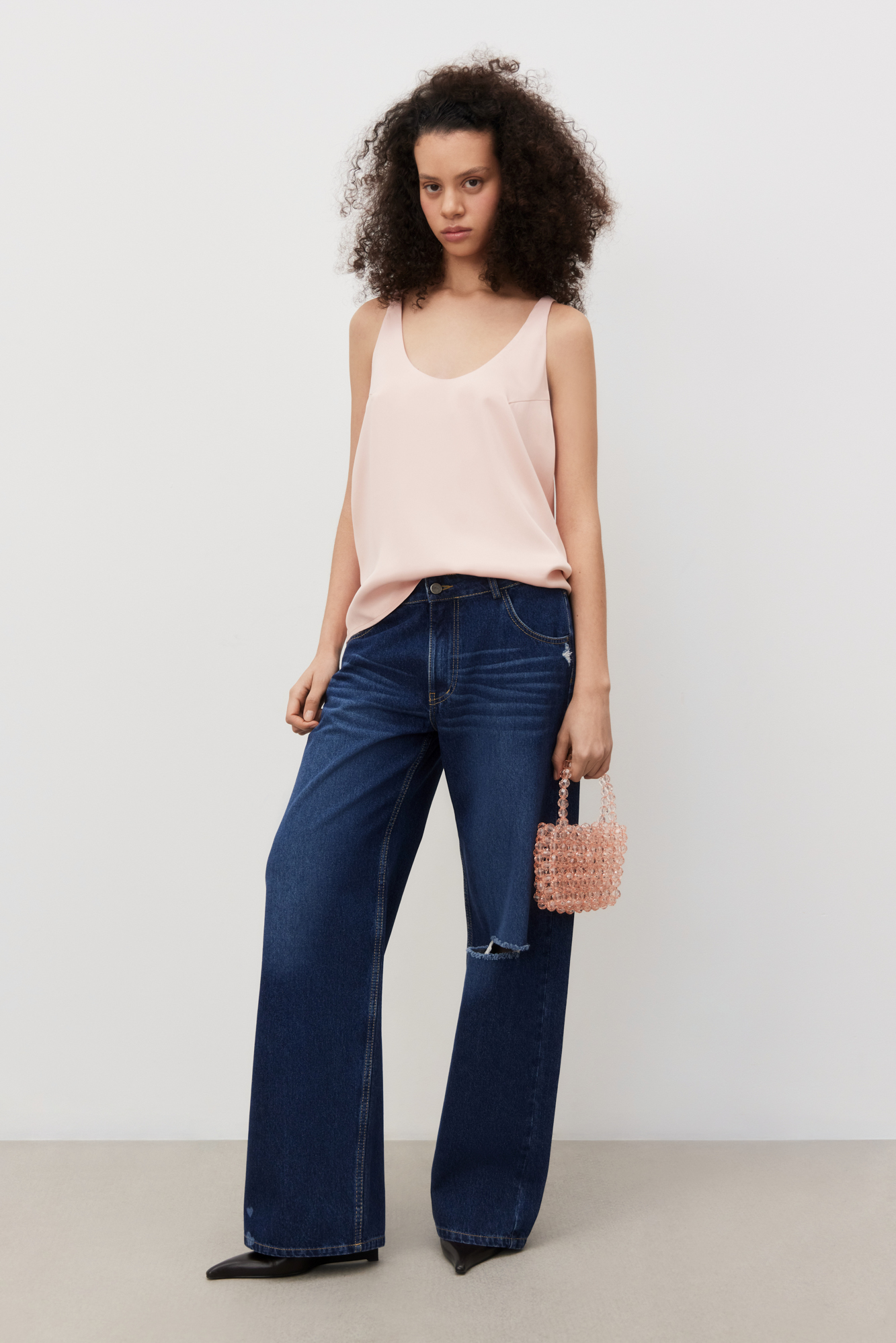 Майка из атласной вискозы. Модель свободного силуэта на тонких бретельках и глубоким вырезом декольте.