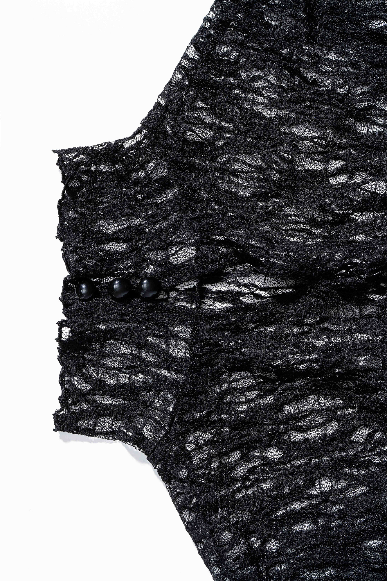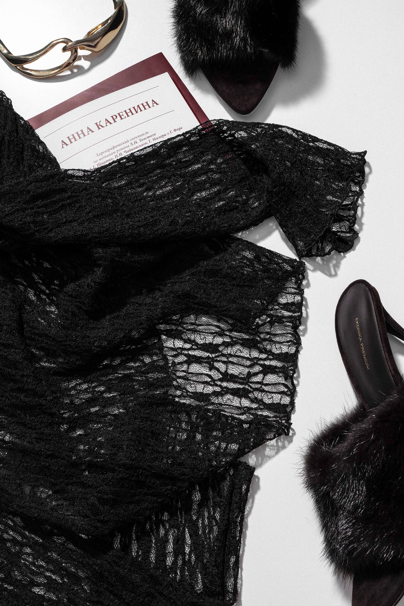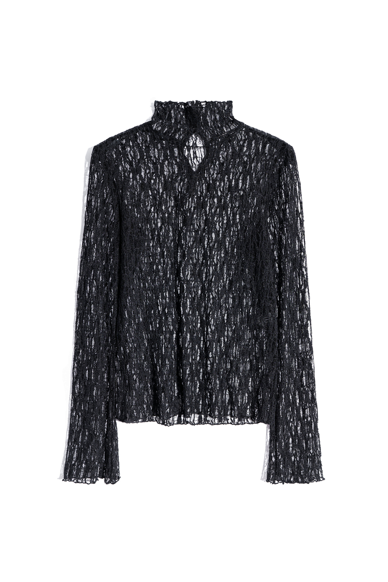 Топ из полупрозрачного кружева. Модель с длинными расклешенными к манжетам рукавами и воротником-стойкой с пуговицами. Изделие без подкладки.