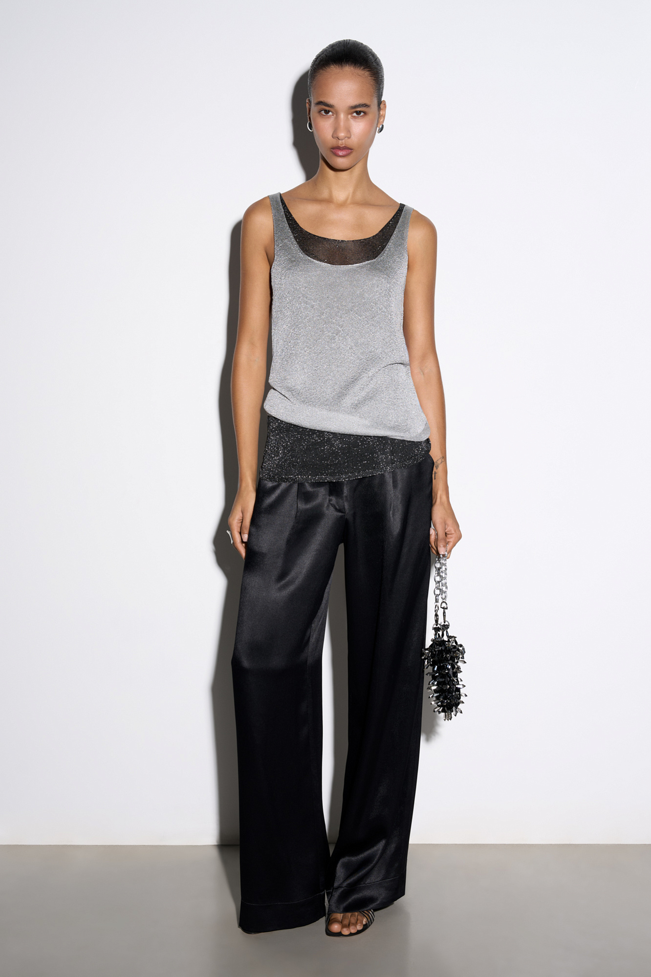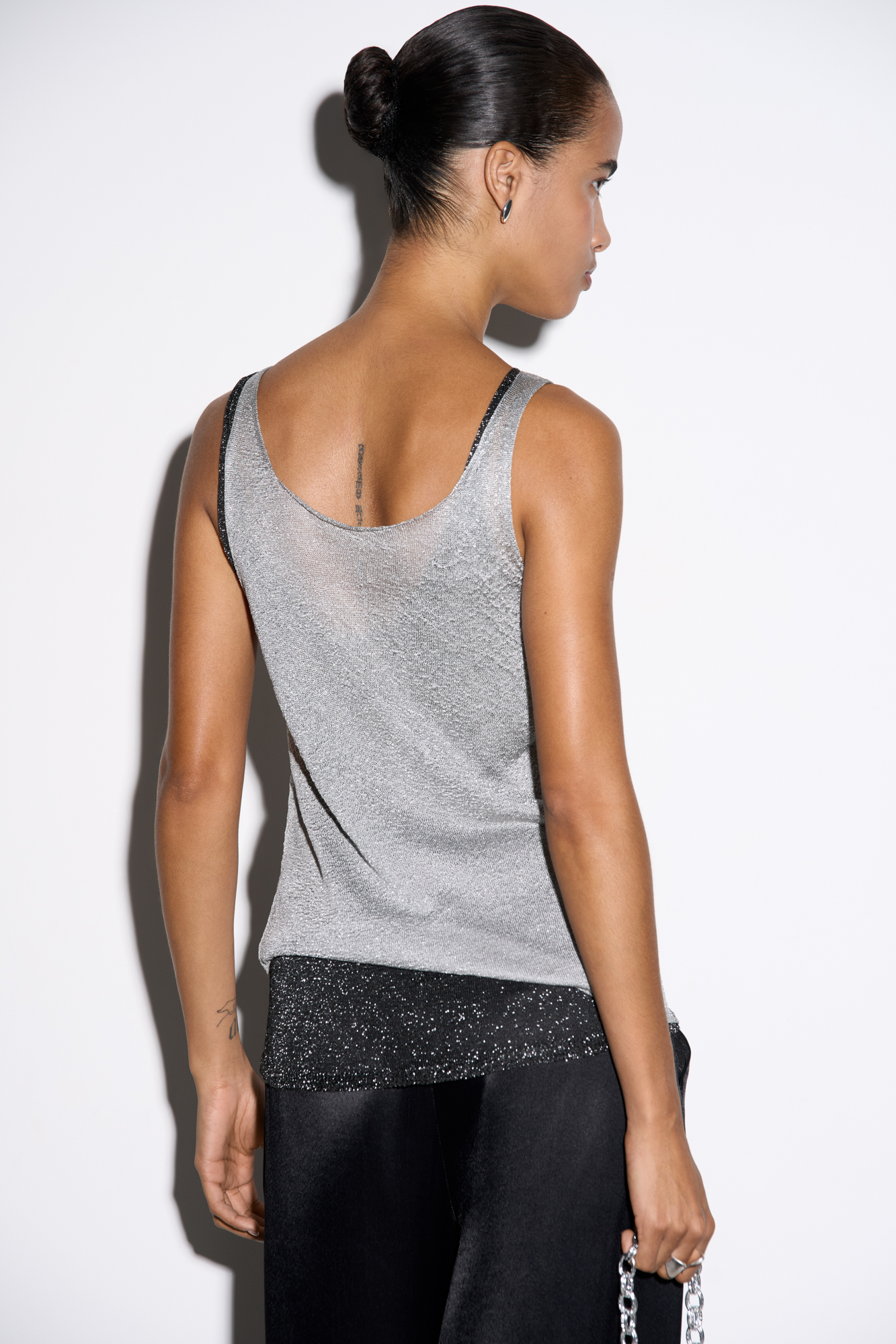 Полупрозрачная цельновязаная майка из вискозы с добавлением люрекса. Модель свободного силуэта на тонких бретельках и глубоким вырезом декольте.