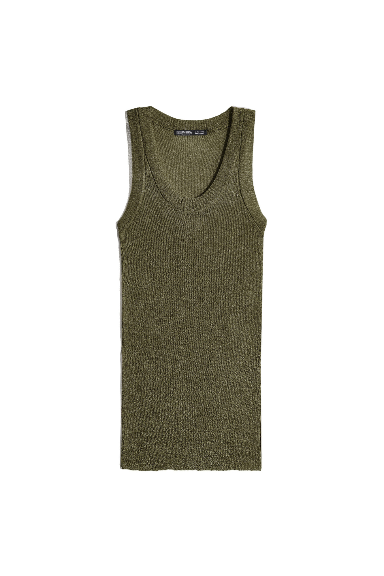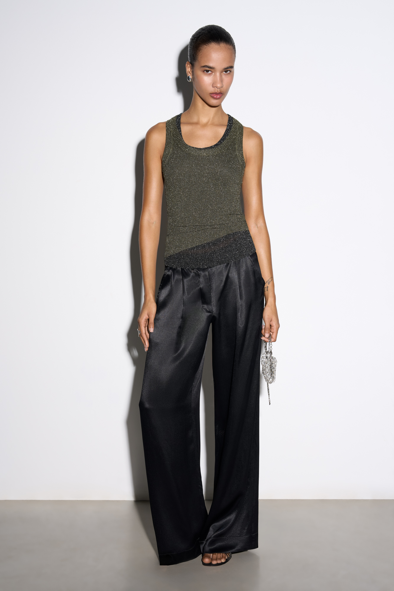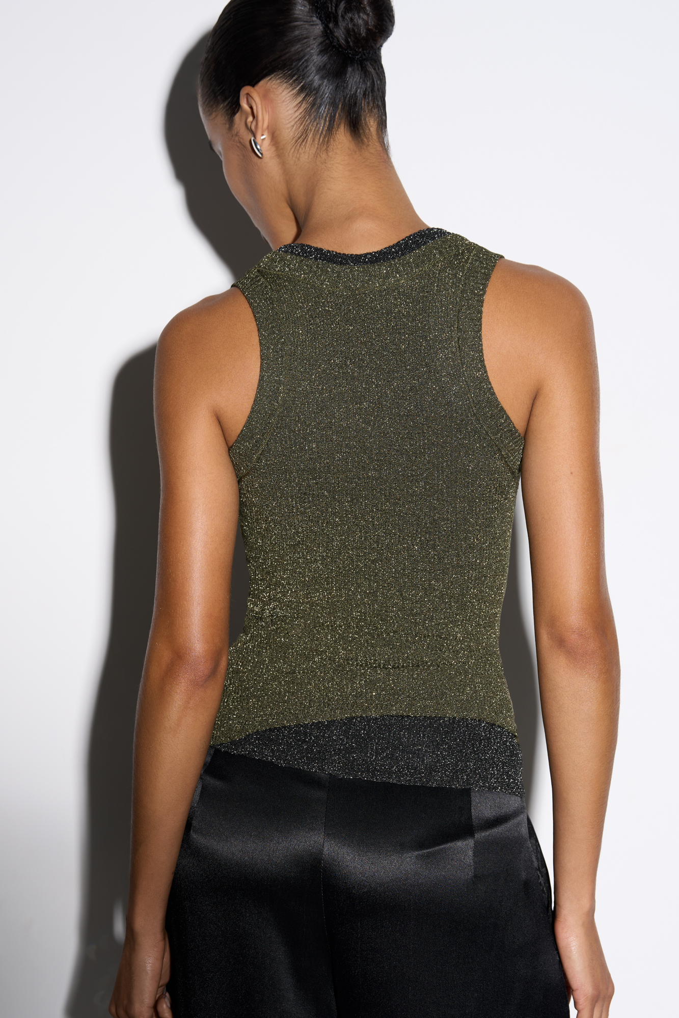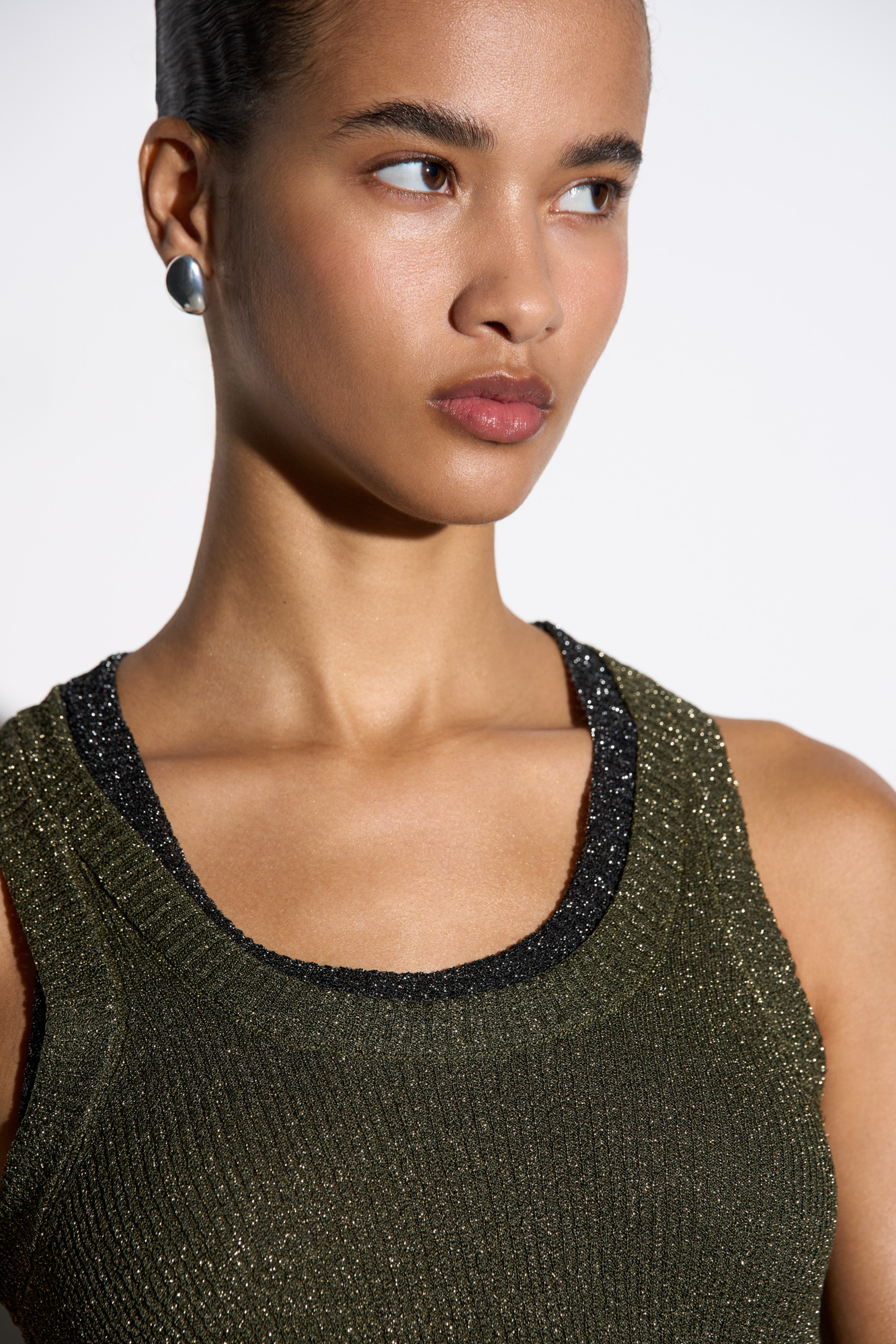 Трикотажный топ из вискозы с люрексом. Модель с U-образным вырезом горловины и широкими бретелями.