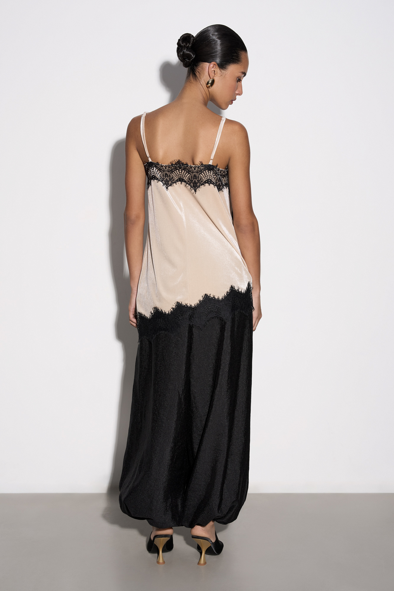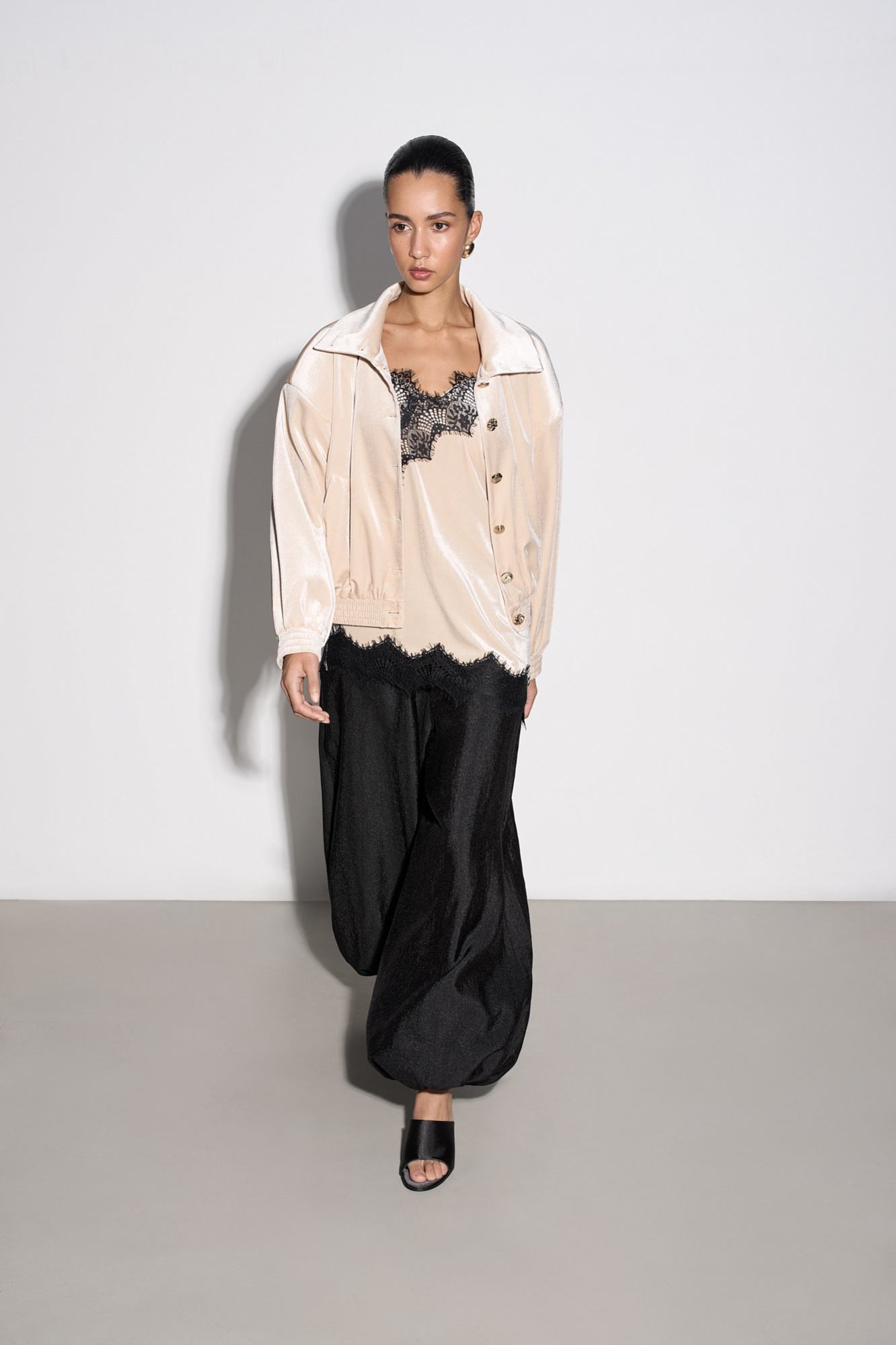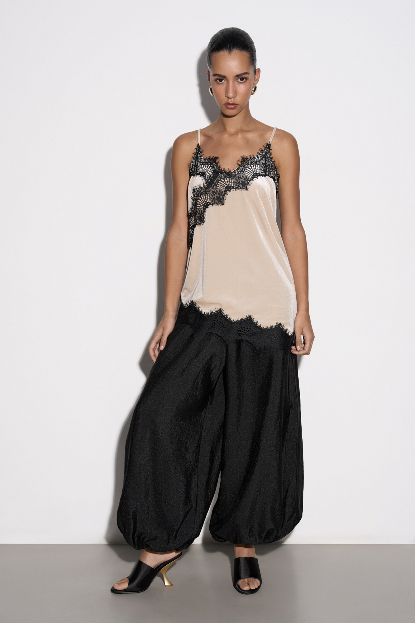 Топ из бархатной вискозы, декорированный тонким кружевом. Модель асимметричного кроя, с глубоким вырезом декольте на тонких бретельках.