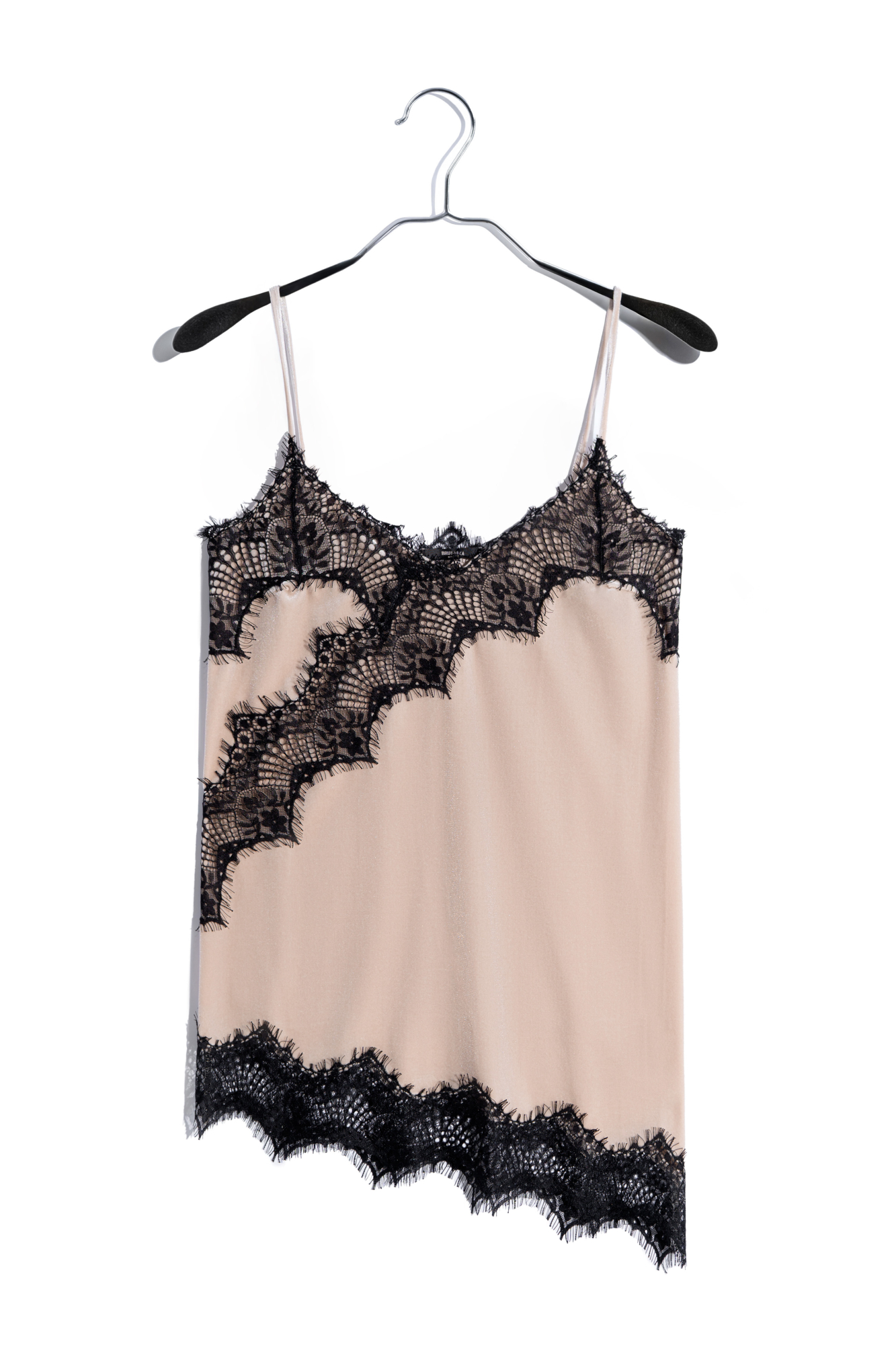 Топ из бархатной вискозы, декорированный тонким кружевом. Модель асимметричного кроя, с глубоким вырезом декольте на тонких бретельках.