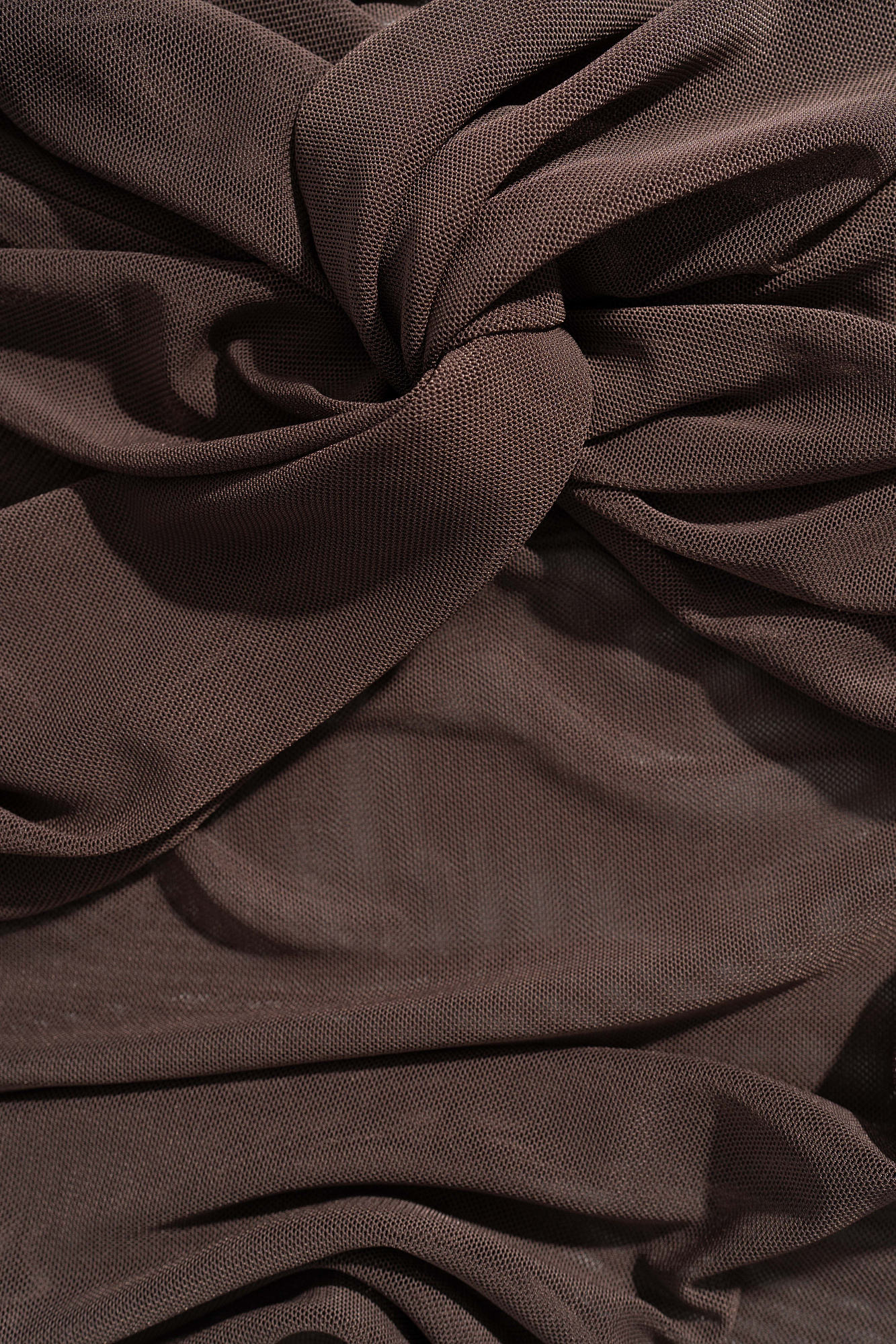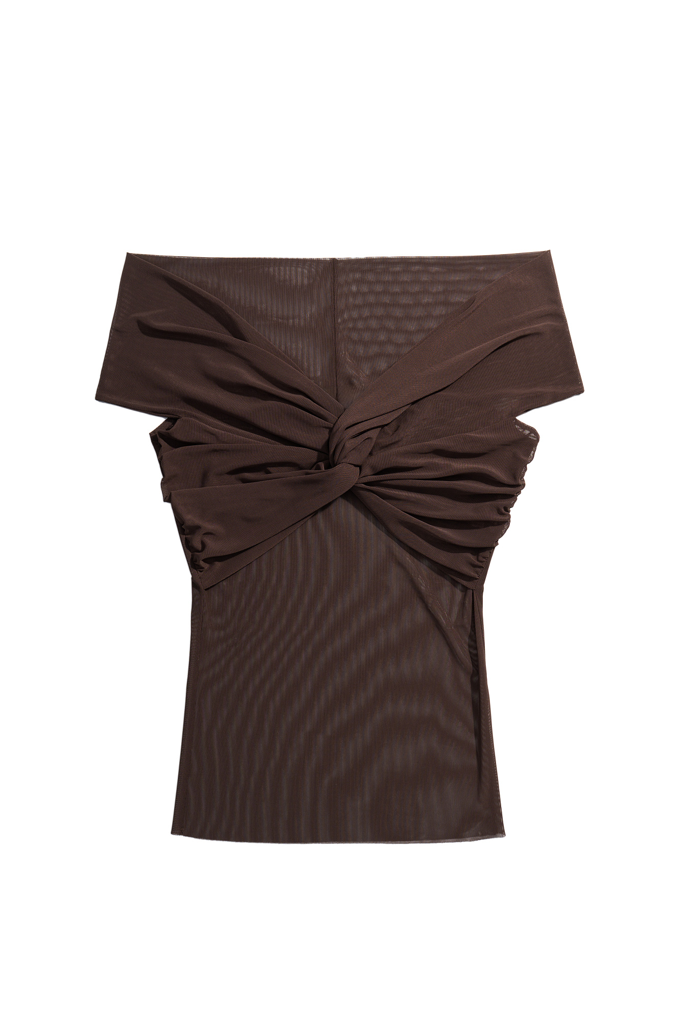 Полупрозрачный топ с открытой линией плеч. Модель приталенного силуэта, без рукавов. Изделие декорировано перекрутом на груди и драпировкой на лифе.