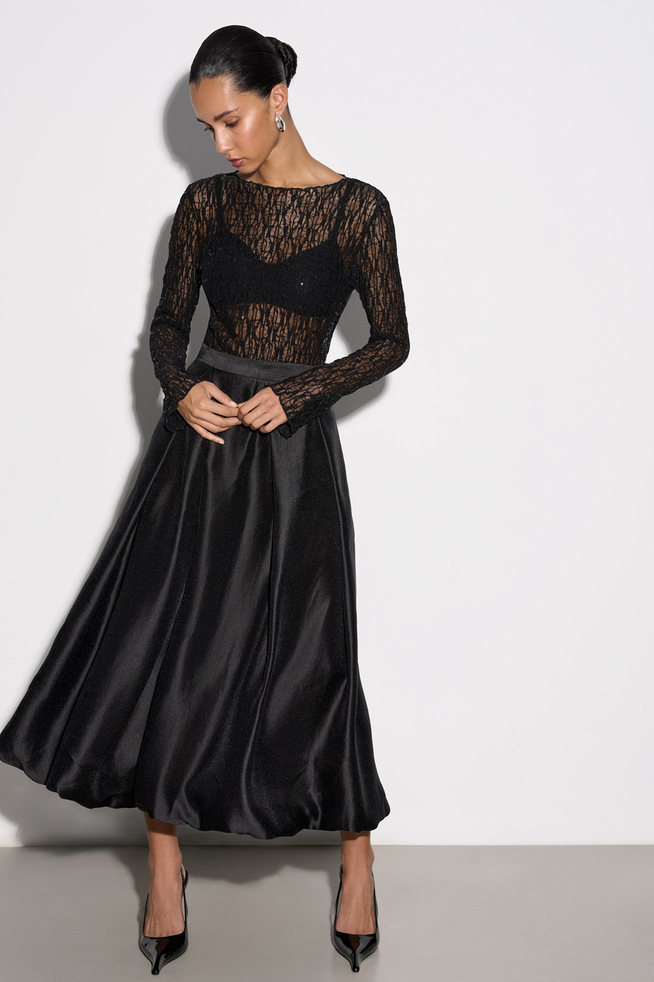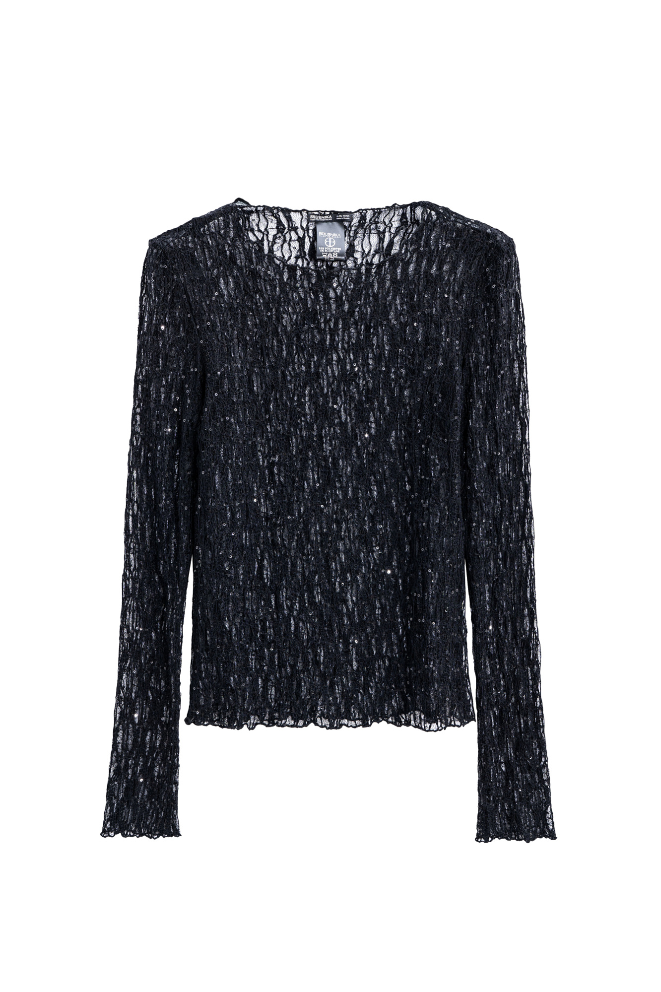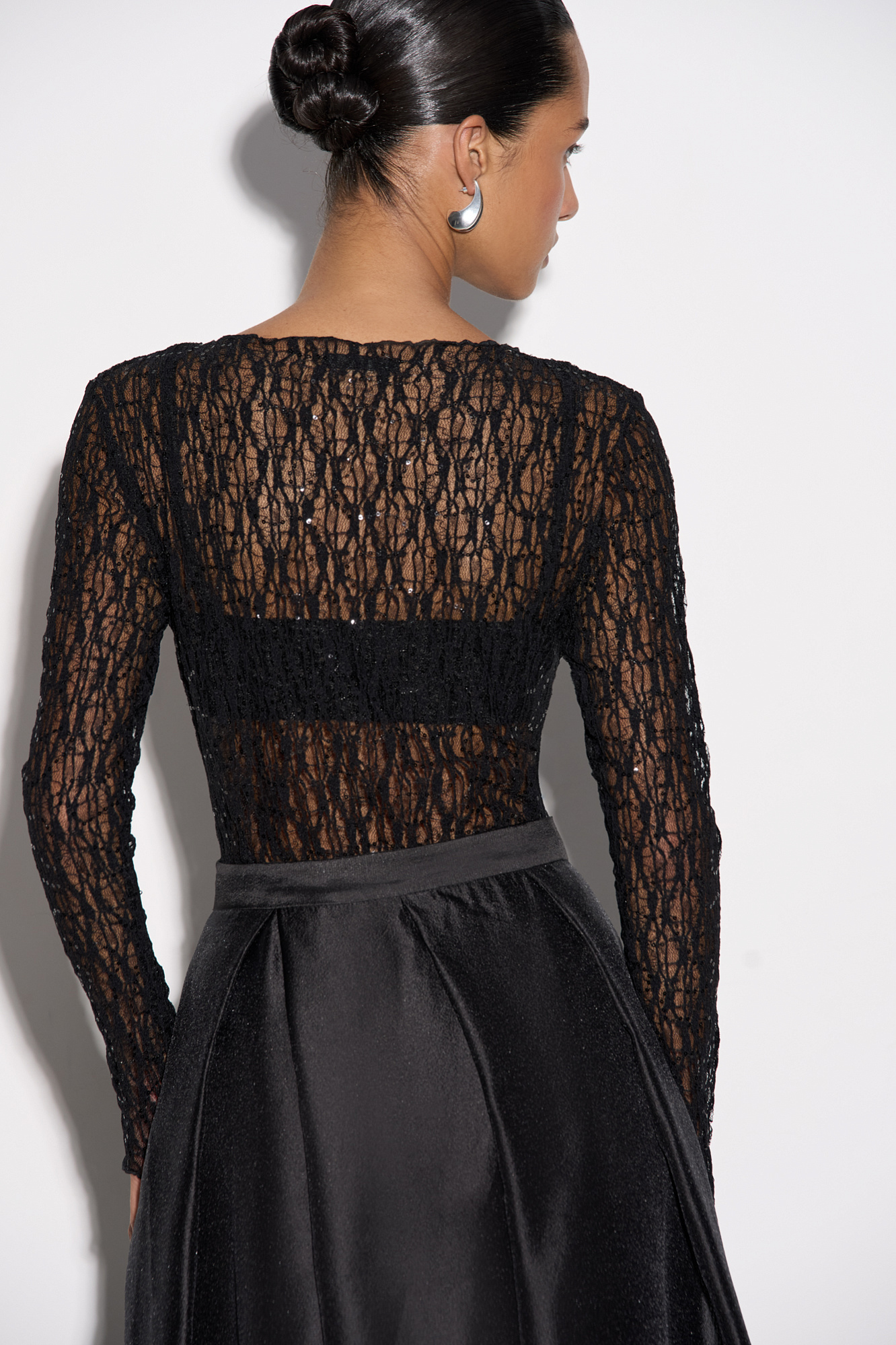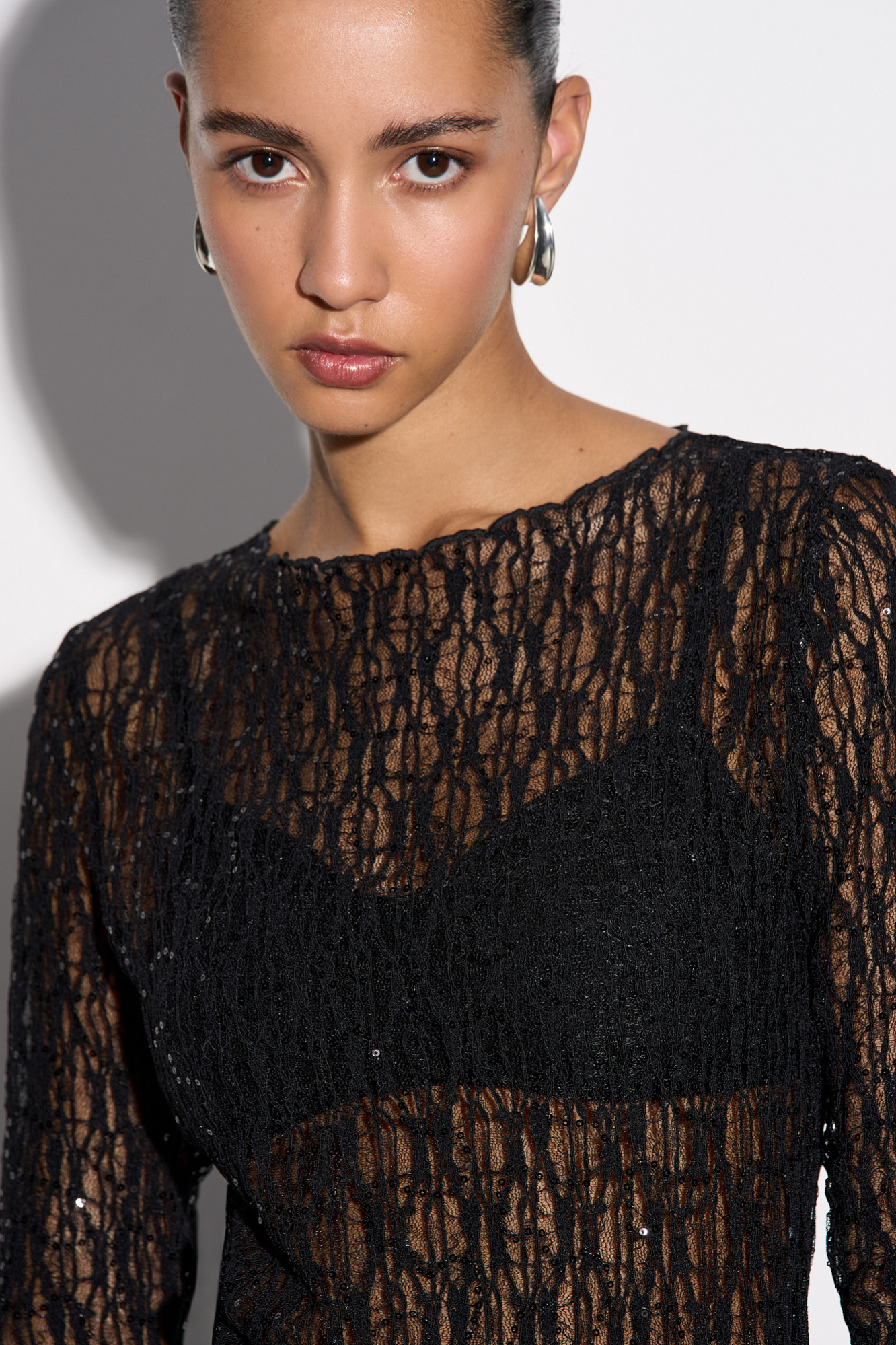 Кружевной лонгслив, декорированный пайетками. Модель по фигуре с горловиной лодочкой.