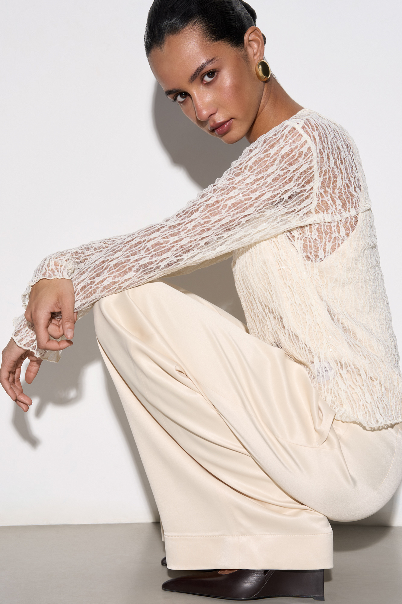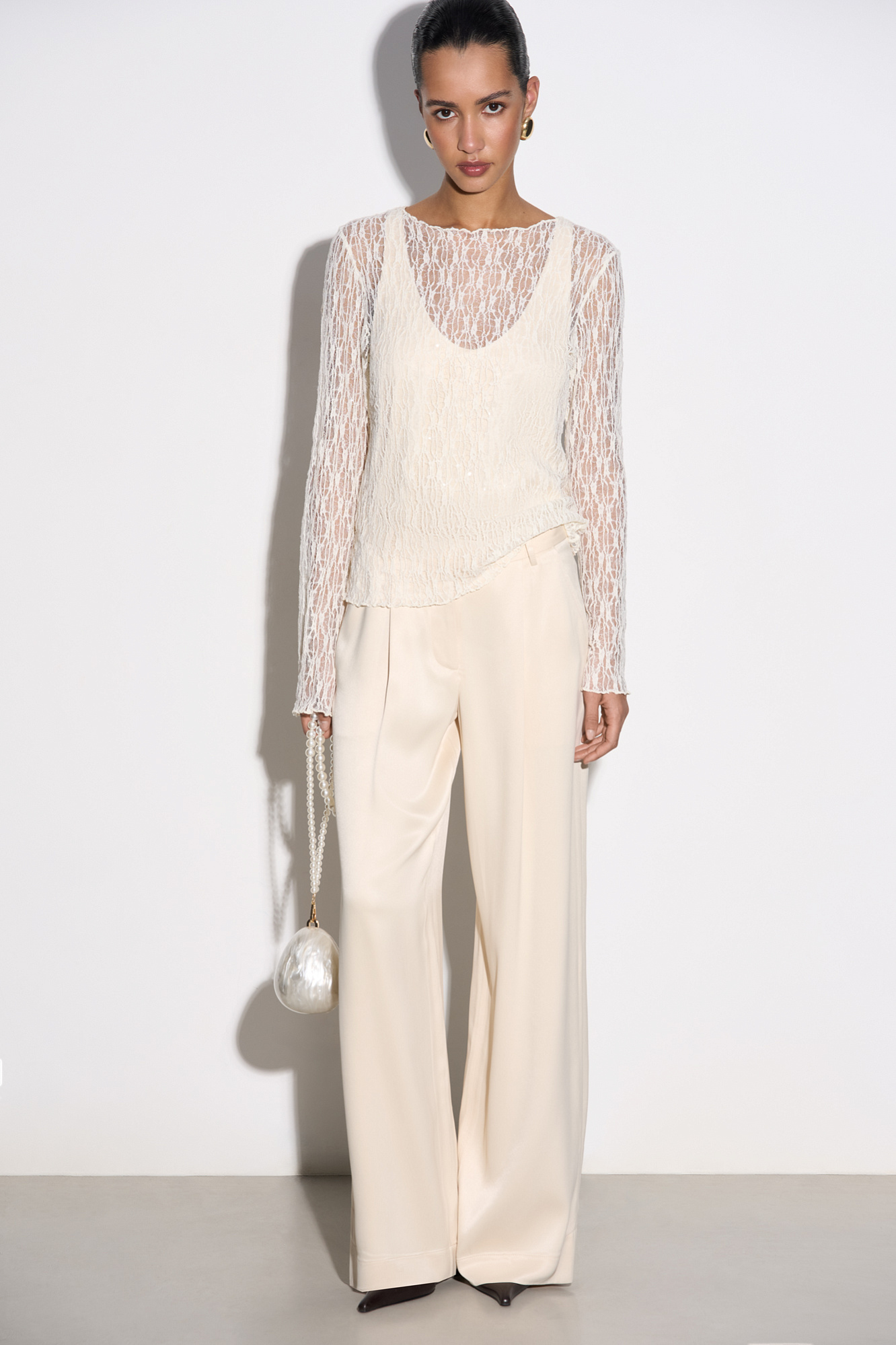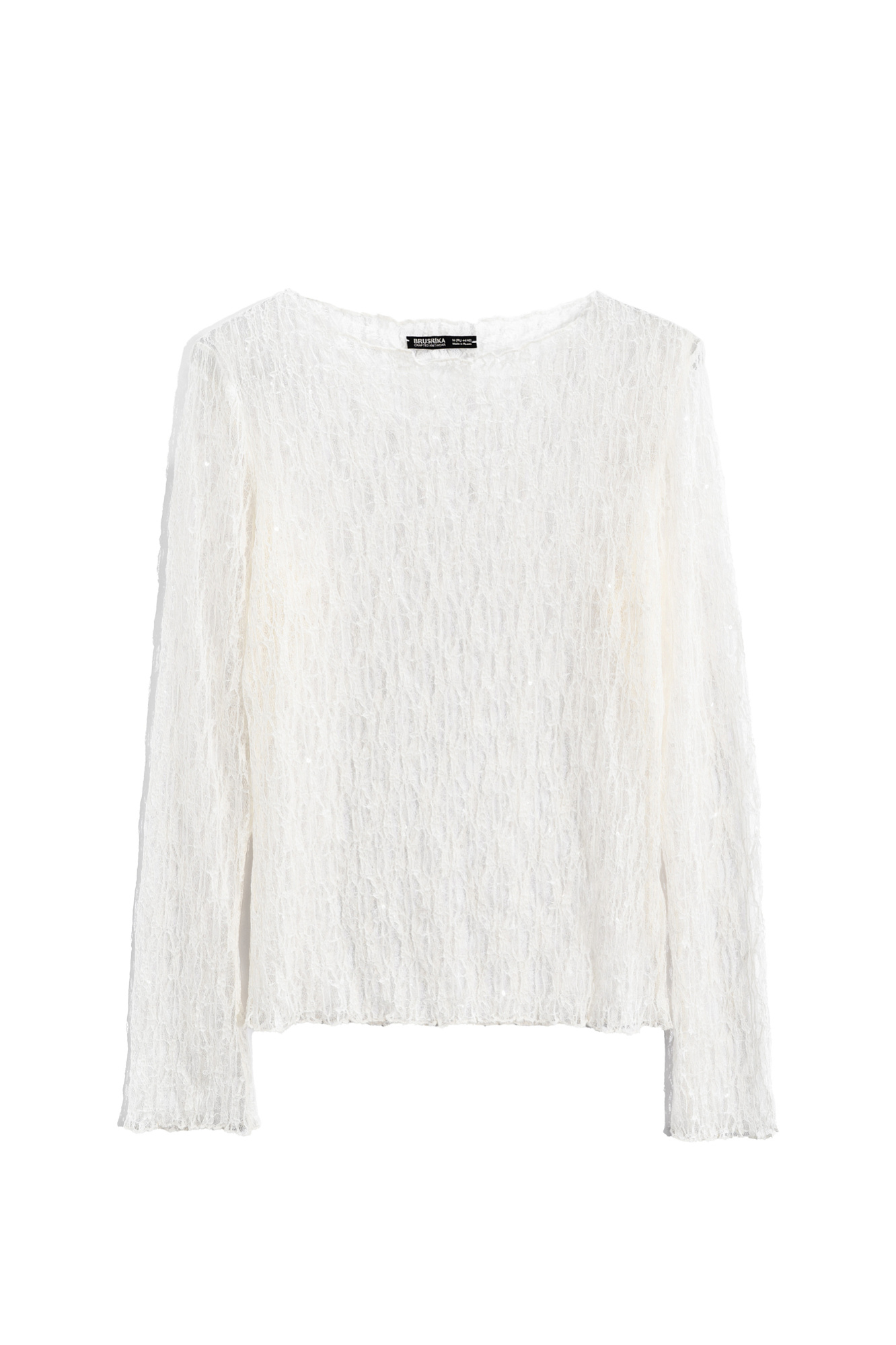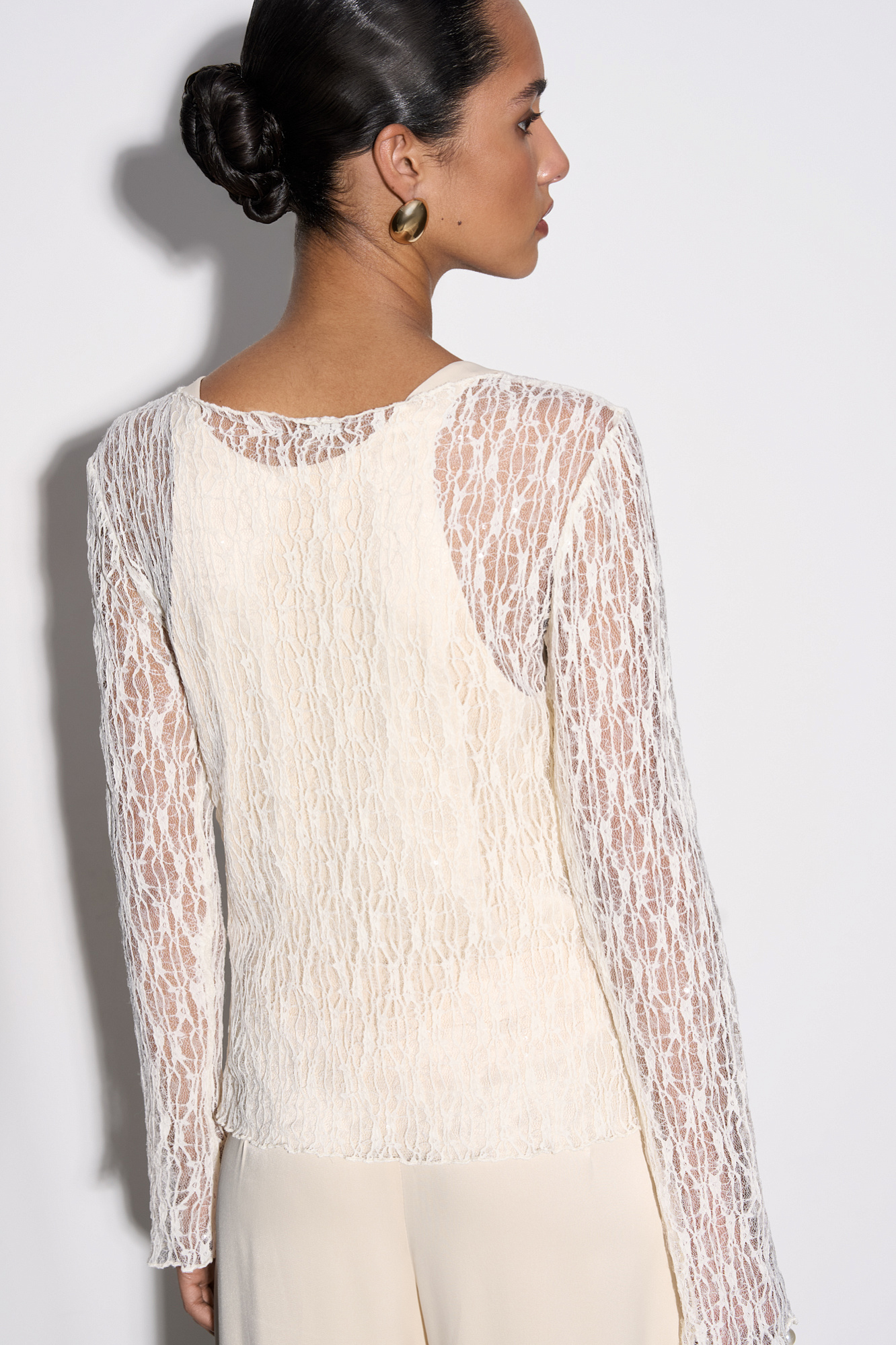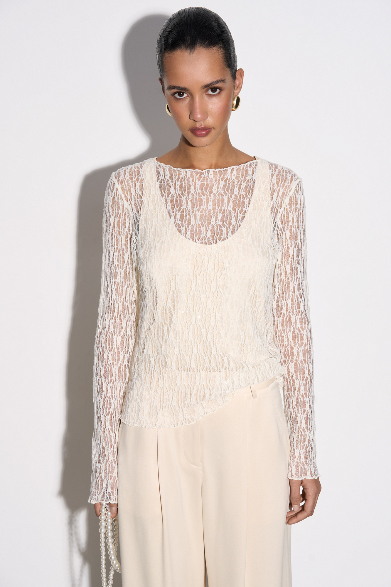 Кружевной лонгслив, декорированный пайетками. Модель по фигуре с горловиной лодочкой.
