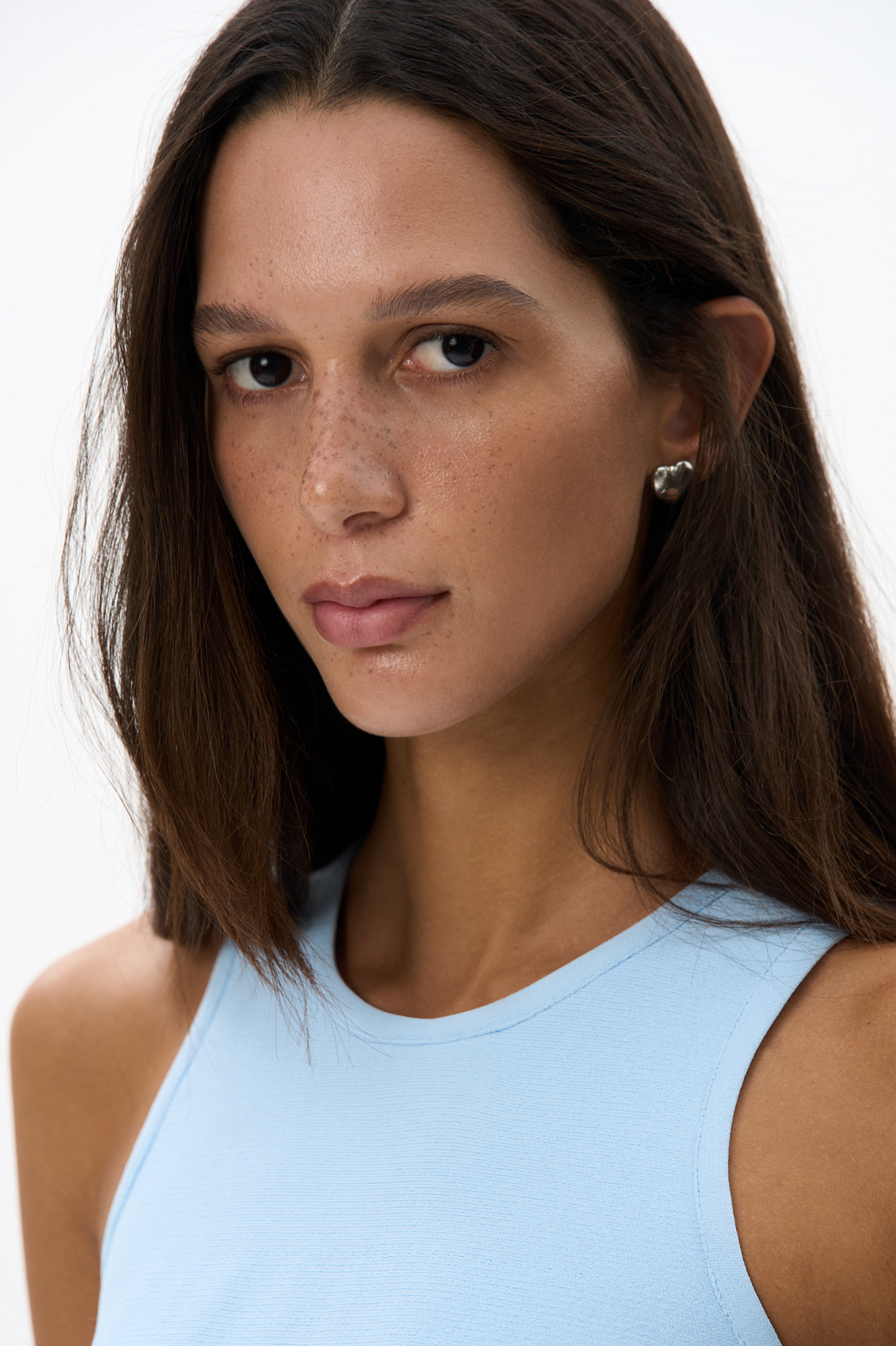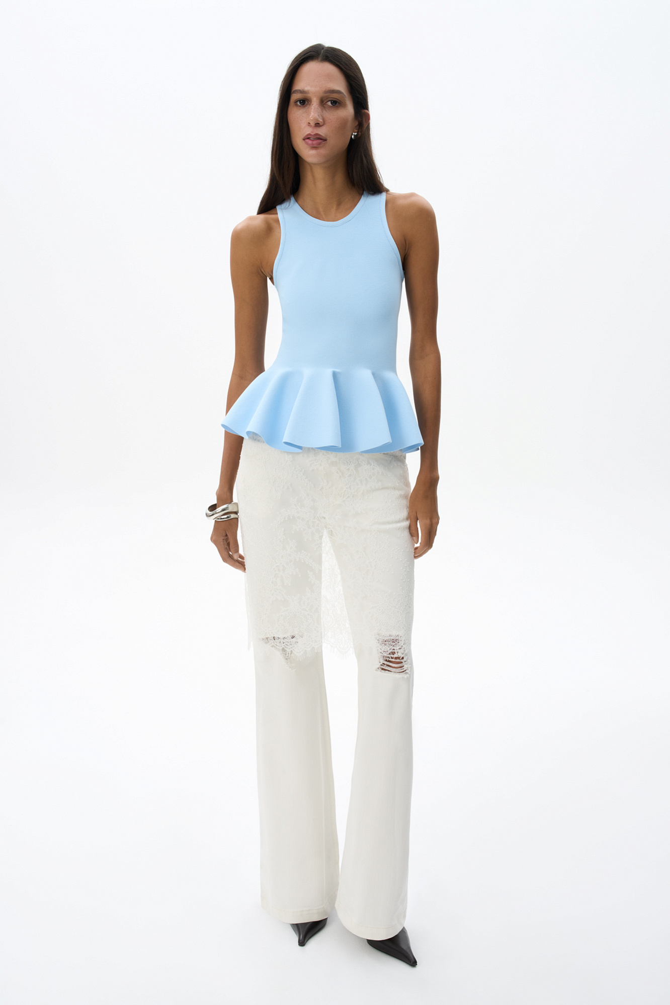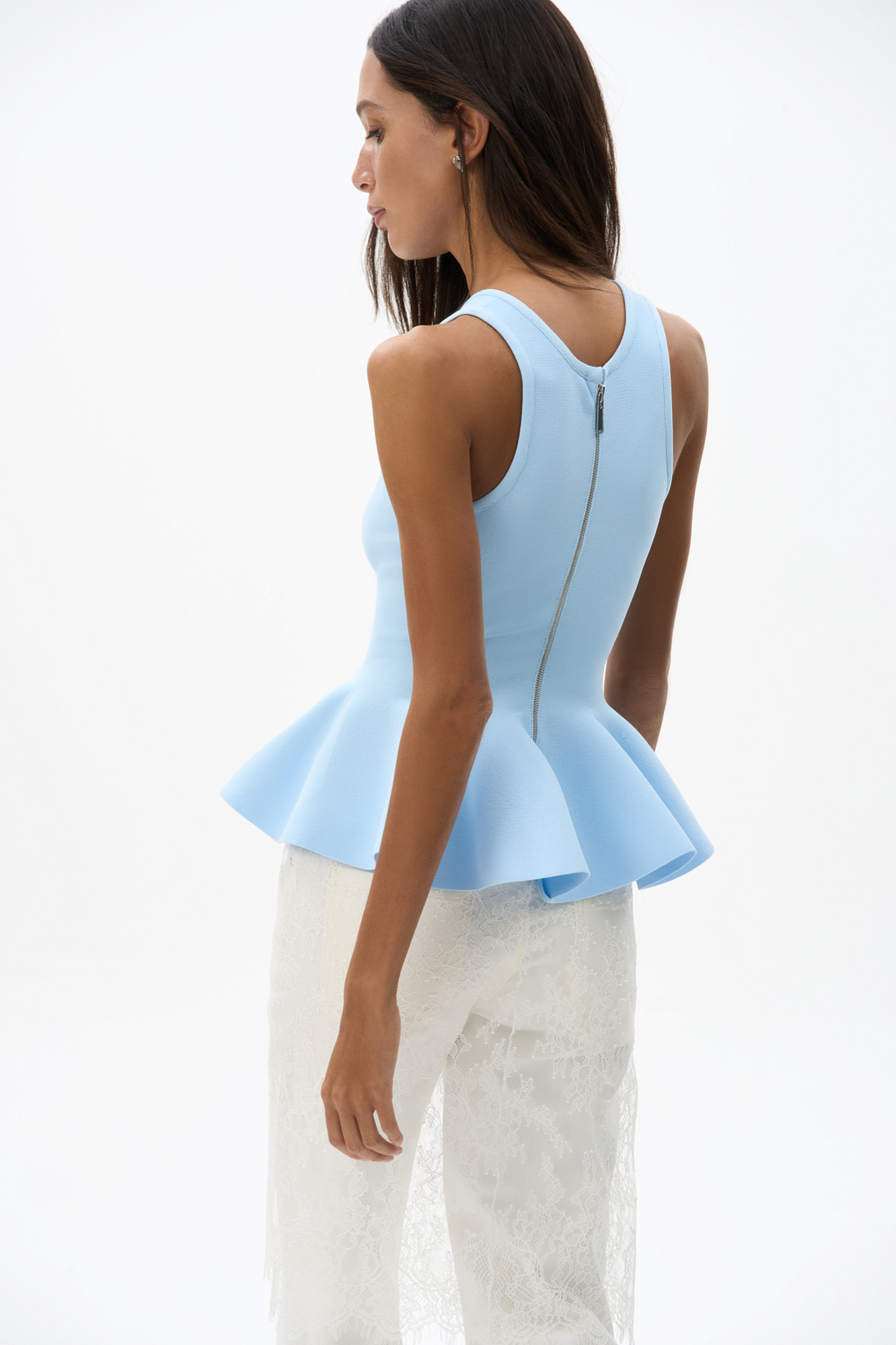 Трикотажный топ из матовой вискозы. Модель на широких бретельках с баской. Застежка на молнию сзади. Изделие без подкладки.