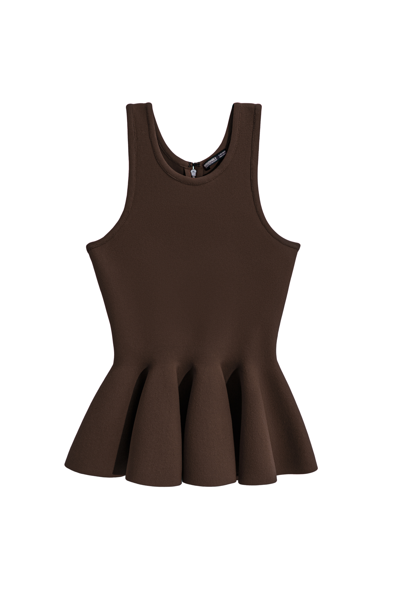 Трикотажный топ из матовой вискозы. Модель на широких бретельках с баской. Застежка на молнию сзади. Изделие без подкладки.