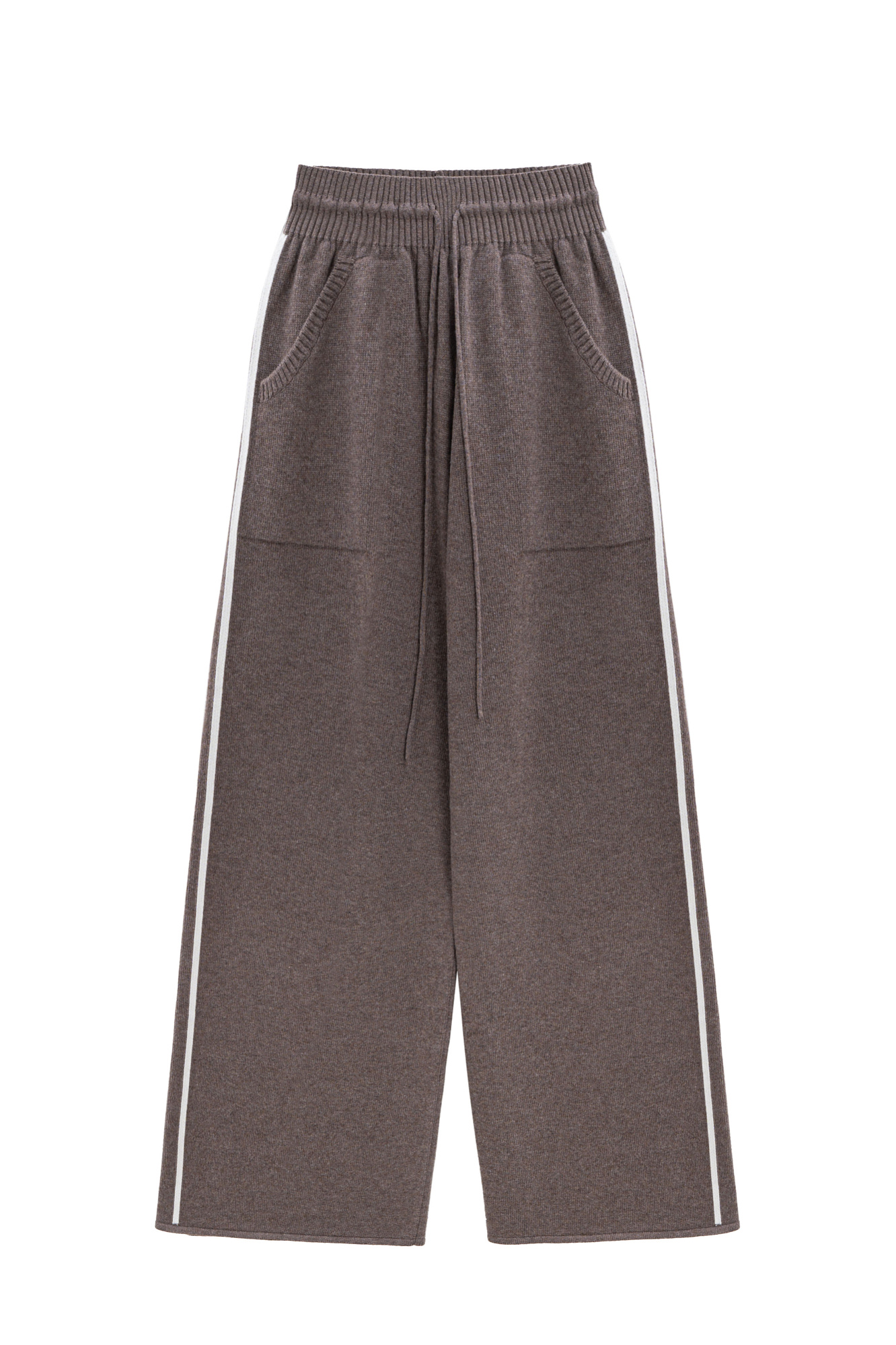 Трикотажные брюки из кашемира и шерсти. Модель свободного силуэта со средней посадкой, боковыми вывязанными карманами и эластичным поясом на кулиске. Изделие декорировано лампасами контрастного цвета.