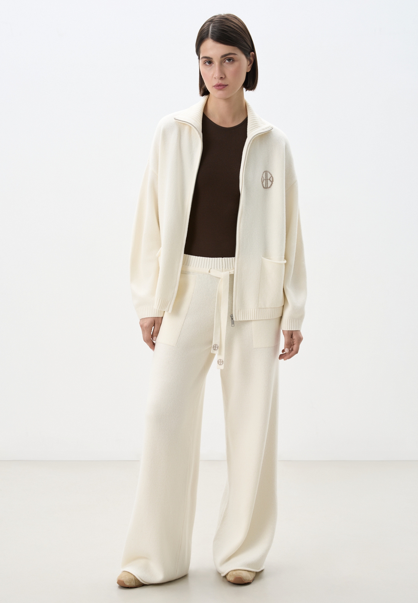 Трикотажные брюки из кашемира и шерсти. Модель прямого силуэта с накладными карманами и эластичным поясом в рубчик на кулиске. Дополнить образ можно бомбером.