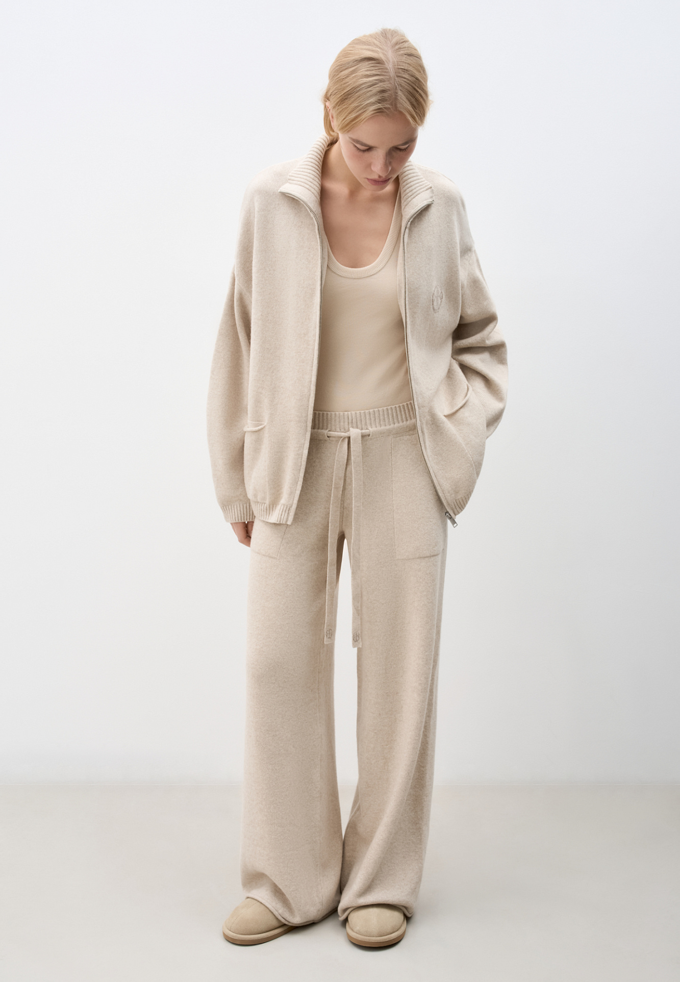 Трикотажные брюки из кашемира и шерсти. Модель прямого силуэта с накладными карманами и эластичным поясом в рубчик на кулиске. Дополнить образ можно бомбером.