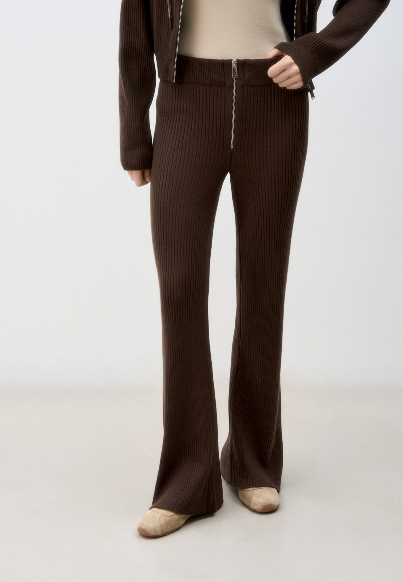 Трикотажные брюки в рубчик. Модель прямого кроя с расклешением к низу. Застежка на молнию. Эластичный пояс на резинке.
