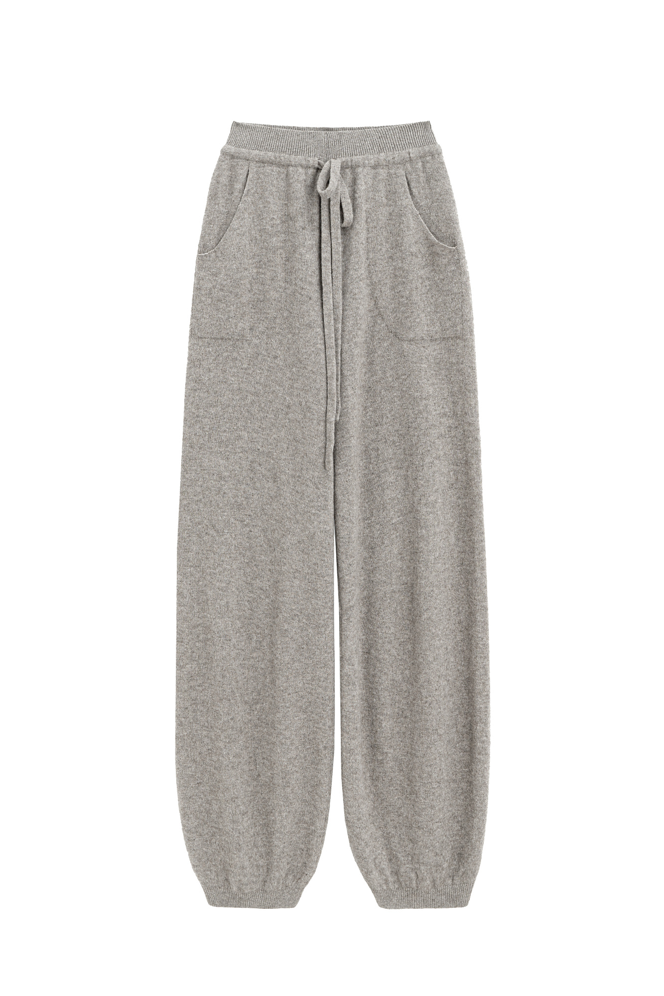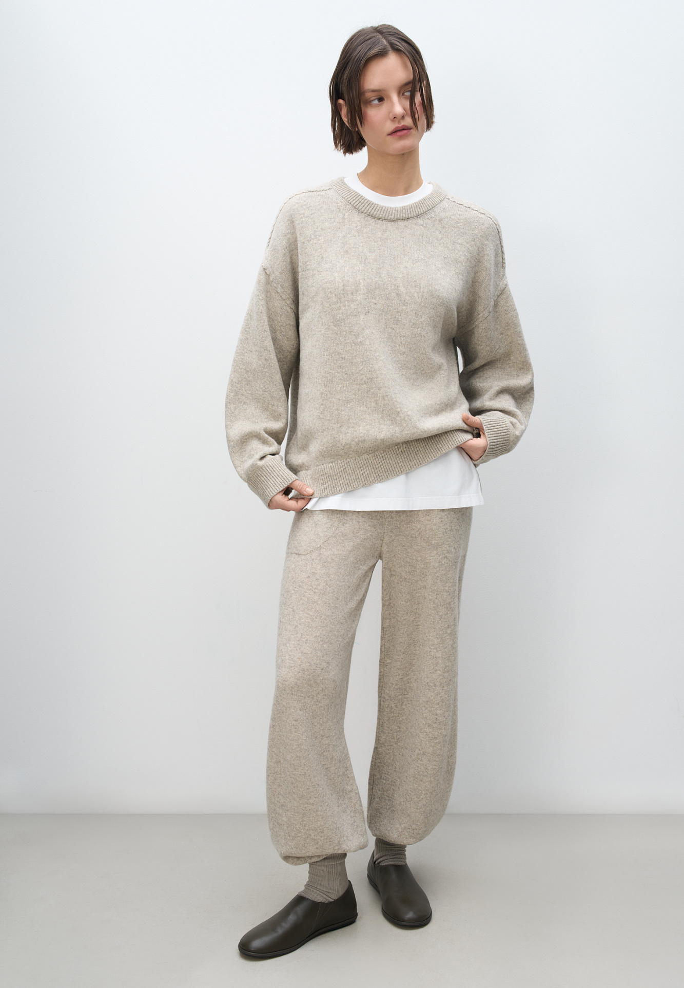 Трикотажные брюки из шерсти яка и мериноса экстрафайн. Модель с эластичным поясом на кулиске и округлыми карманами. Манжеты брюк и пояс выполнены в рубчик.