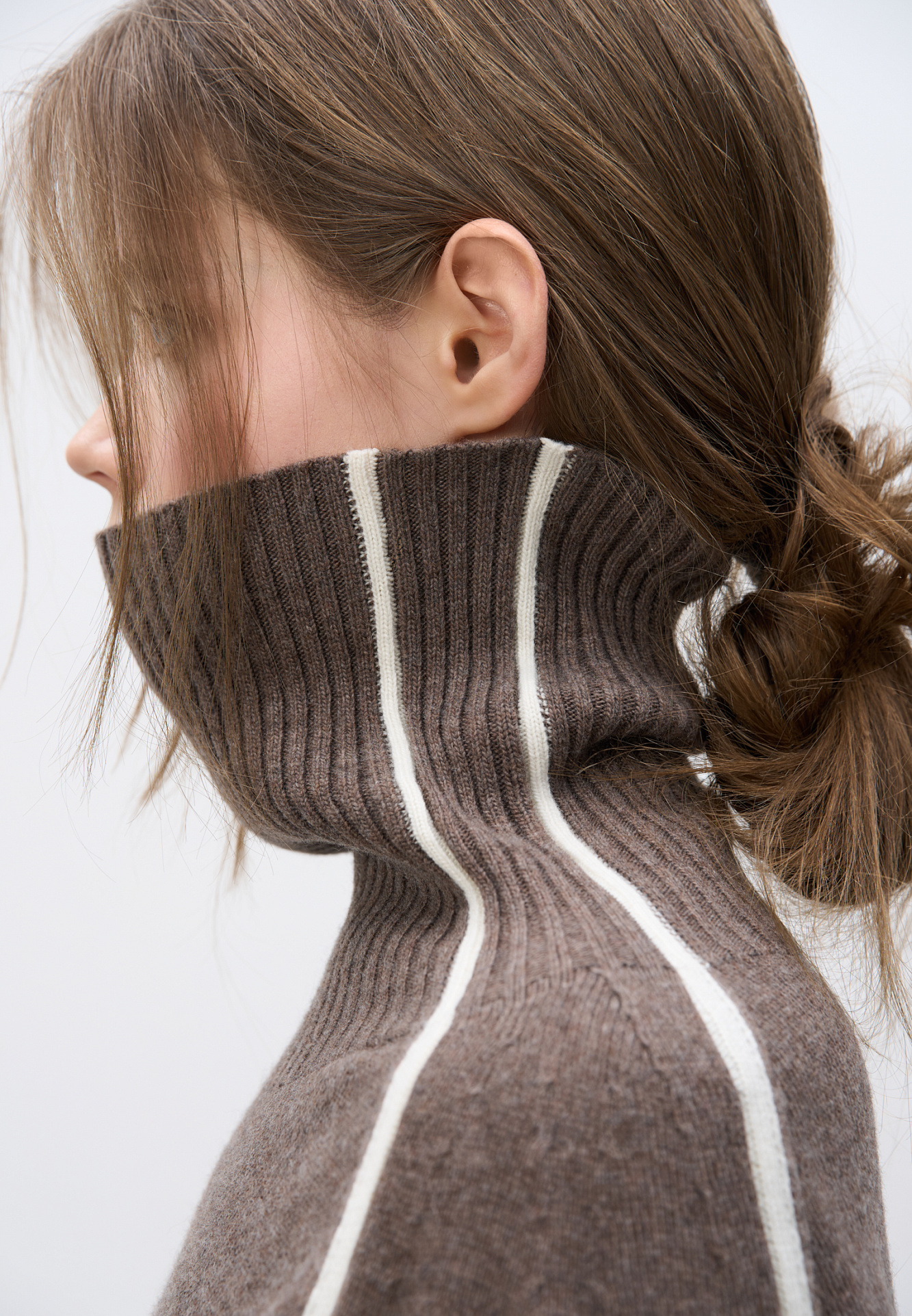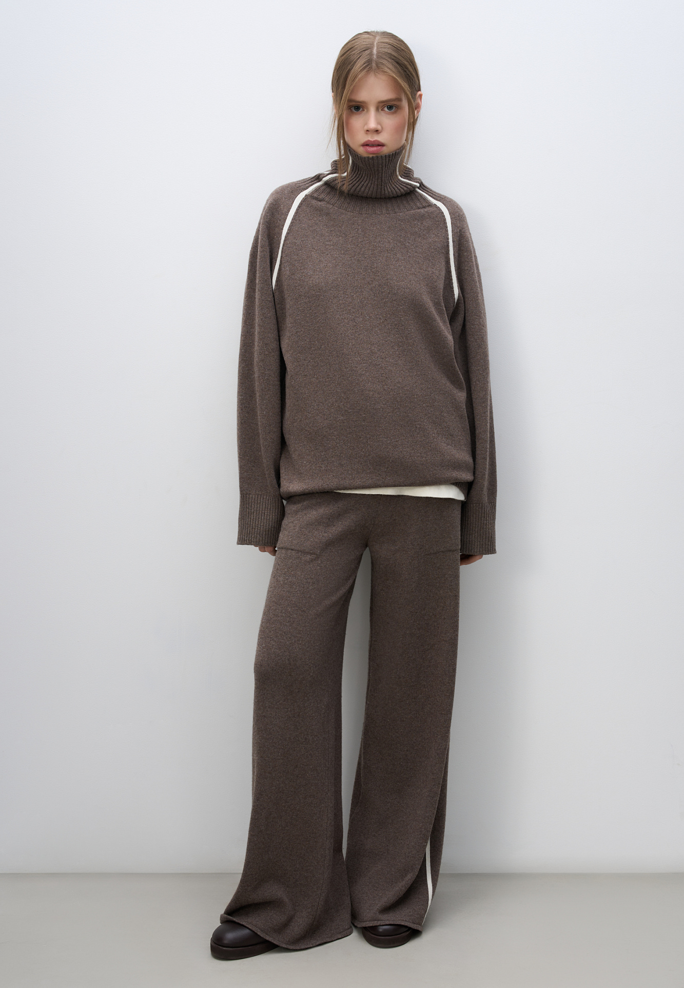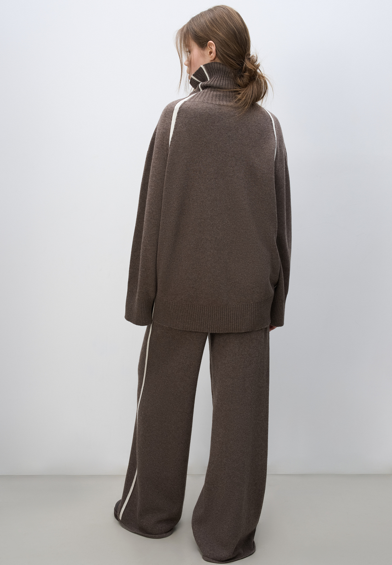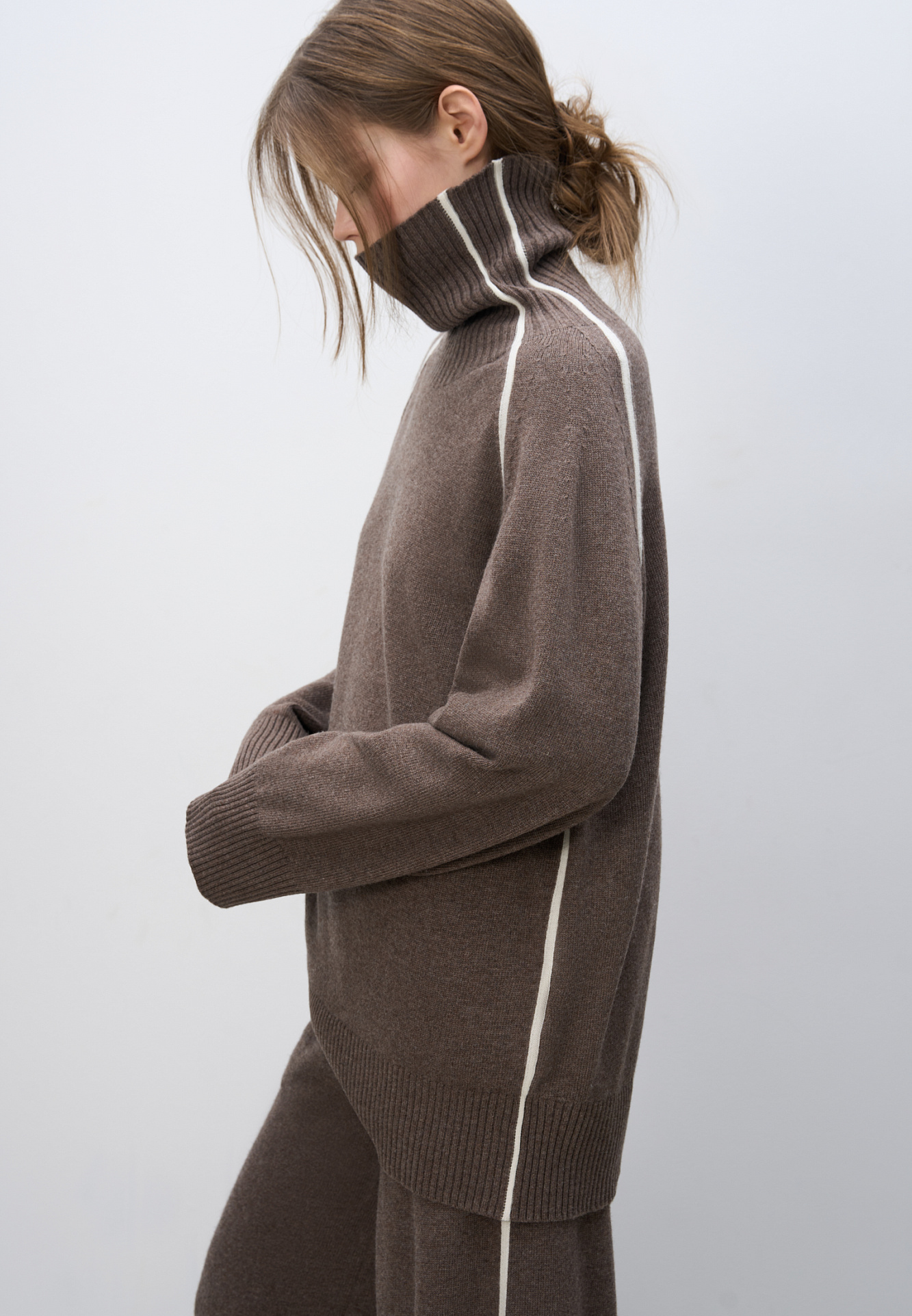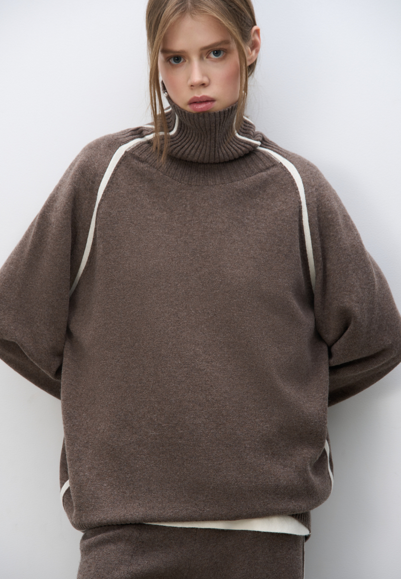 Трикотажный джемпер из смесовой шерсти. Модель свободного силуэта с лампасами, высоким воротом и спущенной линией плеч.