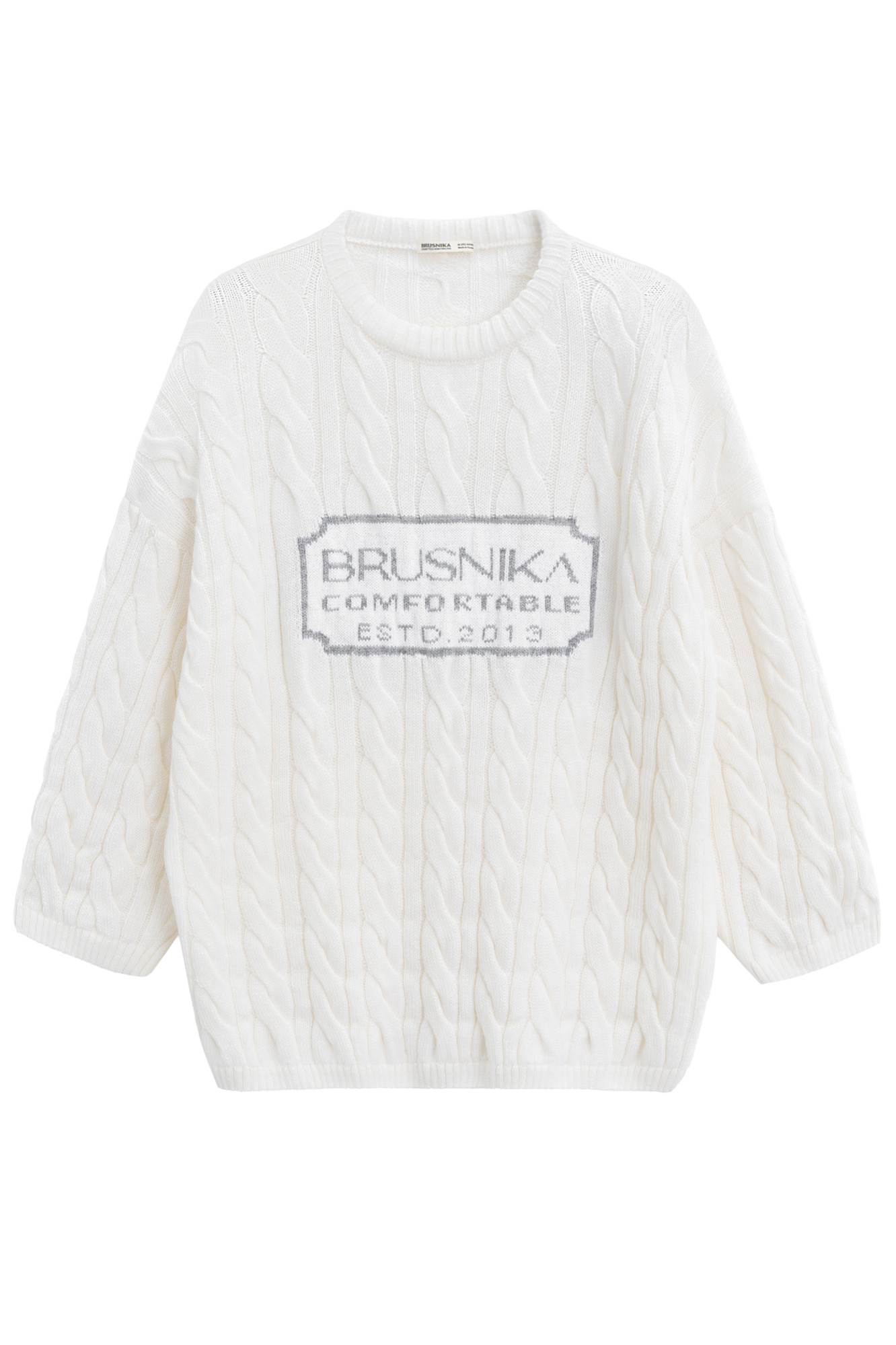 Трикотажный джемпер с объемными косами из мягкой шерсти. Модель свободного силуэта, со спущенной линией плеч и круглым вырезом. Изделие декорировано брендированным жаккардом на груди. Дополнить образ можно брюками и юбкой в том же стиле.