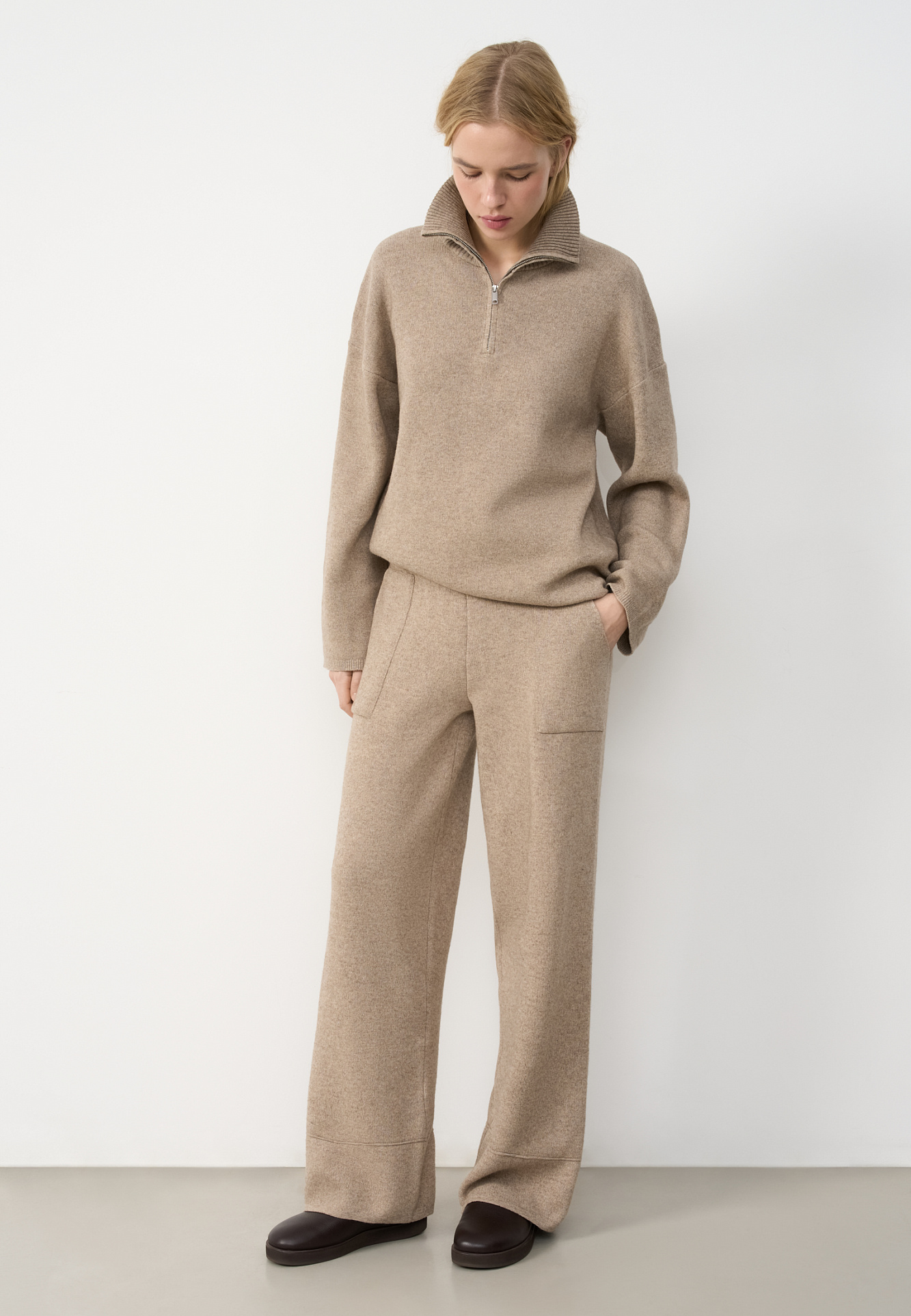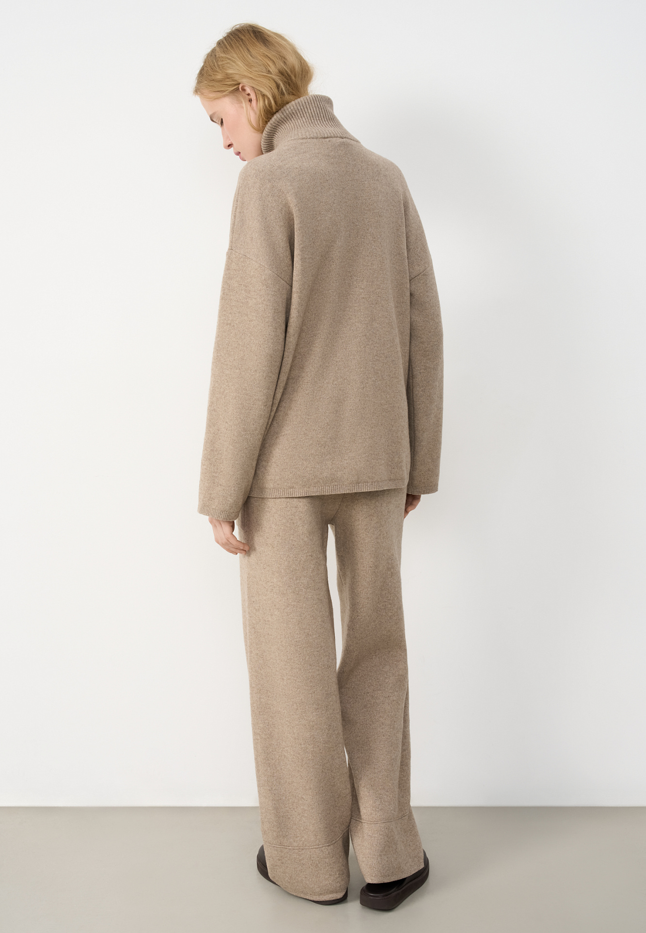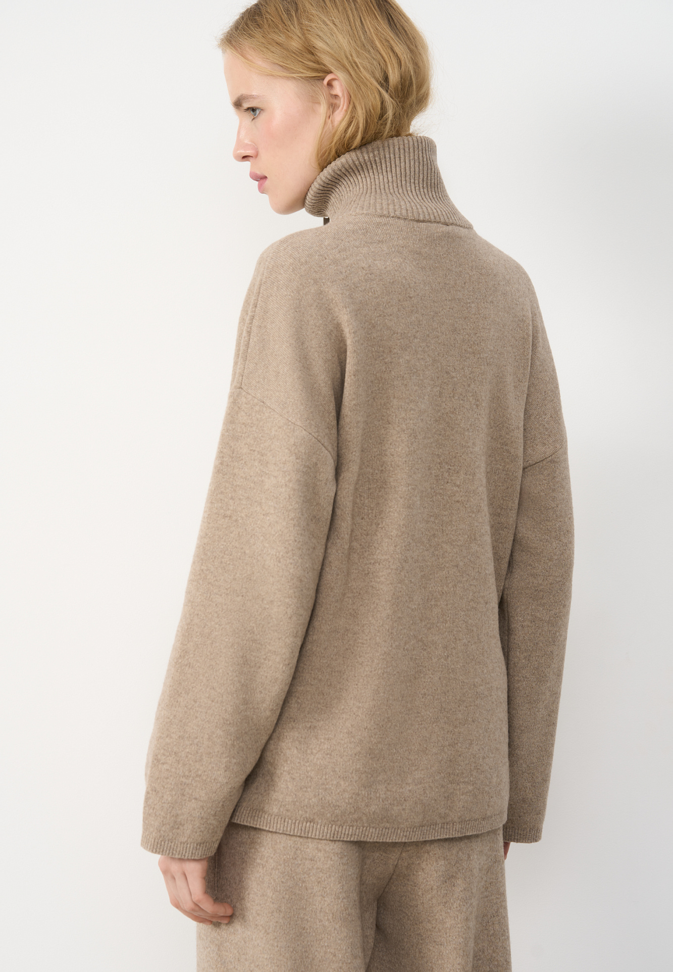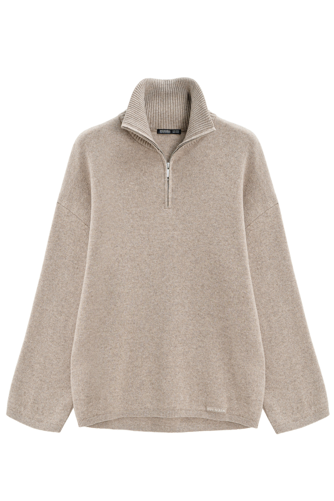 Трикотажный джемпер из кашемира и шерсти. Модель свободного кроя, с высоким воротом на молнии и спущенной линией плеч. Ворот и края изделия выполнены в рубчик.