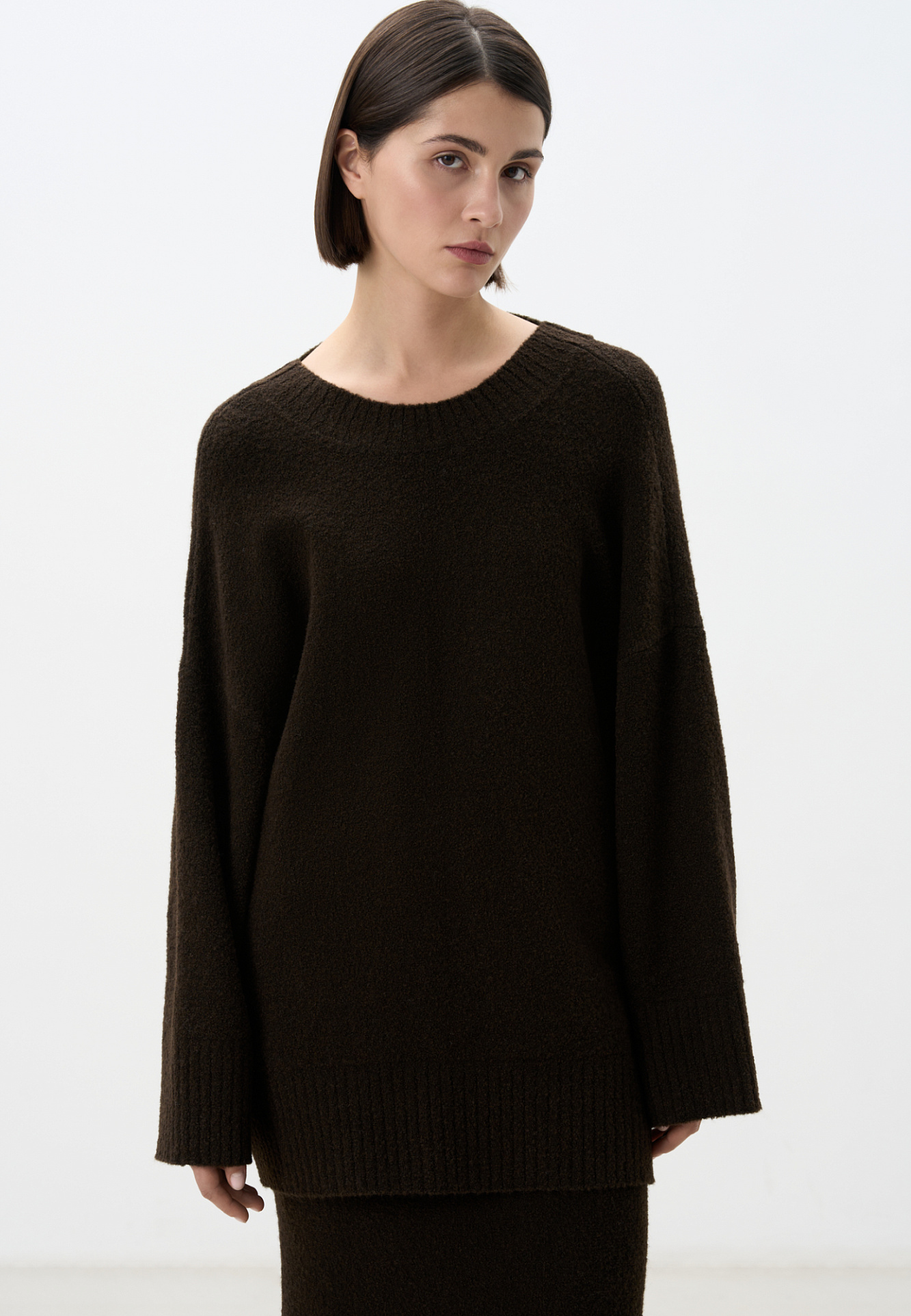 Трикотажный джемпер из буклированной пряжи. Модель свободного силуэта с длинным рукавом и глубоким вырезом на спине. Края изделия выполнены в рубчик. Дополнить образ можно юбкой в таком же стиле.