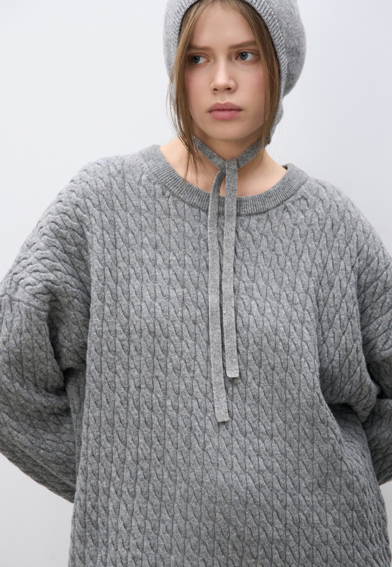 Трикотажный джемпер с объемными косами из 100% шерсти мериноса экстрафайн. Модель свободного силуэта, со спущенной линией плеч и круглым вырезом горловины, оформленным двойной бейкой. Края изделия выполнены в мелкий рубчик.