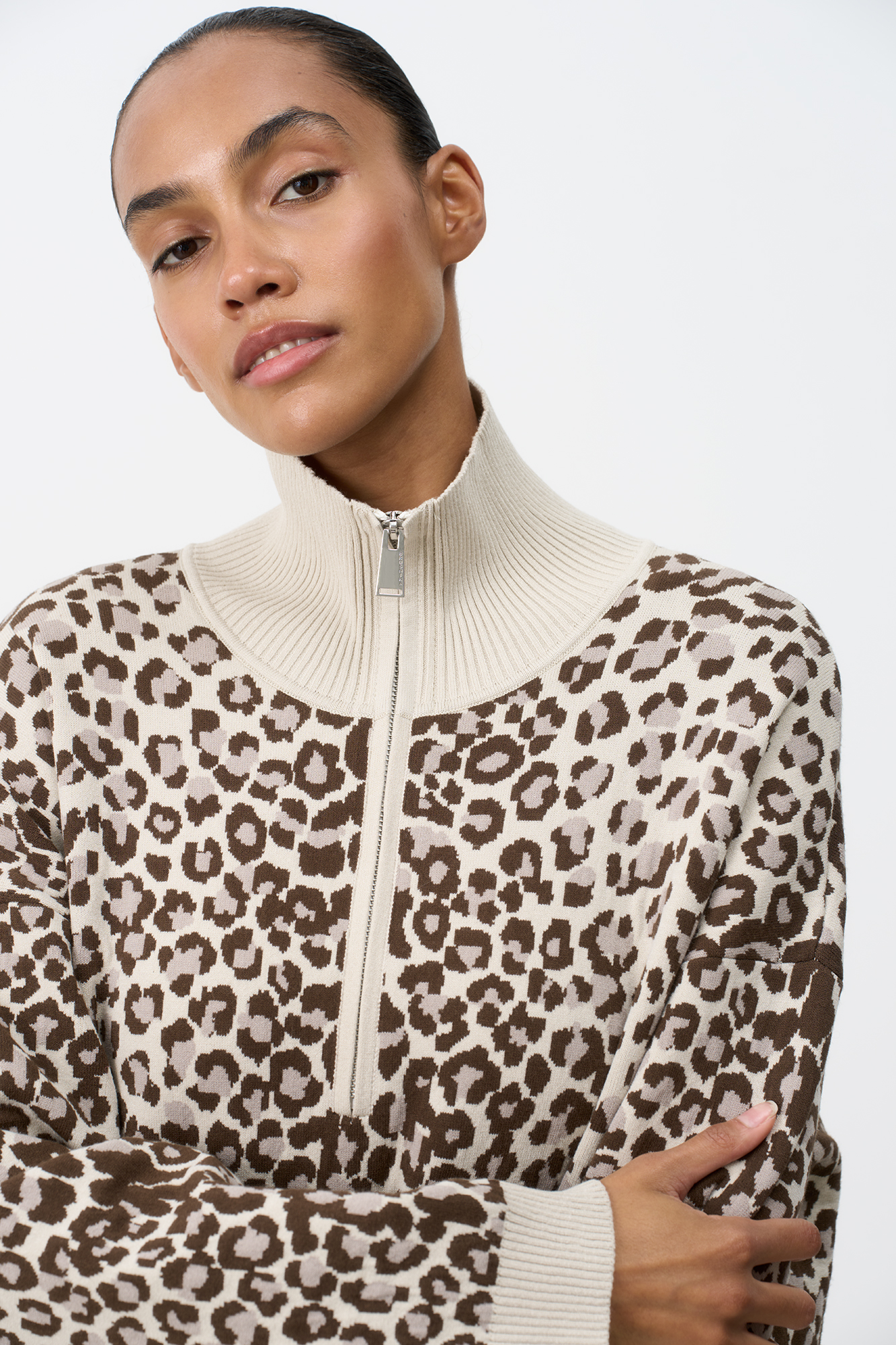 Джемпер с жаккардовым анималистическим дизайном. Модель свободного силуэта с высоким воротом и застежкой на молнию. Боковые карманы. Дополнить образ можно юбкой в таком же стиле.