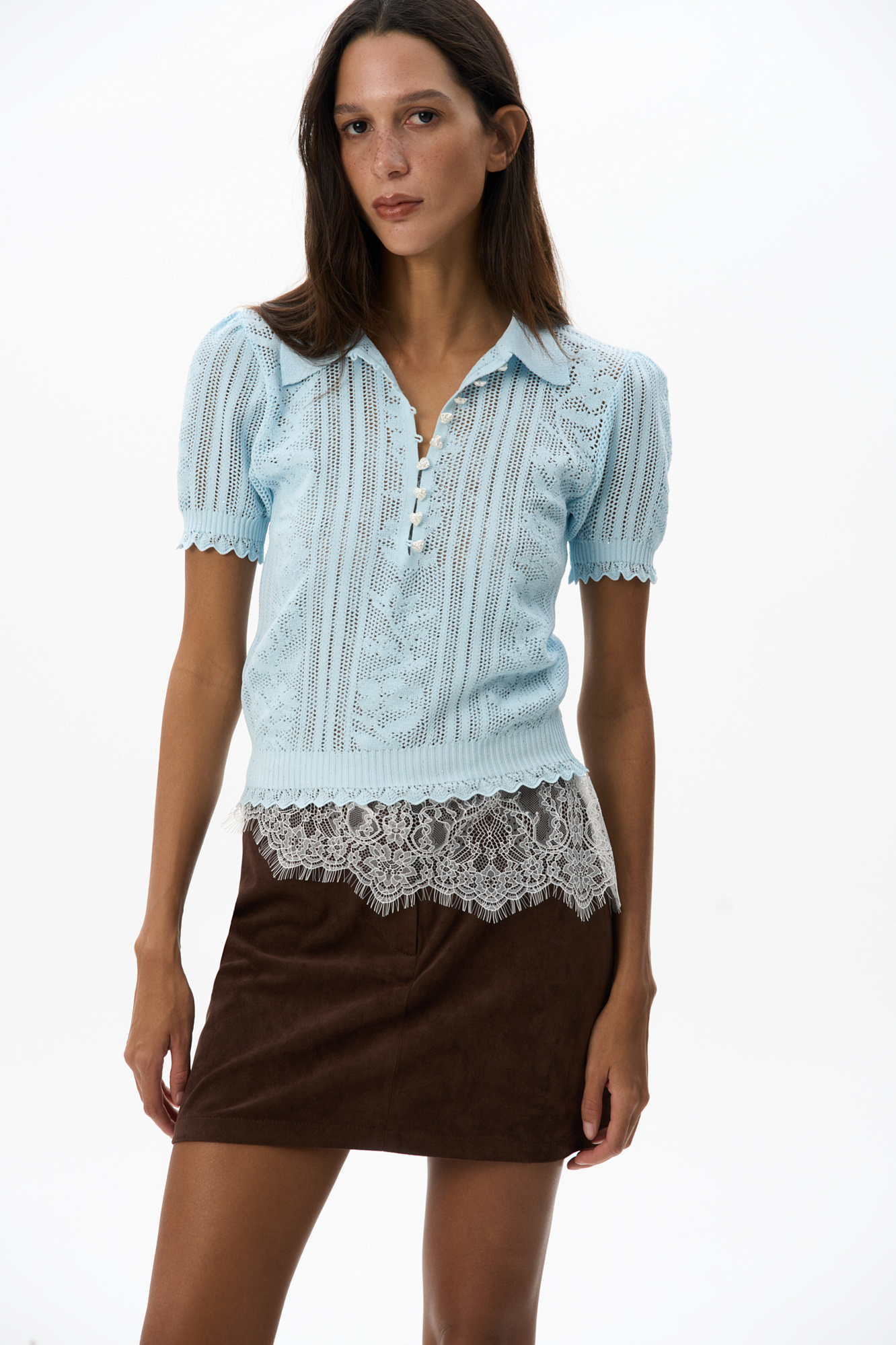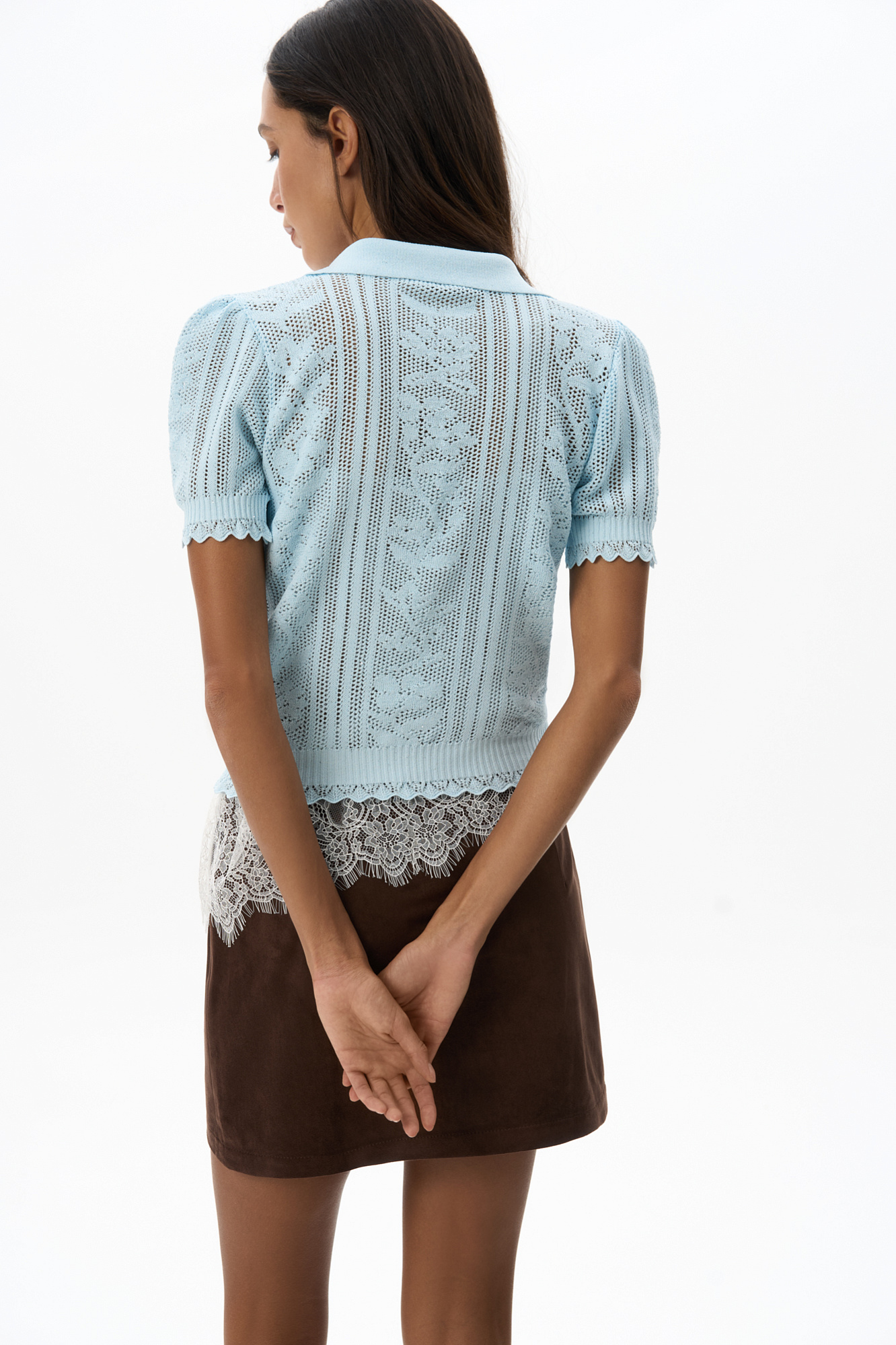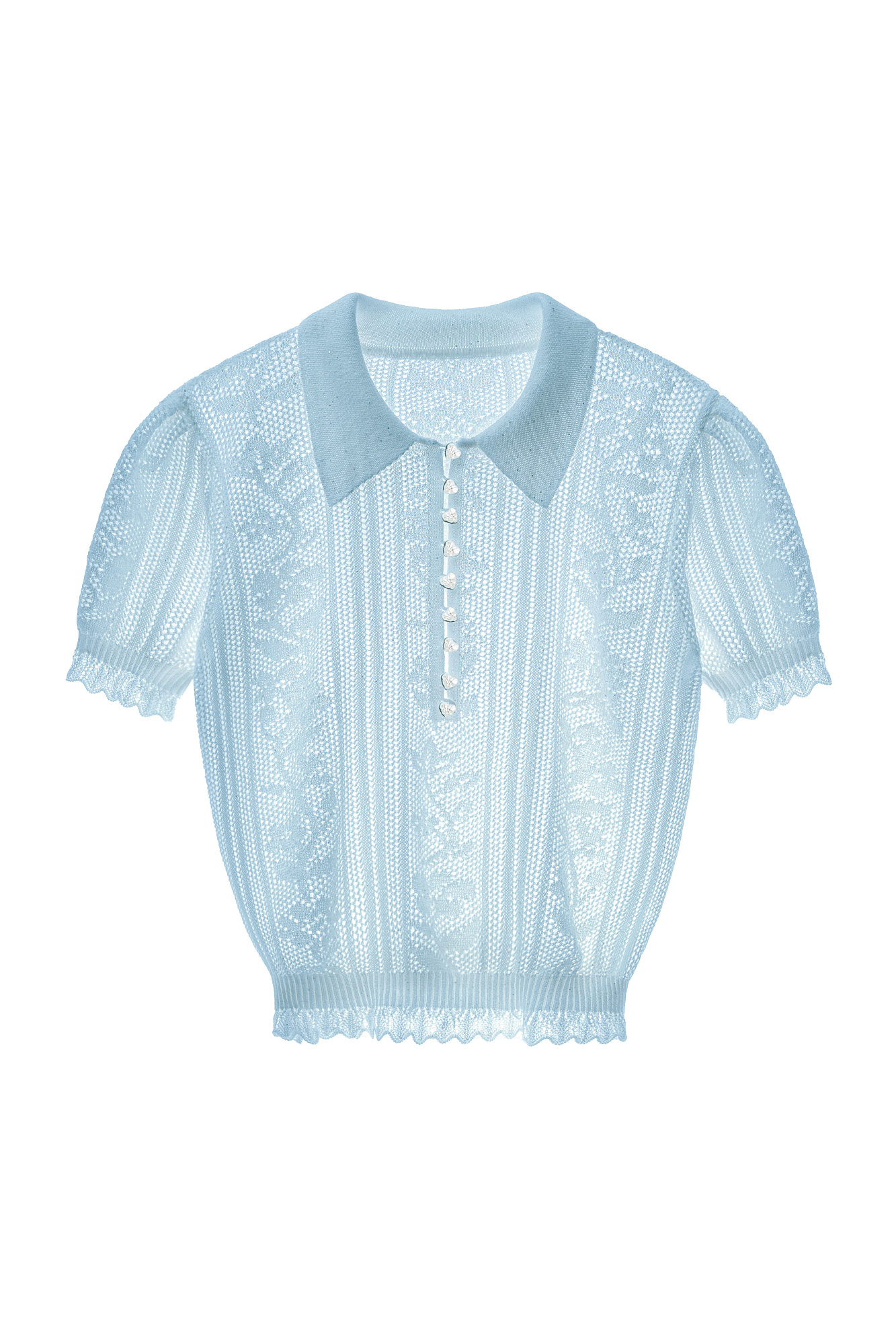 Трикотажная футболка из вискозы с пайетками. Изделие выполнено ажурным переплетением с дизайном в виде растительного орнамента. Модель с воротником поло, планкой на пуговицах-сердечках и коротким рукавом.
