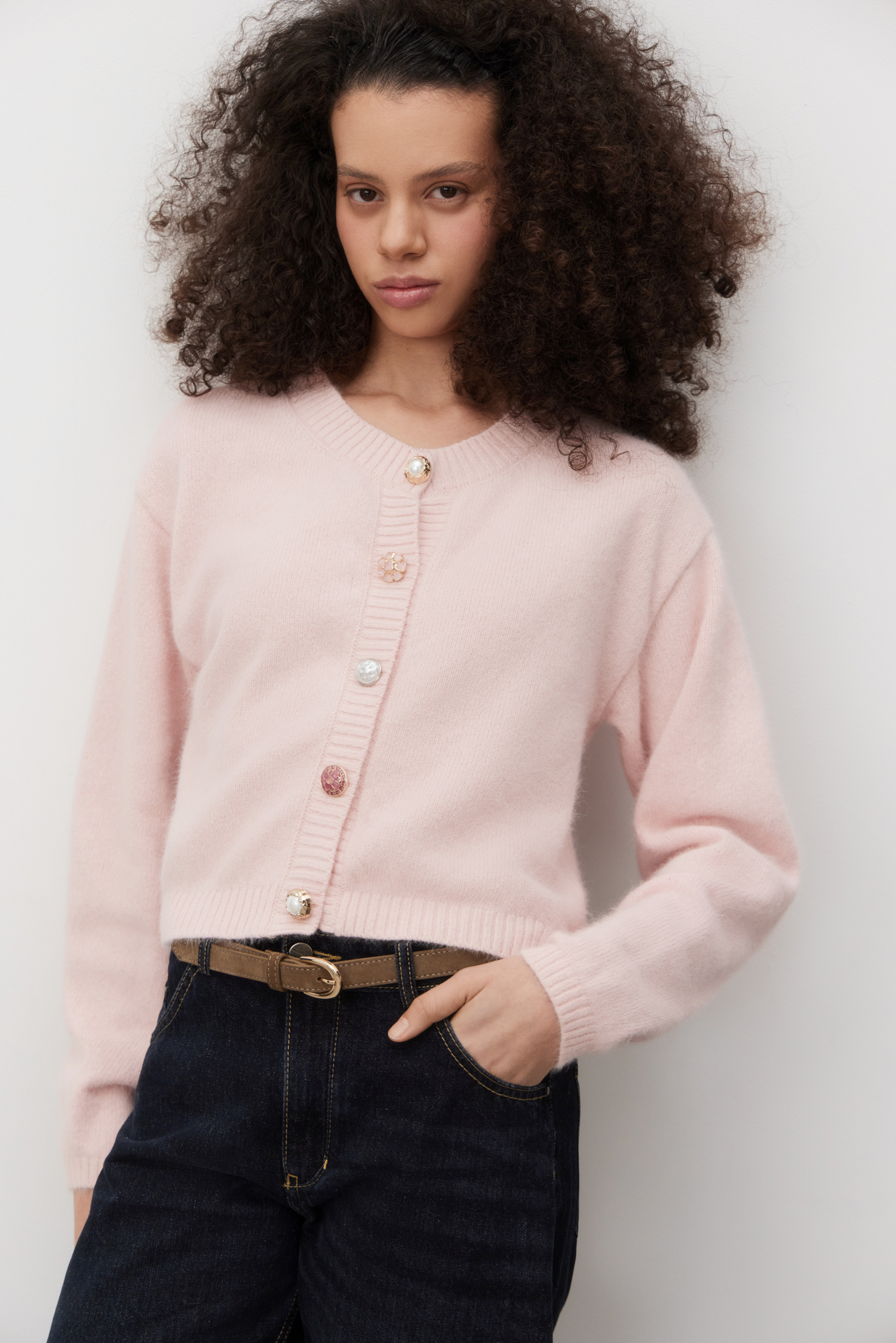 Трикотажный кардиган из пуха лисы. Модель свободного силуэта со спущенной линией плеч и круглым вырезом горловины. Изделие декорировано крупными акцентными пуговицами.