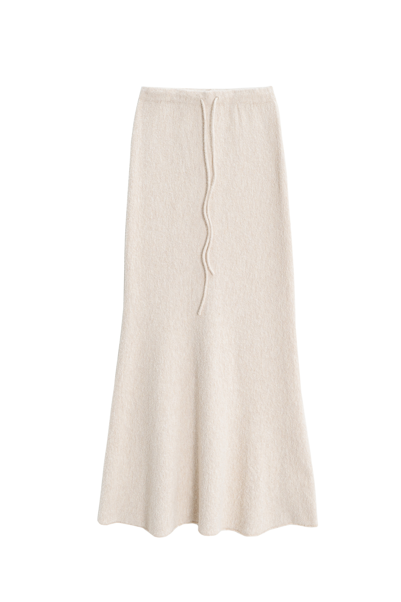 Трикотажная юбка длины макси из буклированной пряжи. Модель по фигуре с расклешенным подолом и поясом, дополненным кулиской. Дополнить образ можно джемпером в таком же стиле.