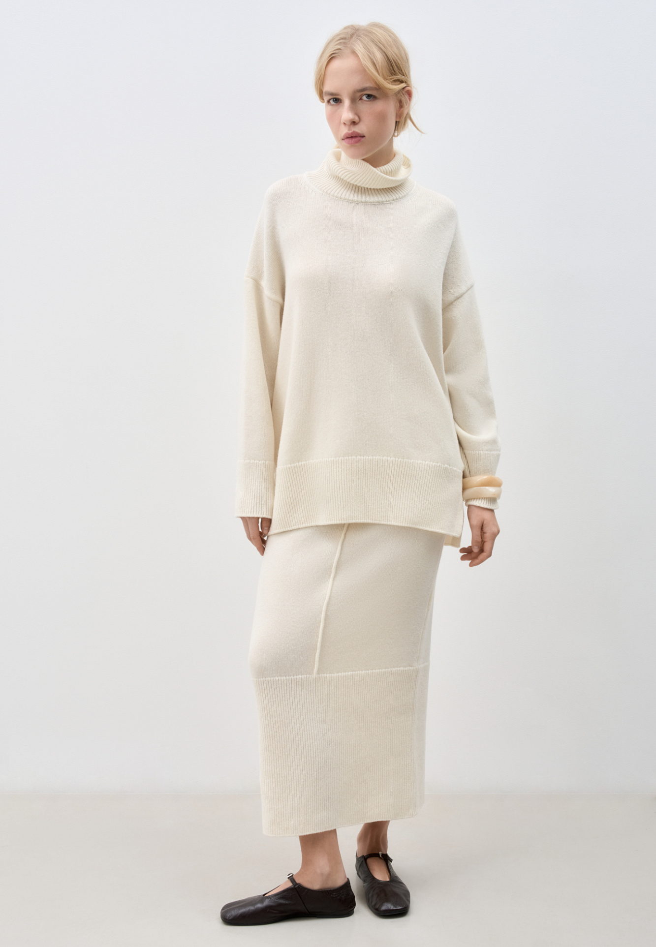 Юбка длины макси из кашемира и шерсти. Модель прямого силуэта, с широким эластичным поясом на кулиске. Изделие декорировано вертикальным валиком и невысоким разрезом сзади.