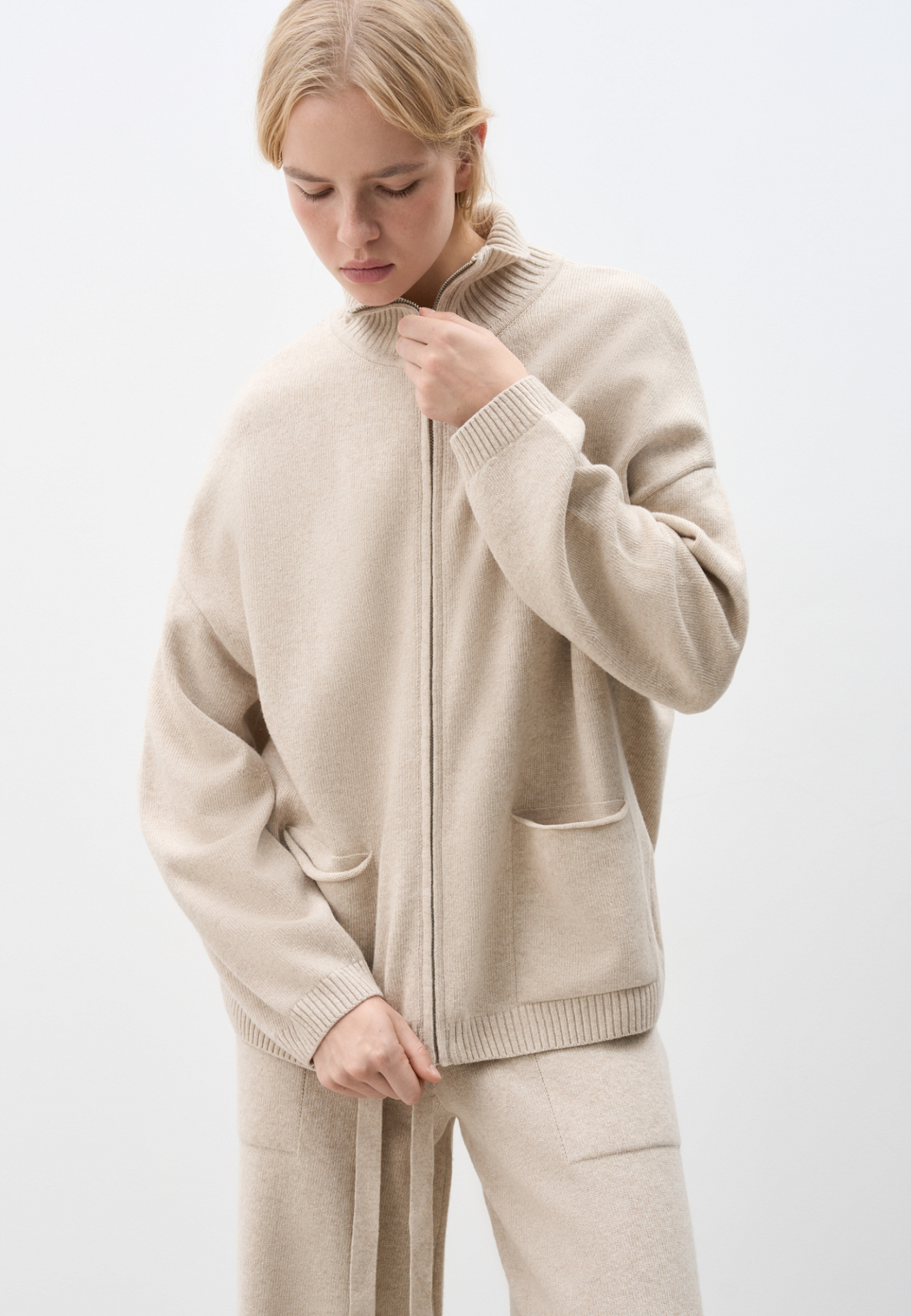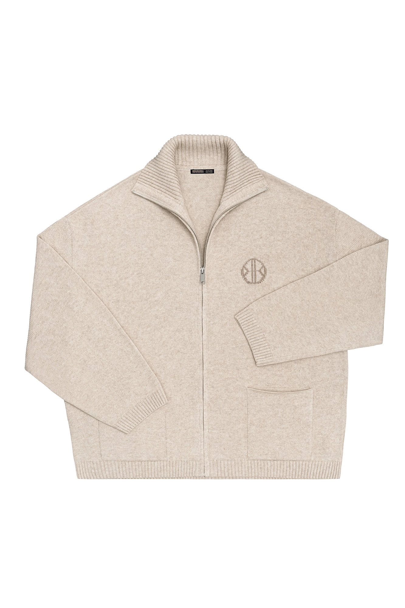 Трикотажный бомбер в спортивном стиле из кашемира и шерсти. Модель свободного силуэта со спущенной линией плеча, накладными карманами и воротником-стойкой. Изделие декорировано вышитым логотипом бренда на груди. Застежка на молнию.
