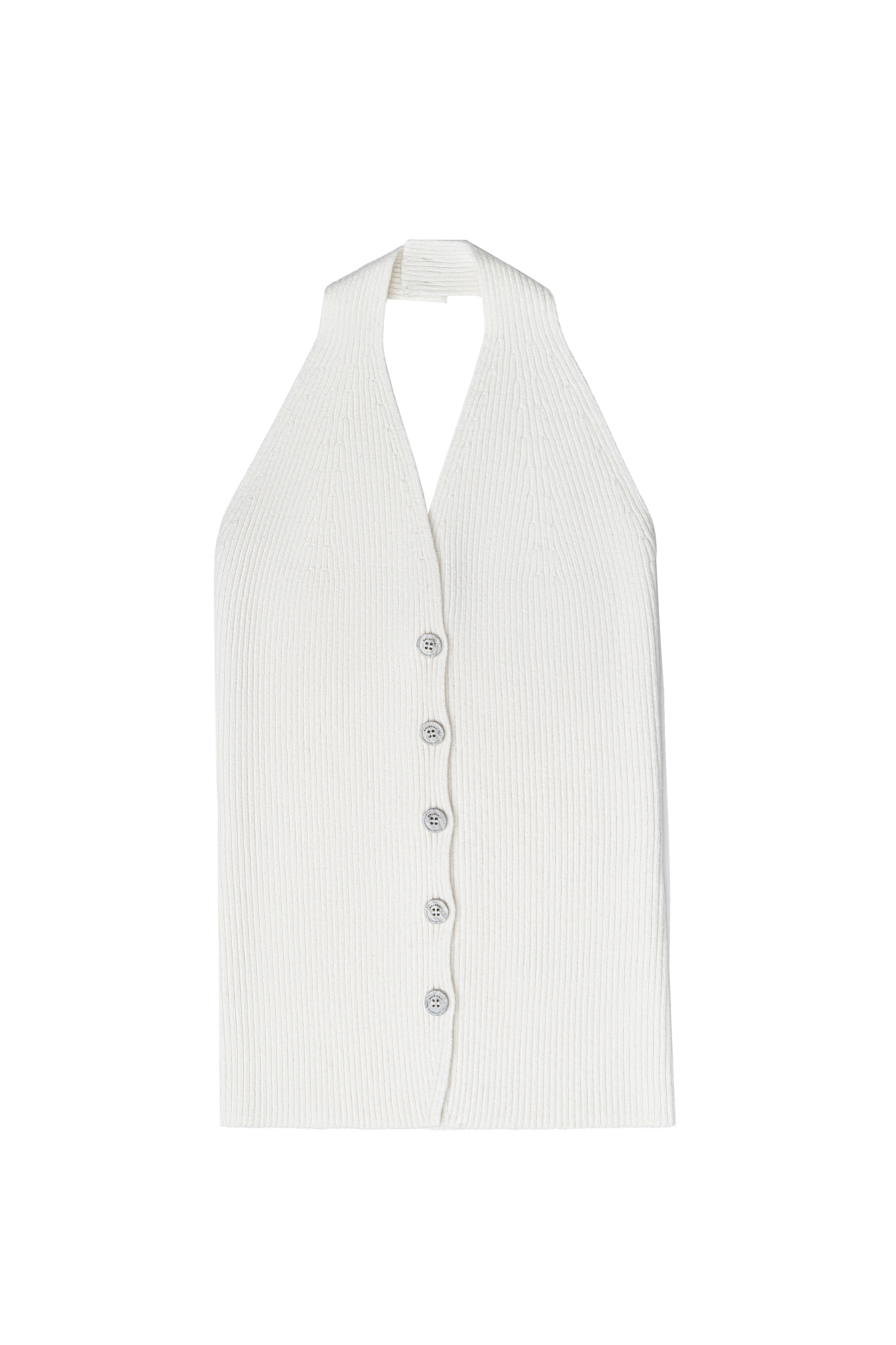 Трикотажный жилет в рубчик из шерсти и кашемира. Модель по фигуре с V-образным вырезом и американской проймой. Застежка на пуговицы.