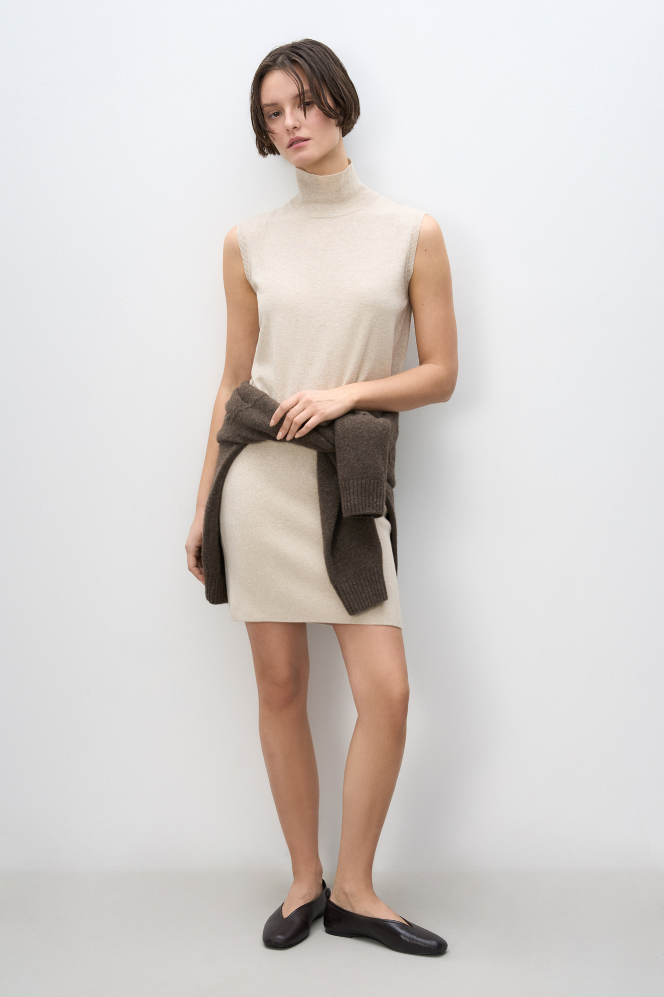 Трикотажный жилет из кашемира и шерсти. Модель без рукавов с воротником-стойкой, выполненным в тонкий рубчик.