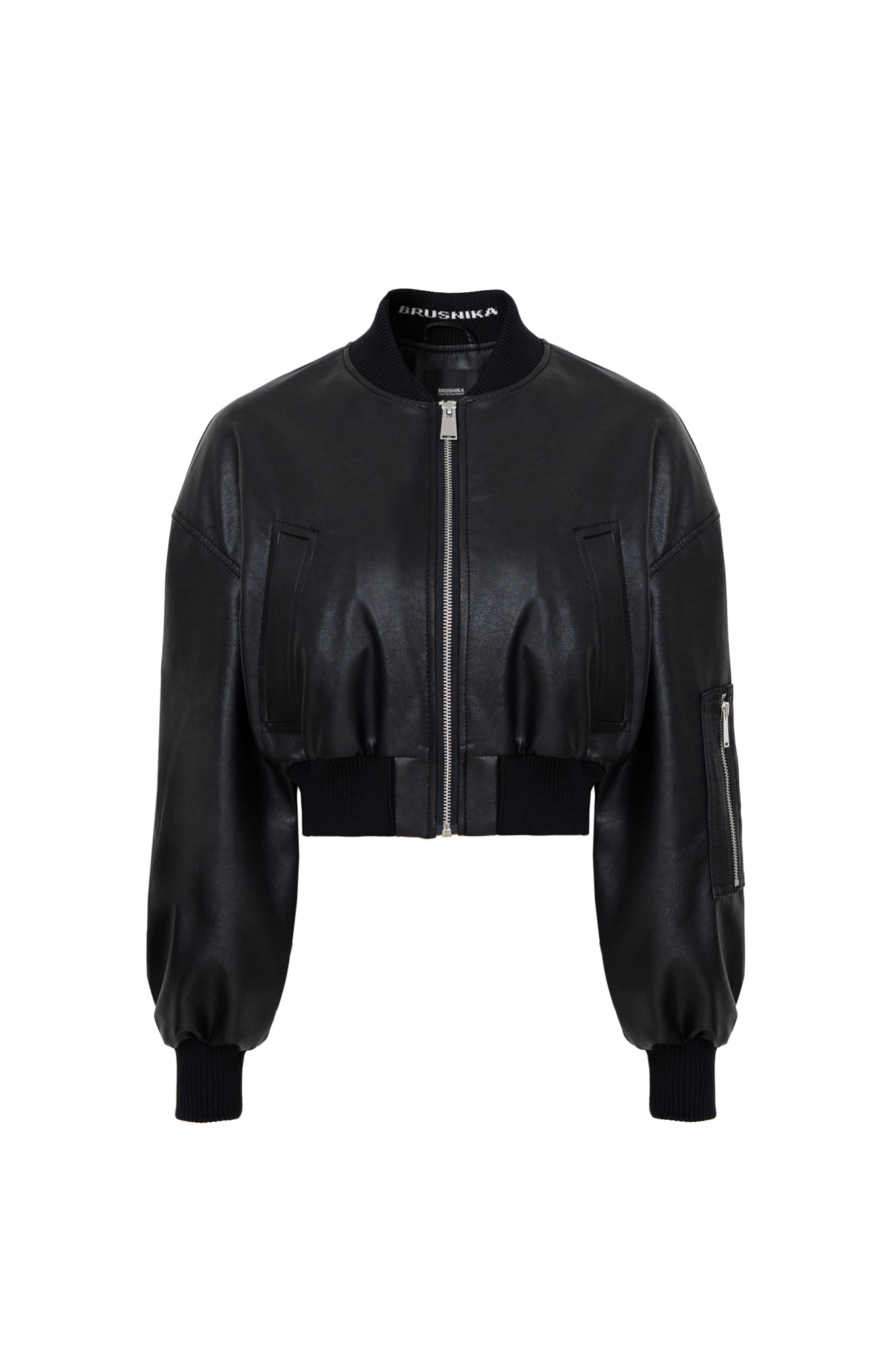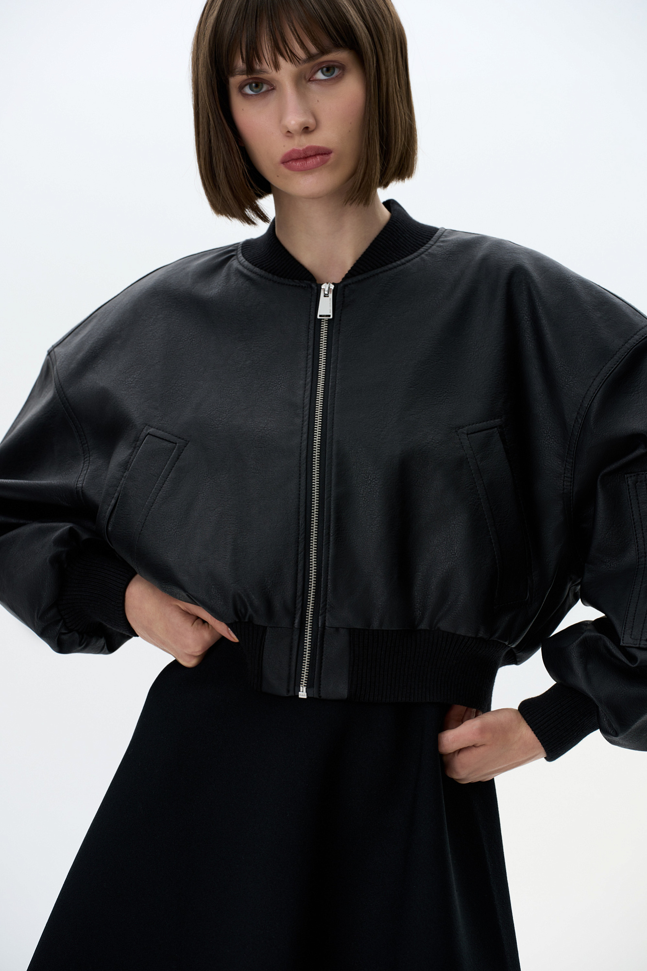 Укороченный бомбер из экокожи. Модель свободного силуэта со спущенным рукавом и накладным карманом на рукаве. Манжеты и низ изделия на резинке. Застежка на молнию.
